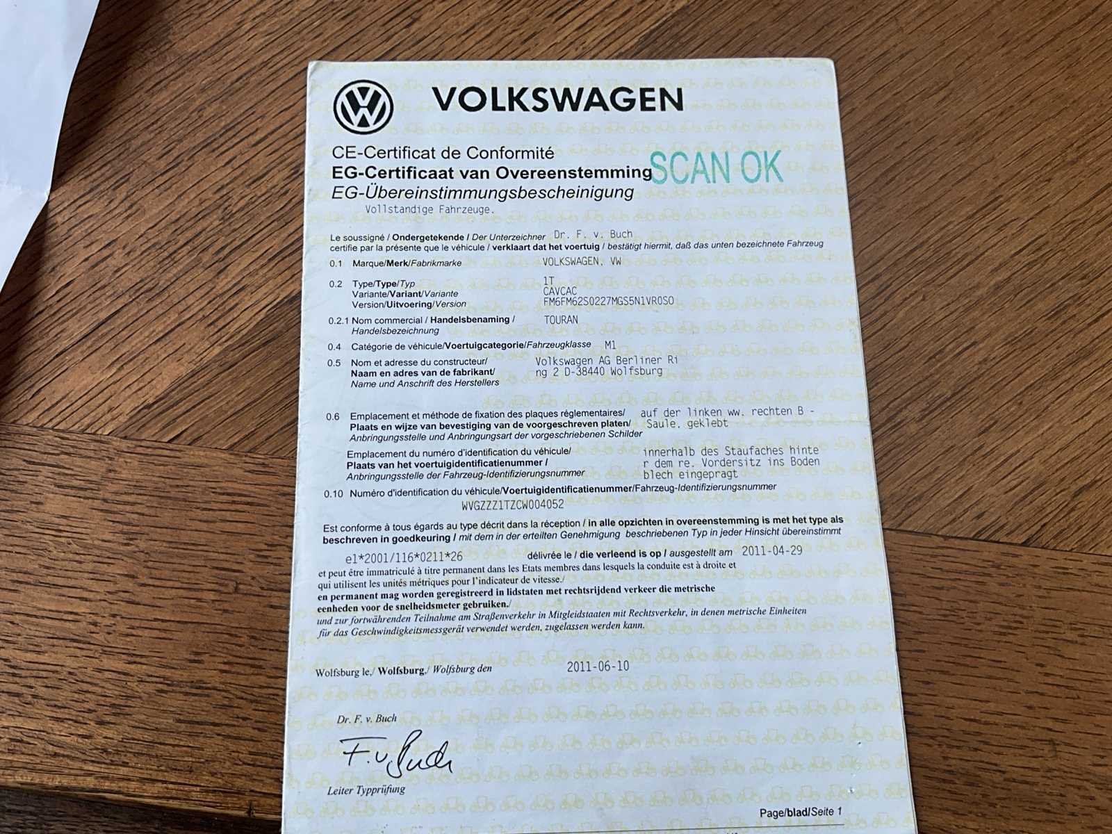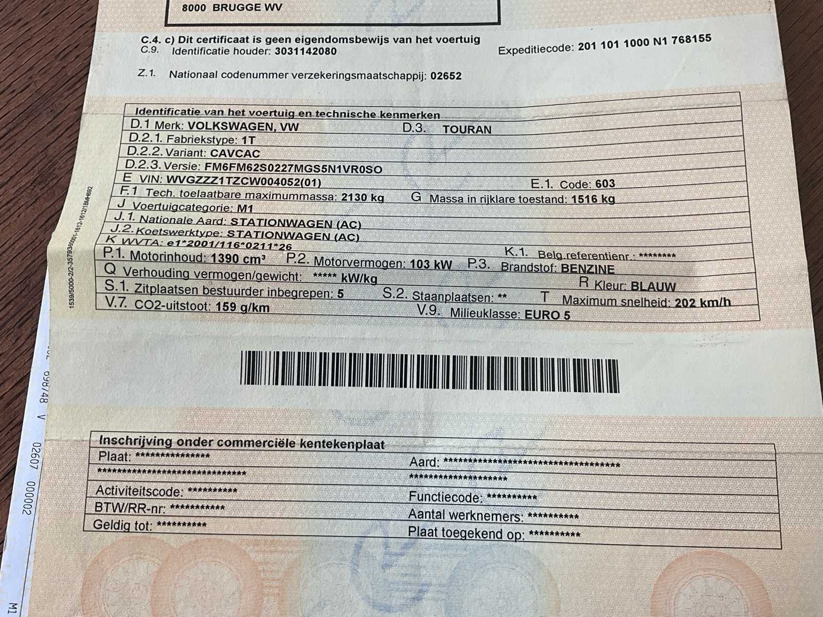 No Merk: Volkswagen VW Model: Touran Bouwjaar: 2011 Brandstof: Benzine Chassisnummer: 4052