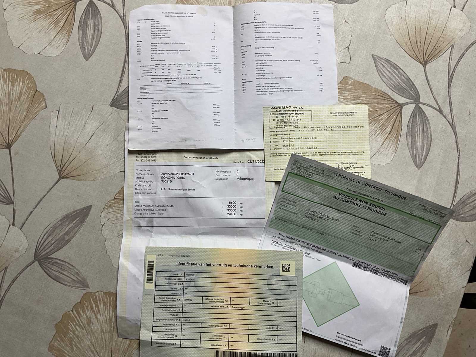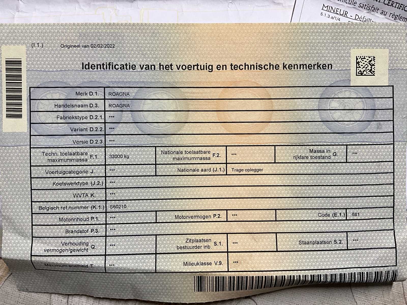 No Merk: ROAGNA Type: R26ITS Bouwjaar: 2002 Chassisnummer: ZA9R26ITS20F88125 Aantal assen: 3 Ledig gewicht: 8600kg Laadvermogen: 24400kg Nationaliteit documenten: BE
