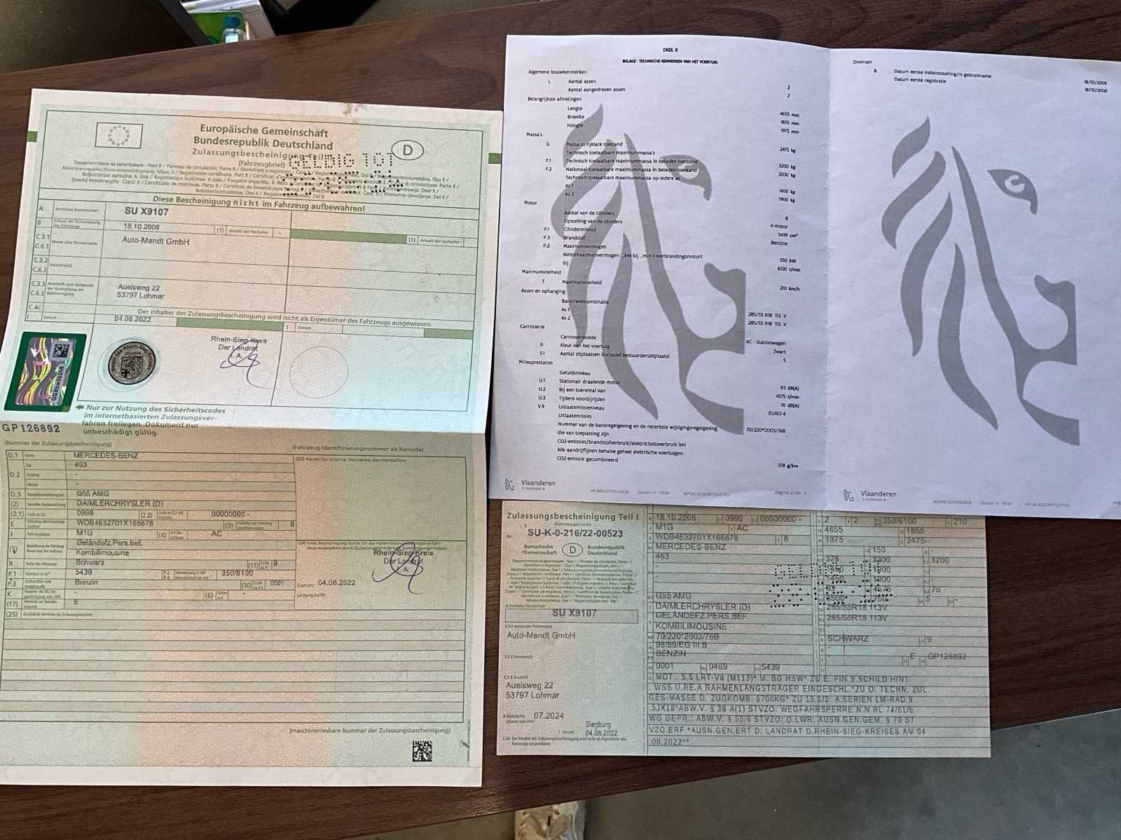 No Merk: Mercedes-Benz Model: G55 AMG Type: V8 Kompressor Bouwjaar: 2006 Afgelezen kilometerstand: 100000km Cilinderinhoud: 5439cc Vermogen (kW): 350kW Brandstof: Benzine Chassisnummer: WDB4632701X66878 Laadvermogen: 725kg Datum eerste toelating: 18/10/2006 Aantal zitplaatsen: 5 Transmissie: Automaat Aantal deuren: 5 Aantal sleutels: 2 Ledig gewicht: 2475kg Nationaliteit documenten: DE Gelijkvormigheidsattest aanwezig: true Carpass: true Start en rijdt: JA Zichtbare schade: Neen Inschrijvingsbewijs - deel 1 : Aanwezig Inschrijvingsbewijs - deel 2: Aanwezig