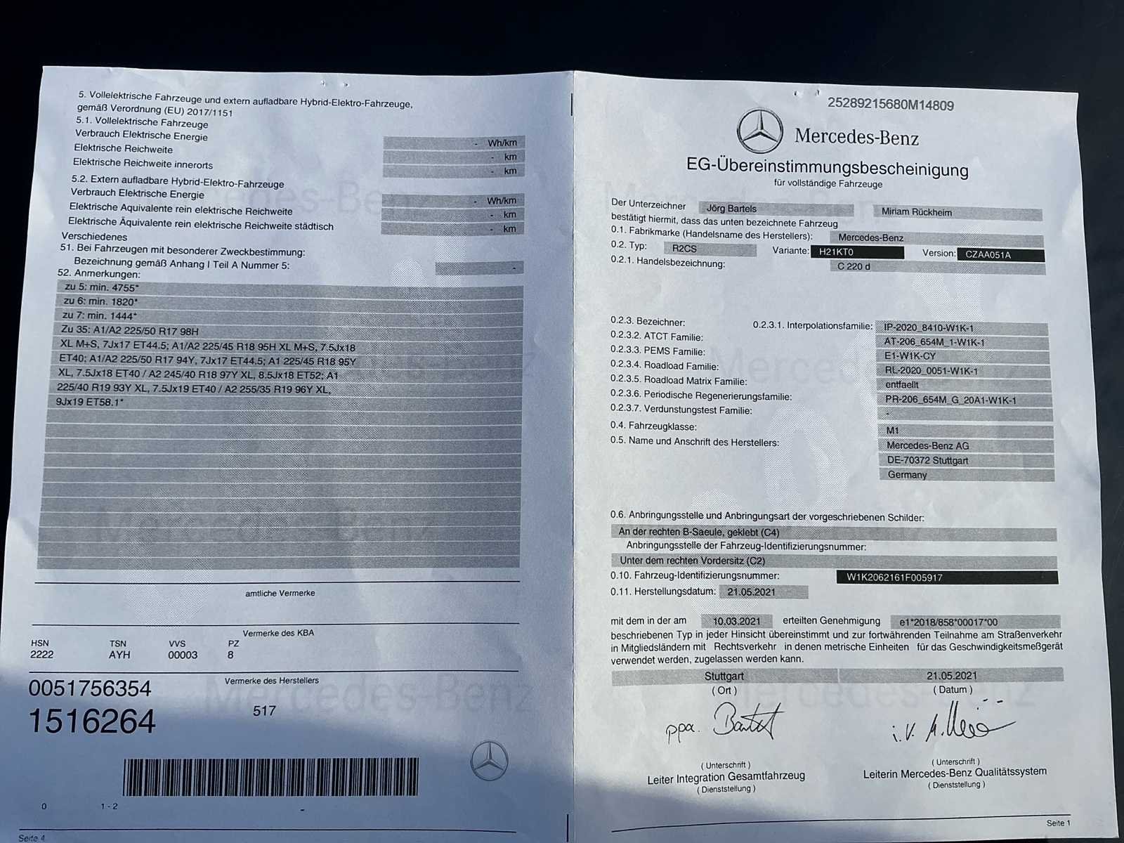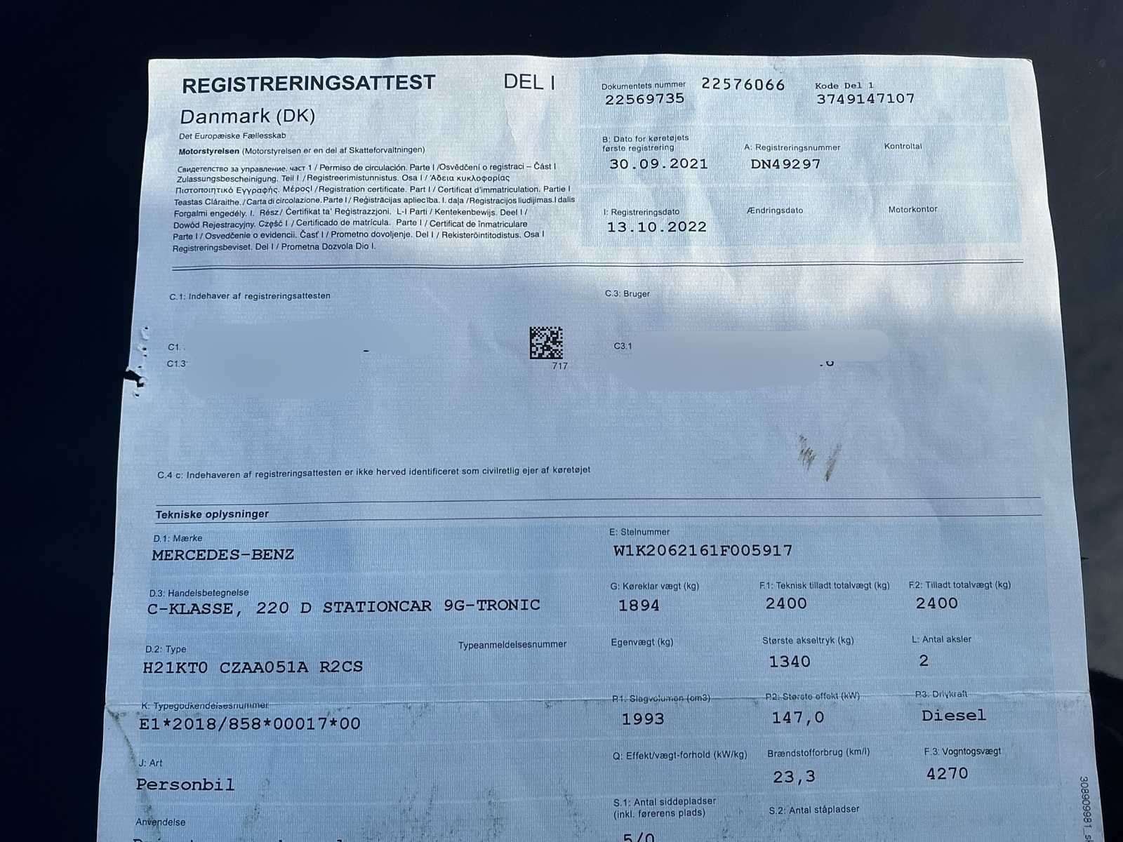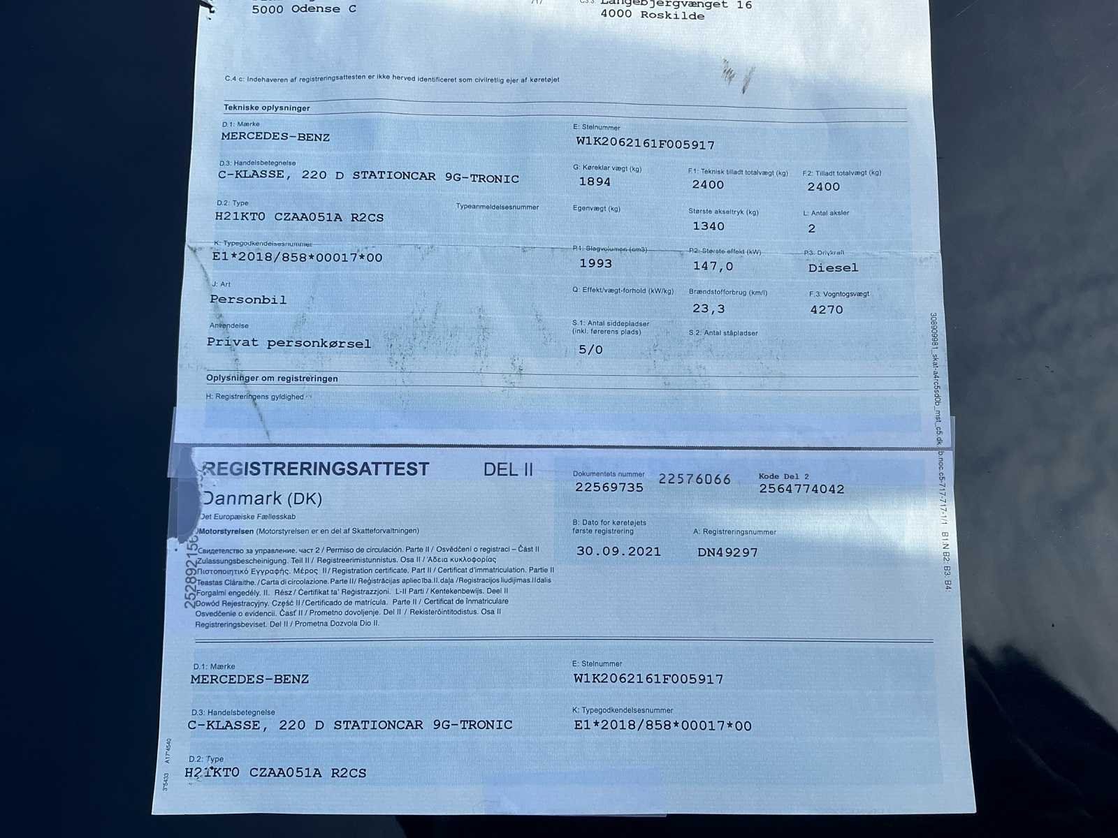 E705 aanwezig. AMG pakket. C220. 200PK. Verwarmde zetels. Achteruitrijcamera. Keyless go. Dode hoek aanduiding. Geen schade. No Merk: Mercedes-Benz Model: C-Klasse 220 d 9G-TRONIC Bouwjaar: 2021 Afgelezen kilometerstand: 181261km Cilinderinhoud: 1993cc Vermogen (kW): 147kW Brandstof: Diesel Chassisnummer: W1K2062161F005917 Datum eerste toelating: 30/09/2021 Aantal zitplaatsen: 5 Kleur: Blauw Transmissie: Automaat Emissieklasse: Euro 6 Aantal deuren: 5 Nationaliteit documenten: Denemarken Gelijkvormigheidsattest aanwezig: true Start en rijdt: Ja Vavato voert geen technische keuring uit.: true Airconditioning: true Navigatie: true LED-koplampen: true Leder bekleed: true Inschrijvingsbewijs - deel 1 : Ja Inschrijvingsbewijs - deel 2: Ja