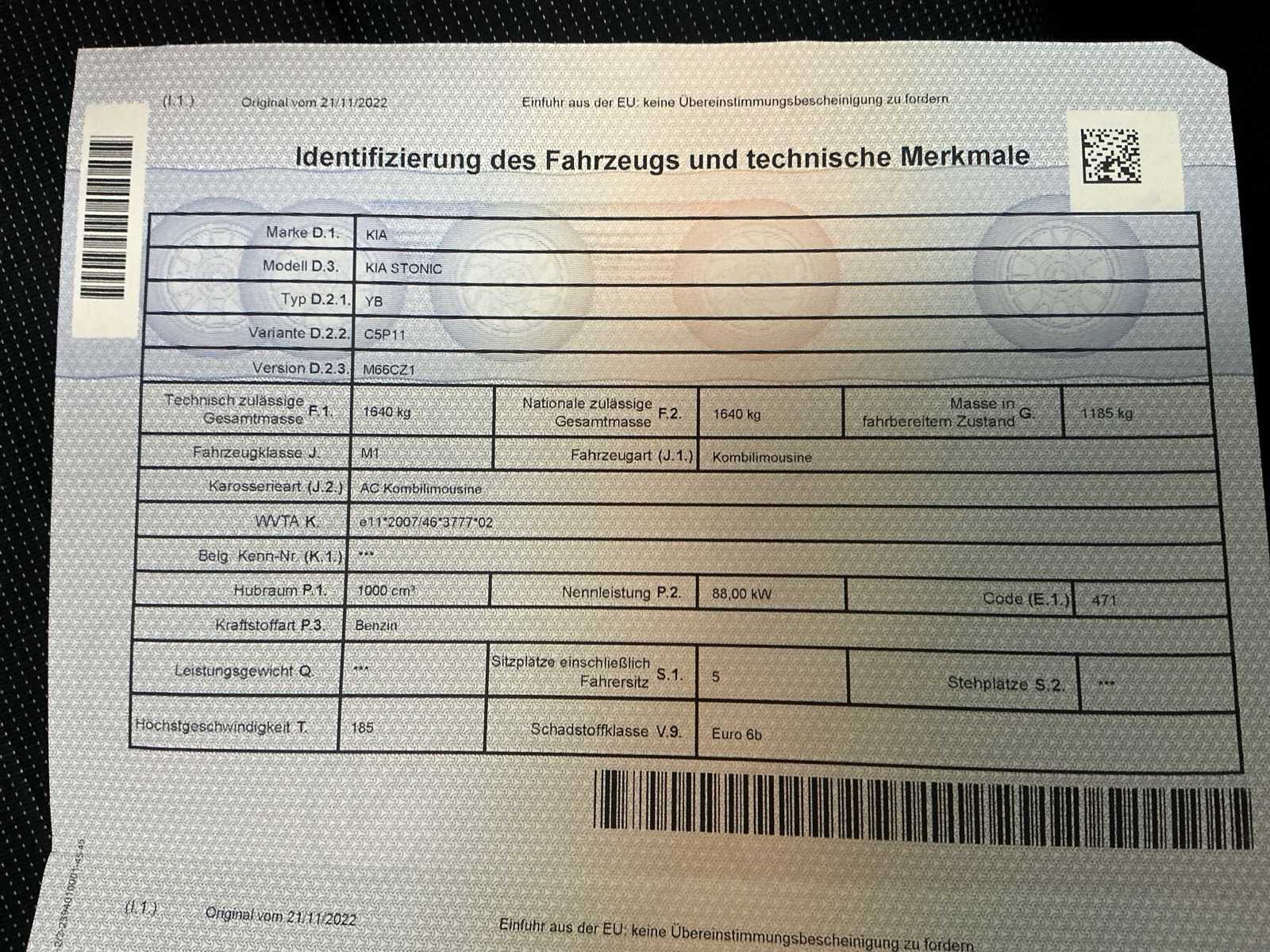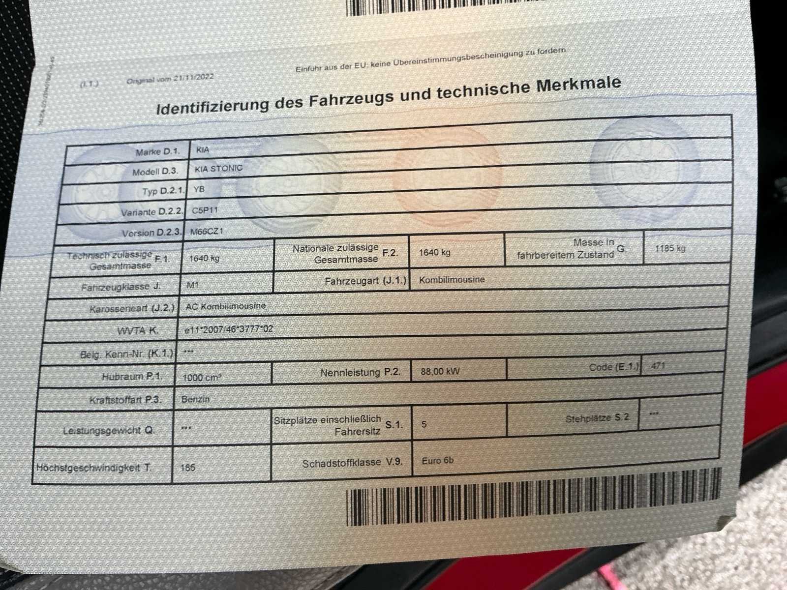 Kia Stonic met 1.0 T-GDi benzinemotor (88 kW) en manuele versnellingsbak. Eerste inschrijving 17/08/2018. Kilometerstand ca. 165.278 km (afgelezen). Emissieklasse Euro 6b. Belgische inschrijvingsdocumenten aanwezig. Het voertuig vertoont normale gebruikssporen overeenkomstig leeftijd en kilometerstand. No Merk: Kia Model: Stonic Bouwjaar: 2018 Afgelezen kilometerstand: 165278km Cilinderinhoud: 998cc Vermogen (kW): 88kW Brandstof: Benzine Chassisnummer: KNAD6811AJ6189302 Datum eerste toelating: 17/08/2018 Kleur: Rood Transmissie: Manueel Emissieklasse: Euro 6b Nationaliteit documenten: België Start en rijdt: Ja startinformatie : Start, rijdt en remt Vavato voert geen technische keuring uit.: true Inschrijvingsbewijs - deel 1 : Ja Inschrijvingsbewijs - deel 2: Ja