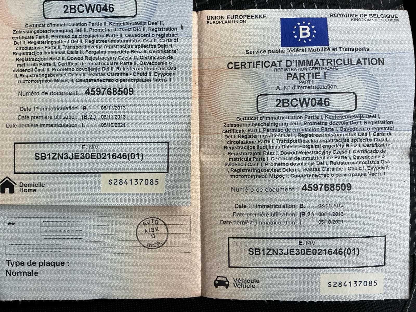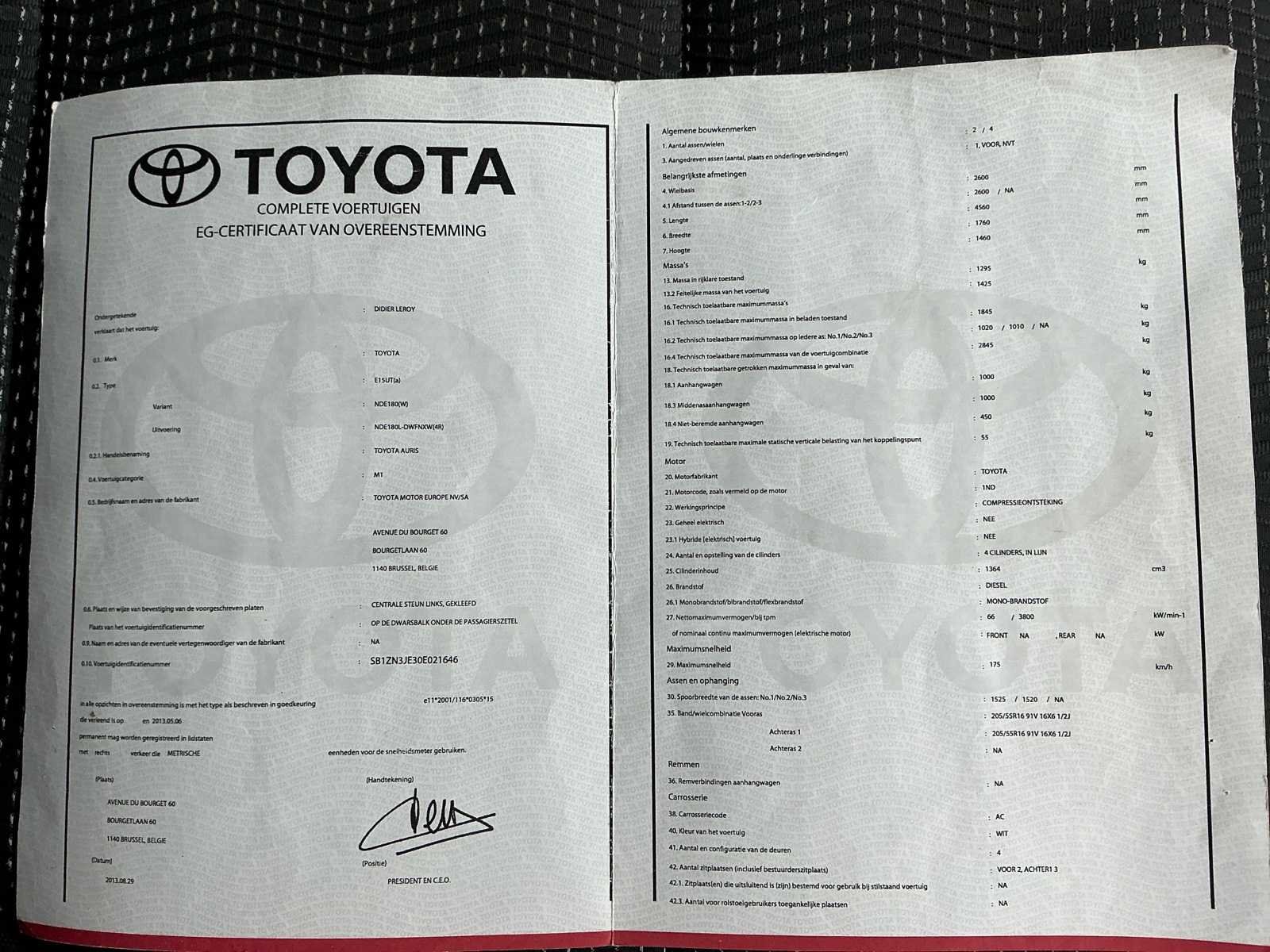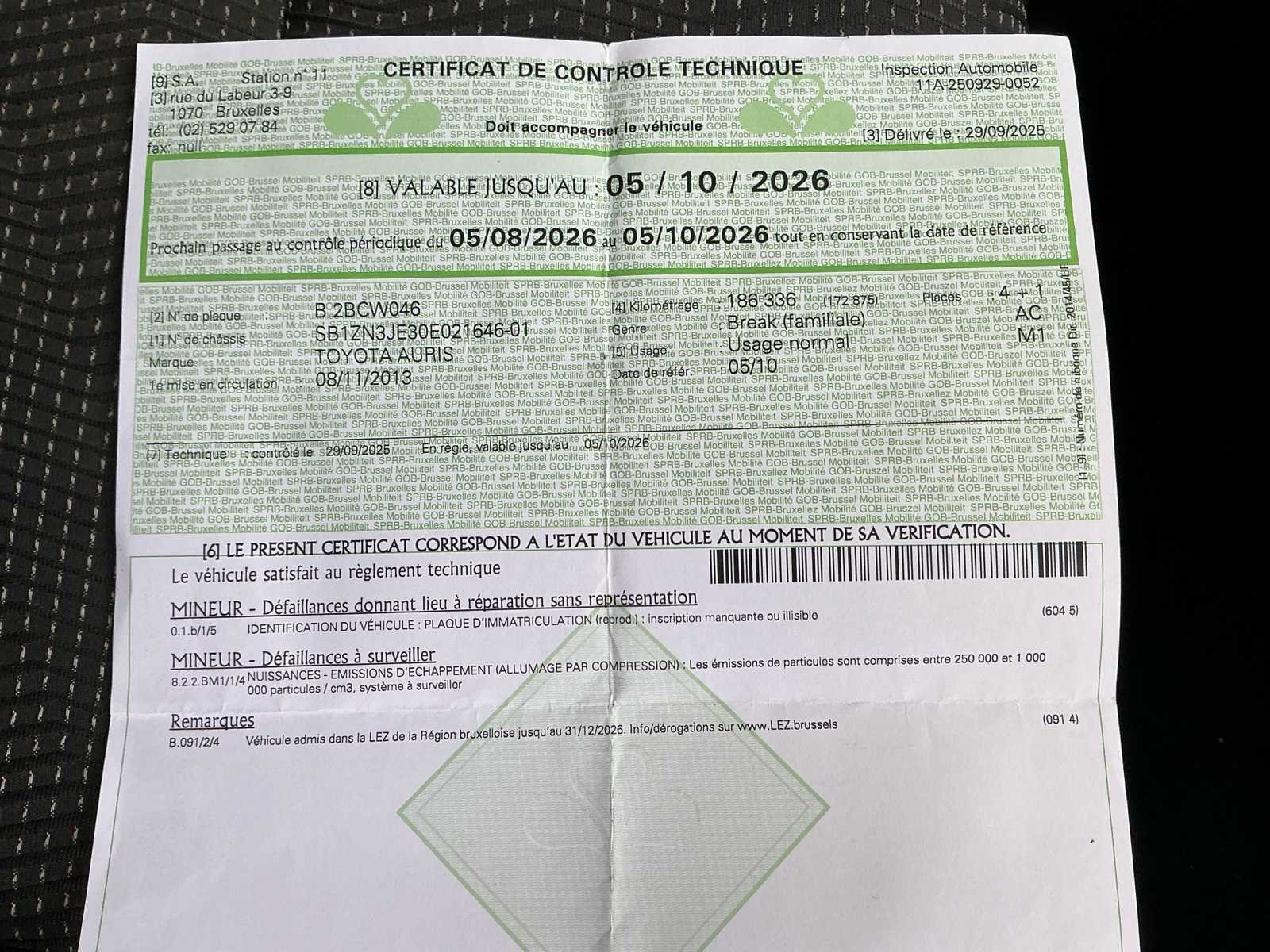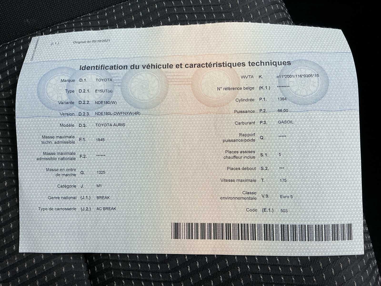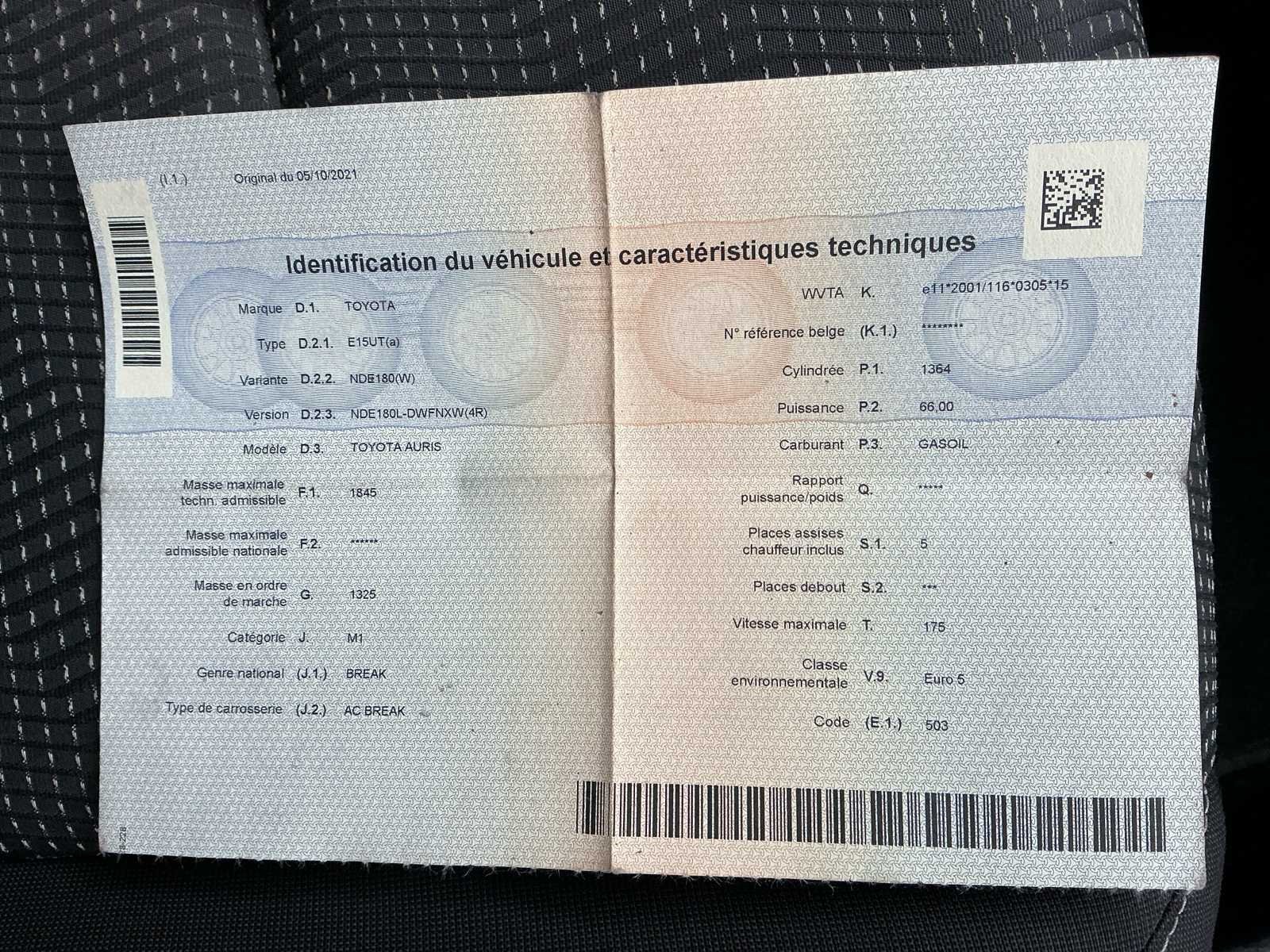 Toyota Auris break met 1.4 D-4D dieselmotor (66 kW) en manuele versnellingsbak. Eerste inschrijving 08/11/2013. Kilometerstand ca. 189.788 km (afgelezen). Emissieklasse Euro 5. Belgische inschrijvingsdocumenten deel I en II aanwezig. Het voertuig vertoont gebruikssporen en zichtbare carrosserieschade/roest. No Merk: Toyota Model: Auris Bouwjaar: 2013 Afgelezen kilometerstand: 189788km Cilinderinhoud: 1364cc Vermogen (kW): 66kW Brandstof: Diesel Chassisnummer: SB1ZN3JE30E021646 Datum eerste toelating: 08/11/2013 Aantal zitplaatsen: 5 Transmissie: Manueel Emissieklasse: Euro 5 Nationaliteit documenten: België Gelijkvormigheidsattest aanwezig: true Start en rijdt: Ja startinformatie : Start, rijdt en remt Vavato voert geen technische keuring uit.: true Inschrijvingsbewijs - deel 1 : Ja Inschrijvingsbewijs - deel 2: Ja
