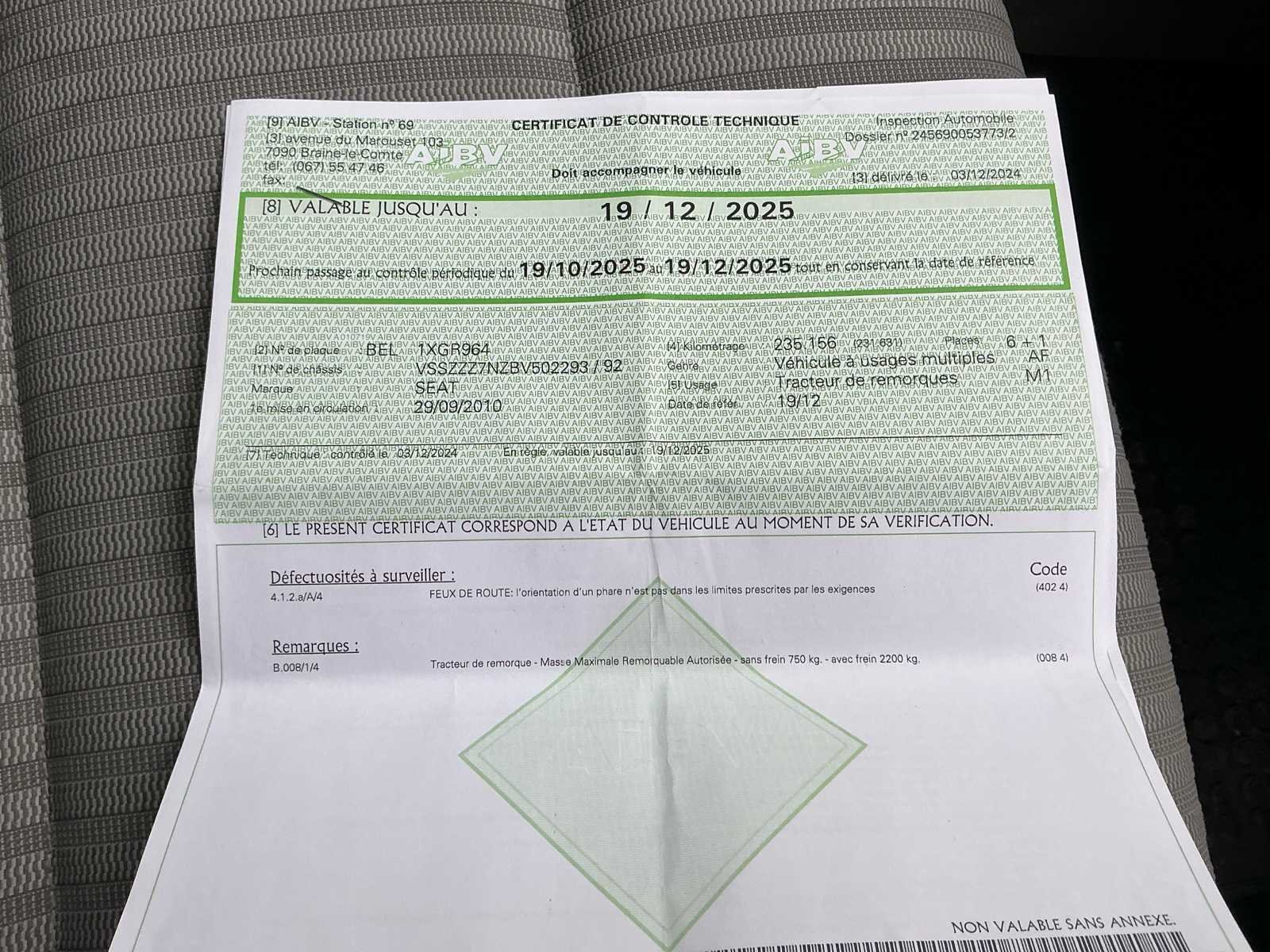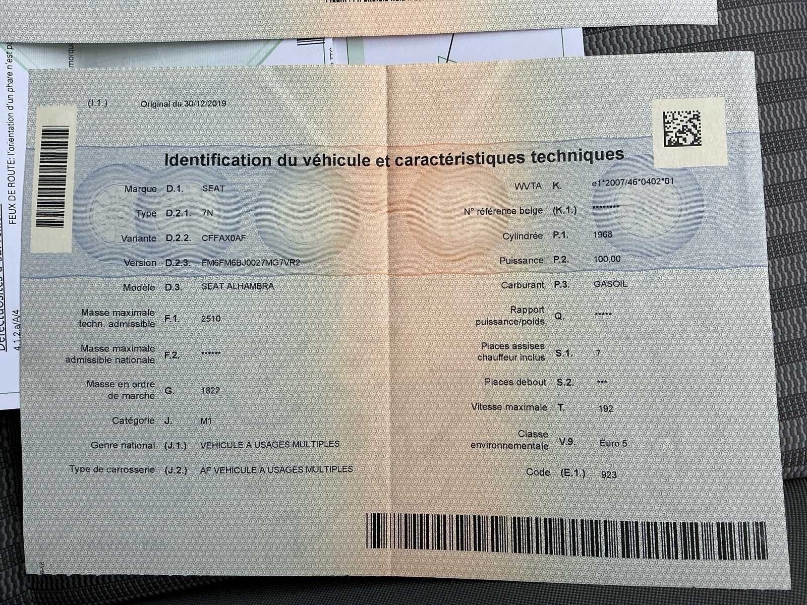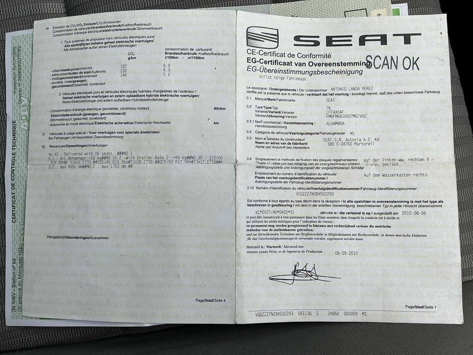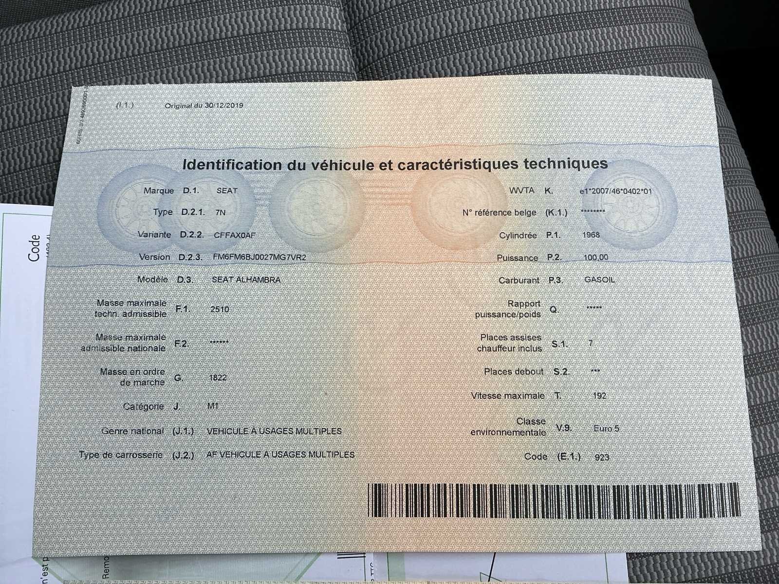 SEAT Alhambra monovolume met 2.0 TDI dieselmotor (100 kW) en manuele transmissie. Eerste inschrijving 29/09/2010. Voorzien van 7 zitplaatsen. Kilometerstand ca. 240.748 km (afgelezen). Emissieklasse Euro 5. Belgische inschrijvingsdocumenten deel I en II aanwezig. Normale gebruikssporen overeenkomstig leeftijd en kilometerstand. No Merk: Seat Model: Alhambra Bouwjaar: 2010 Afgelezen kilometerstand: 240748km Cilinderinhoud: 1968cc Vermogen (kW): 100kW Brandstof: Diesel Chassisnummer: VSSZZZ7NZBV502293 Datum eerste toelating: 29/09/2010 Aantal zitplaatsen: 7 Kleur: Zwart Transmissie: Manueel Emissieklasse: Euro 5 Nationaliteit documenten: België Start en rijdt: Ja startinformatie : Start, rijdt en remt Vavato voert geen technische keuring uit.: true Inschrijvingsbewijs - deel 1 : Ja Inschrijvingsbewijs - deel 2: Ja