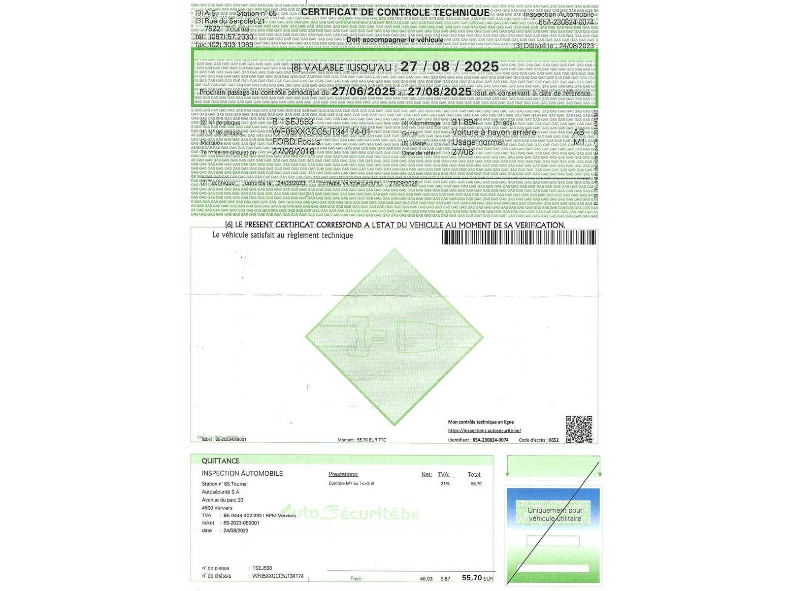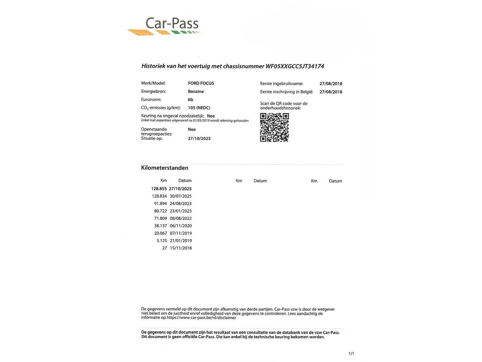 Nee Merk: Ford Model: Focus Bouwjaar: 2018 Afgelezen kilometerstand: 128855km Cilinderinhoud: 999cc Vermogen (kW): 74kW Brandstof: Benzine Chassisnummer: WF05XXGCC5JT34174 Datum eerste toelating: 27/08/2018 Aandrijving: Voorwiel Aantal zitplaatsen: 5 Maximaal trekgewicht ongeremd: 635kg Maximaal trekgewicht geremd: 1000kg Kleur: Beige Transmissie: Manueel Emissieklasse: Euro 6B Aantal deuren: 5 Aantal sleutels: 2 Aantal cilinders: 3 Nationaliteit documenten: BE Gelijkvormigheidsattest aanwezig: true Start en rijdt: Ja Keuringsrapport geldig tot: 27/08/2025 Self drive export possible : true Vavato voert geen technische keuring uit.: true Inschrijvingsbewijs - deel 1 : JA Inschrijvingsbewijs - deel 2: Ja