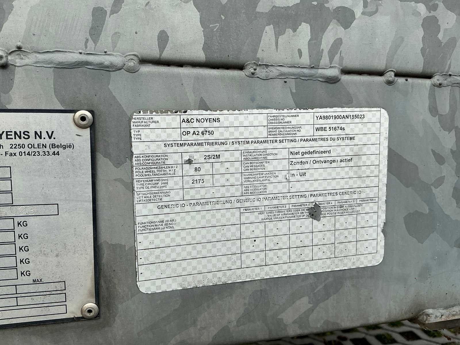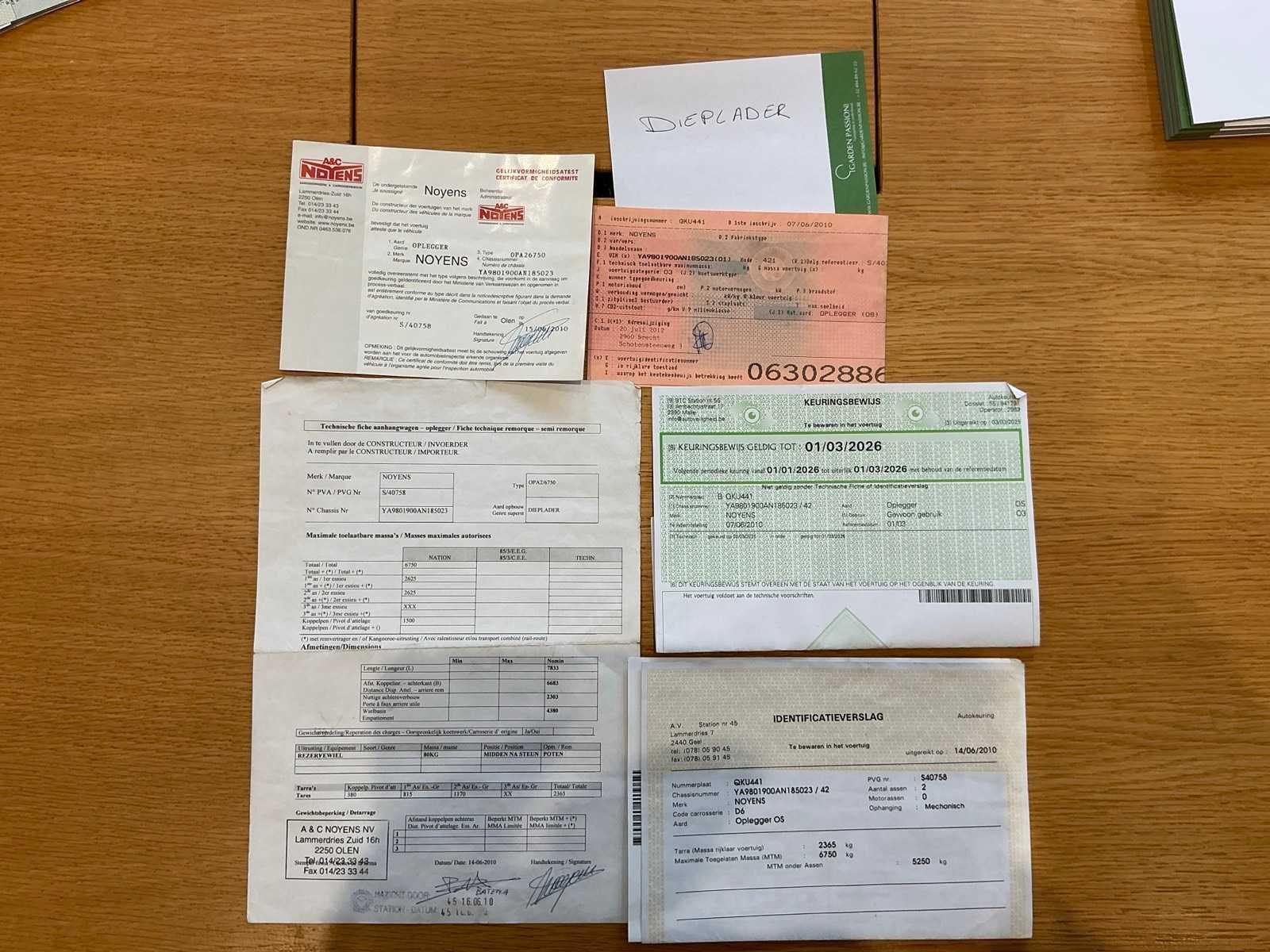 Dieplader met rijplaten No Merk: NOYENS Type: OP A2 6750 Model: S40758 Bouwjaar: 2010 Chassisnummer: YA9801900AN135023 Laadvermogen: 6750kg Eigen gewicht: 2625kg Aantal assen: 2 Datum eerste toelating: 14/06/2010