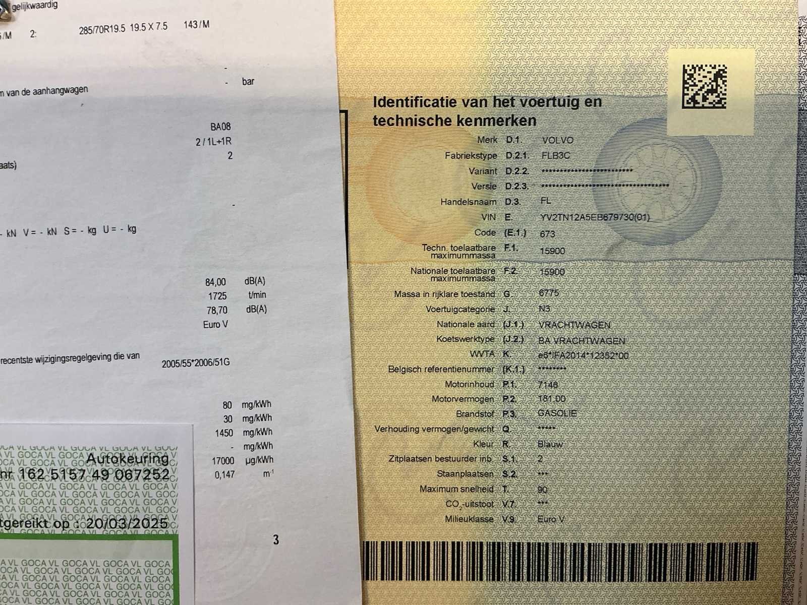 Beide opleggers inbegrepen No Merk: Volvo Type: 240 FL Bouwjaar: 2014 Chassisnummer VIN: YV2TN12A5EB679730 Cilinderinhoud: 7146cc Kilometerstand bij opname: 395000km Aantal assen: 3 Aantal sleutels: 2 Emissieklasse: Euro 5 Hydraulische laadklep: true Gesloten opbouw: true Eigen gewicht: 6775kg Startinformatie: Start en rijdt Nationaliteit documenten: Belgische Aantal zitplaatsen: 2 Handgeschakelde versnellingsbak: true Diesel: true
