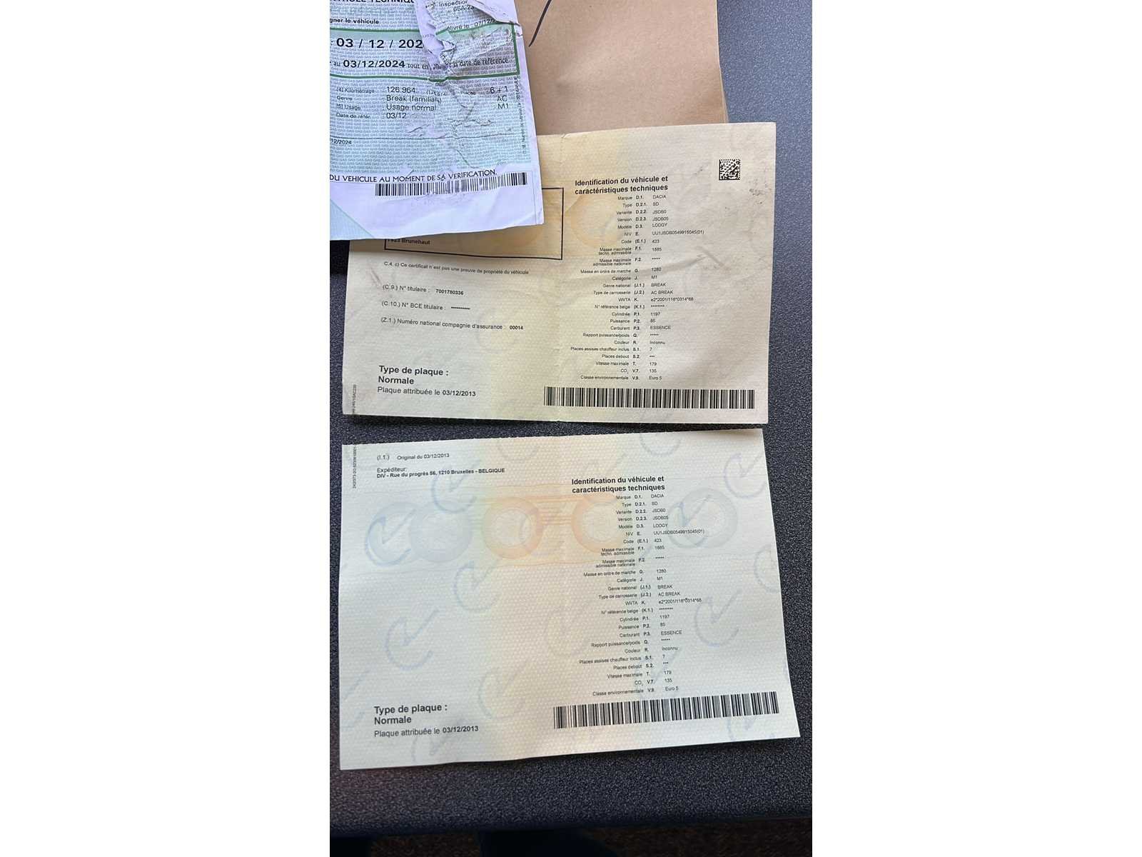 Dacia Lodgy 7-zitter, benzine Technische kenmerken Merk: Dacia Model: Lodgy Carrosserie: Stationwagen / MPV Brandstof: Benzine Milieunorm: Euro 5 Motor: 1.2 TCe Cilinderinhoud: 1,197 cm³ Vermogen: 85 pk (63 kW) Versnellingsbak: Handgeschakeld CO₂: 135 g/km Kleur: Beige 1e inschrijving: 2013-12-03 Kilometerstand: 132,895 km WIJN: UU1JSDB0549915045 Aantal plaatsen: 7 Uitrusting Airconditioning Autoradio Dakdragers Sleepstang Voertuigstaat HS-MOTOR – niet-rijdend voertuig Carrosserie met krassen, botsingen en gebruikssporen (inclusief motorkap en bumpers). Volledig interieur maar vuil, schoonmaak nodig. Non Merk: Dacia Model: Lodgy Type: 1.2 TCE Bouwjaar: 2013 Afgelezen kilometerstand: 132895km Cilinderinhoud: 1197cc Vermogen (kW): 63kW Brandstof: Benzine Chassisnummer: UU1JSDB0549915045 Datum eerste toelating: 2013 Vermogen (pk): 85hp Aandrijving: Links Aantal zitplaatsen: 7 Kleur: Beige Transmissie: Handgeschakeld Aantal deuren: 5 Aantal sleutels: 1 Aantal cilinders: 4 Carrosserie: Stationwagen Nationaliteit documenten: België Gelijkvormigheidsattest aanwezig: waar Start en rijdt: HS-MOTOR startinformatie : HS-MOTOR Vavato voert geen technische keuring uit.: waar Airconditioning: true