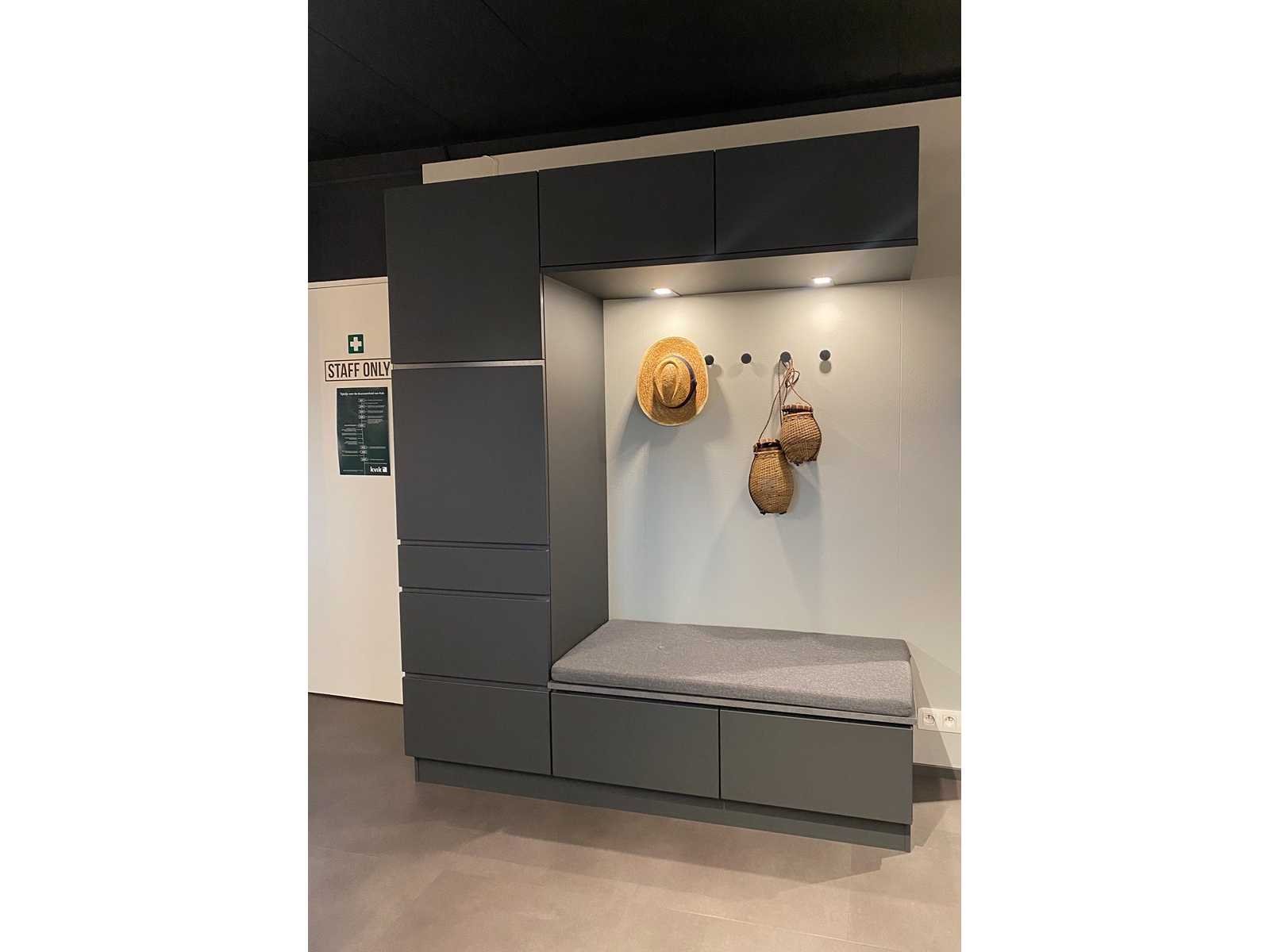 Geniet van praktische opbergruimte met comfort. Inclusief: - Opbergmeubel met bezemkast, twee laden en twee hangkasten + twee LED-spots - Zitgedeelte met werkblad (Hoogte: 46cm): Laminaat Light Mika 2cm dikte en zitkussen No Merk: Kvik Model: Mano grey Product type: Opberg/zitmeubel Kleur: Dark grey Lengte: 180.5cm Hoogte: 220cm Diepte: 59cm Materiaal: Kvik foliedeuren