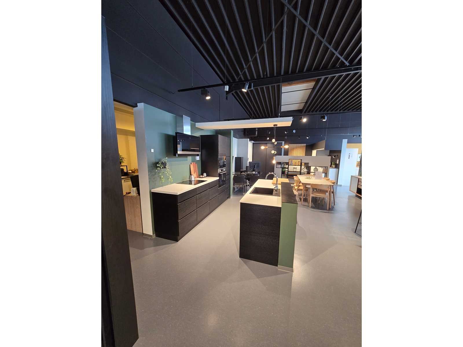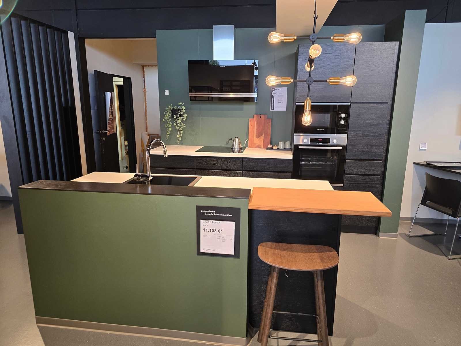 Hoogwaardige keuken in fineer en massief hout voor het CIMA-gedeelte. Verkocht met een composietstenen werkblad Momenteel gedemonteerd in de winkel van Gosselies. Hij wordt verkocht met zijn elektro(zie foto) Non