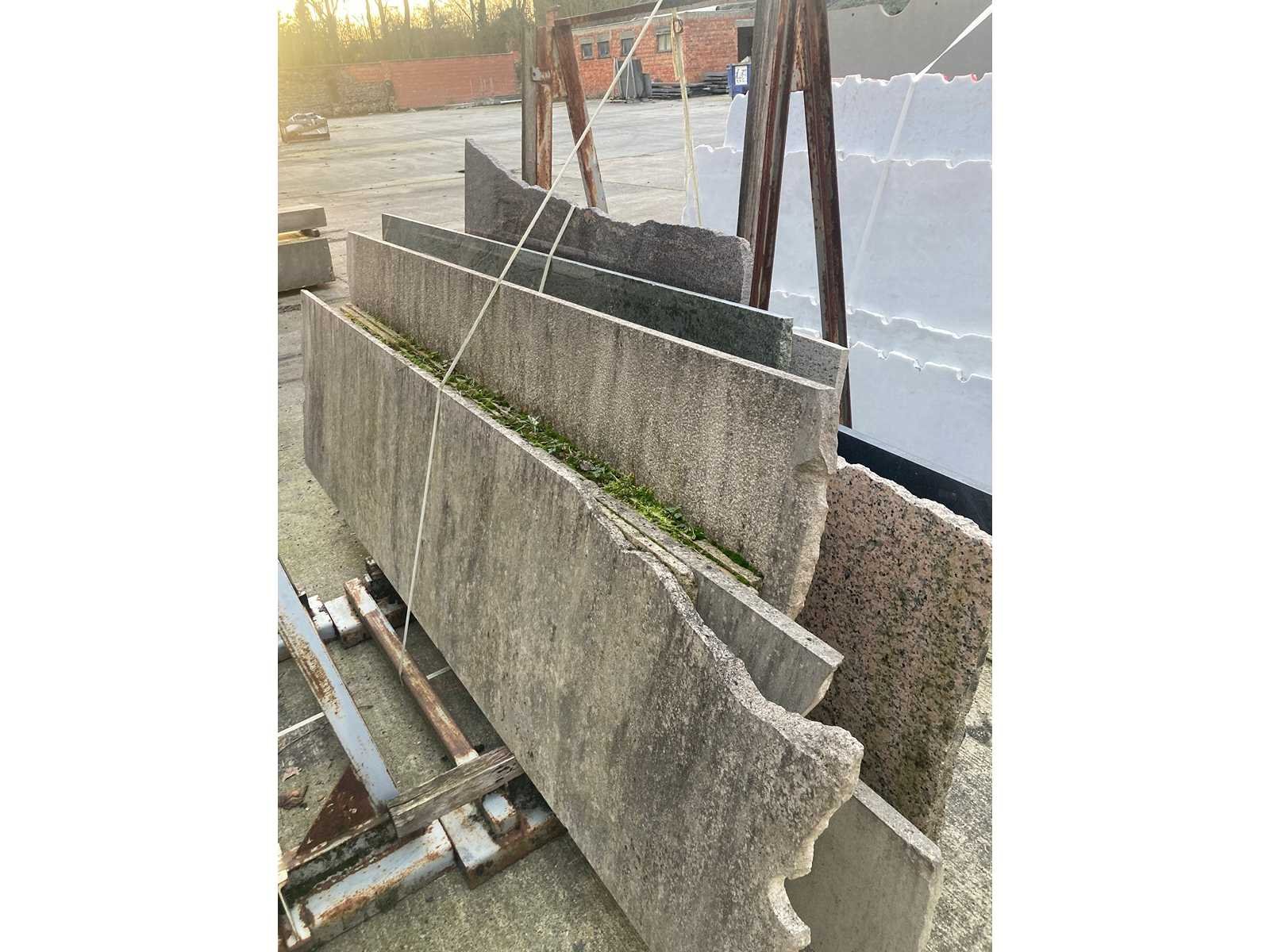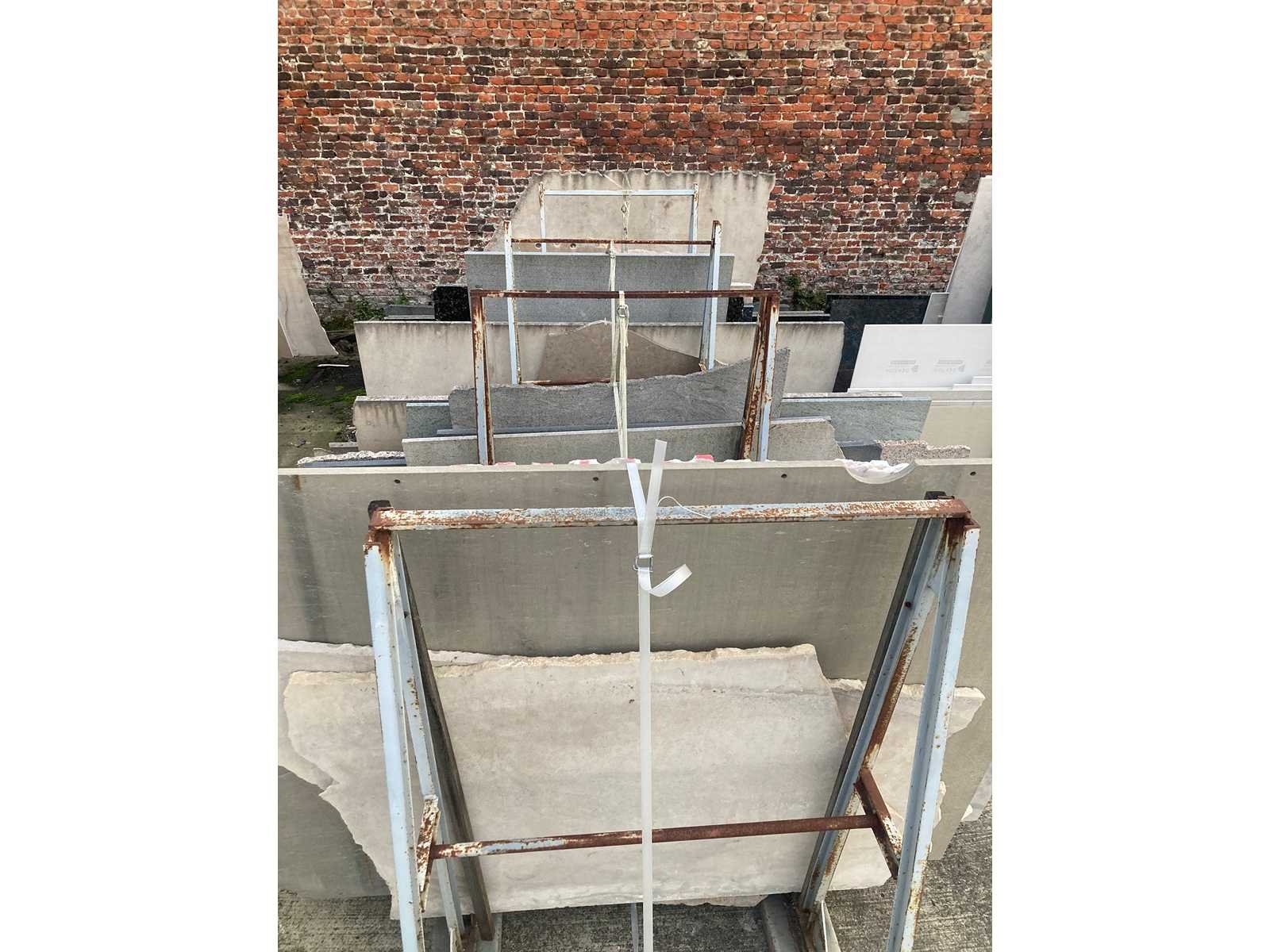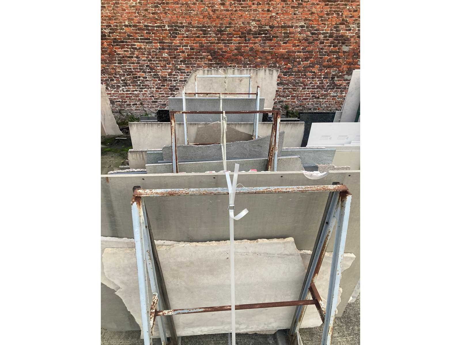 4 stuks metalen transportbokken voor vervoer met heftruck + alle natuursteen platen op deze bokken: verschillende granieten. Nee Gewicht: 3000kg Leveringsvoorwaarden: Niet gefundeerd - onverpakt