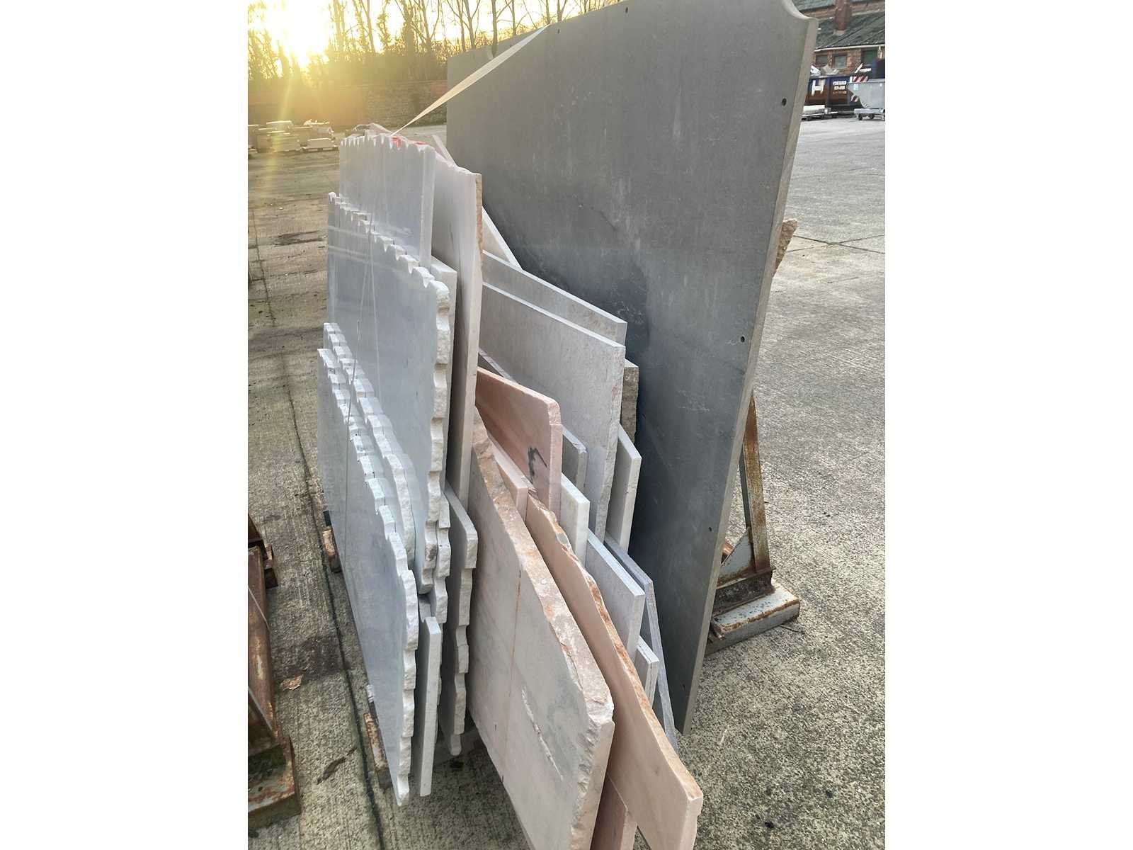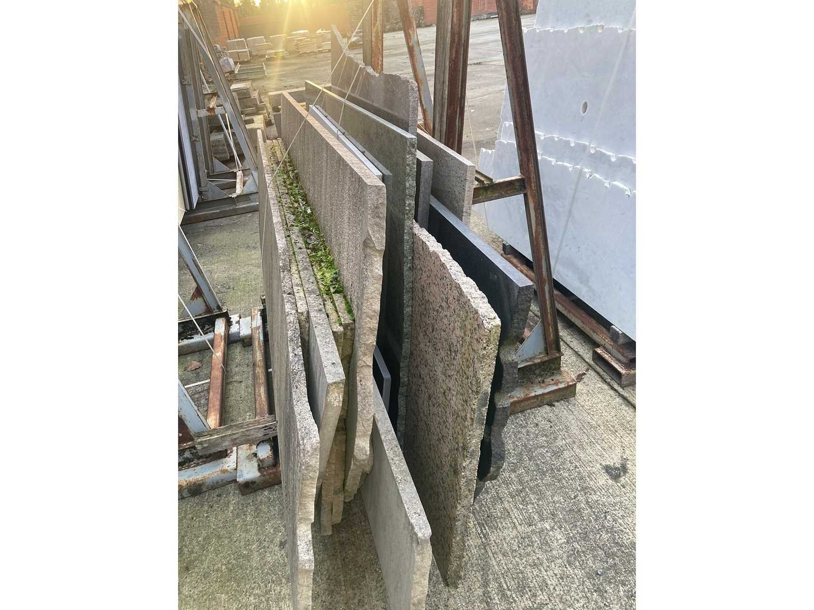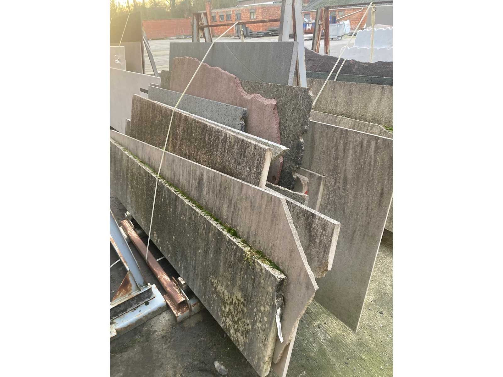 4 stuks metalen transportbokken voor vervoer met heftruck + alle natuursteen platen op deze bokken: verschillende granieten. Nee Gewicht: 3000kg Leveringsvoorwaarden: Niet gefundeerd - onverpakt