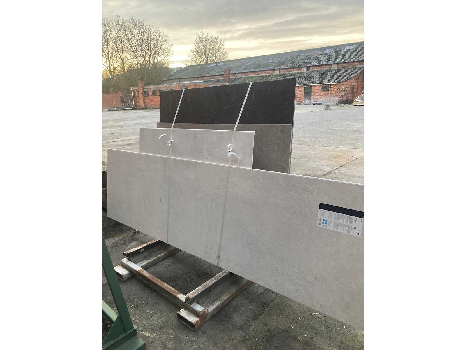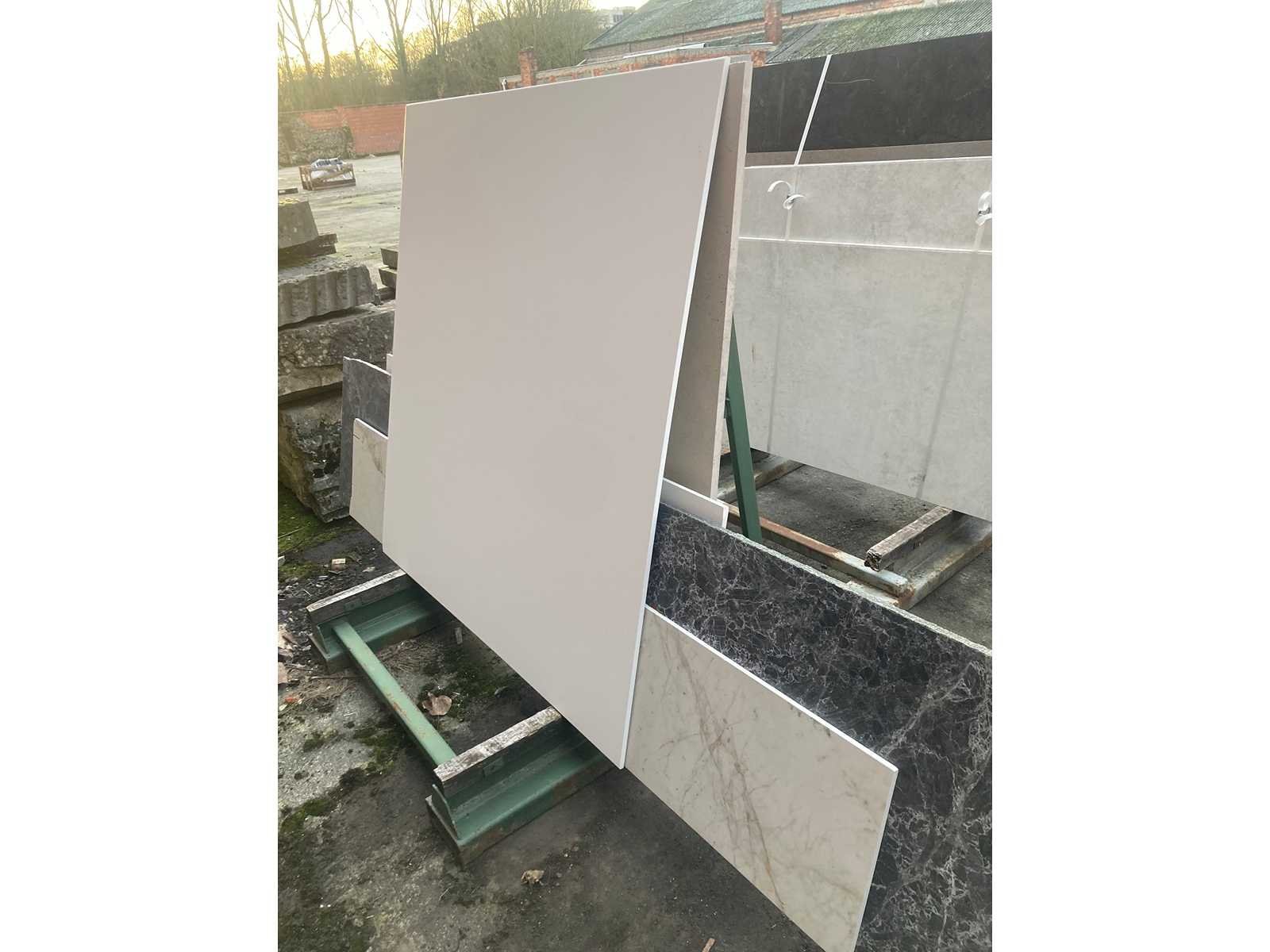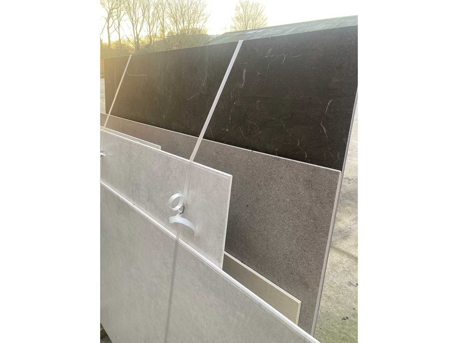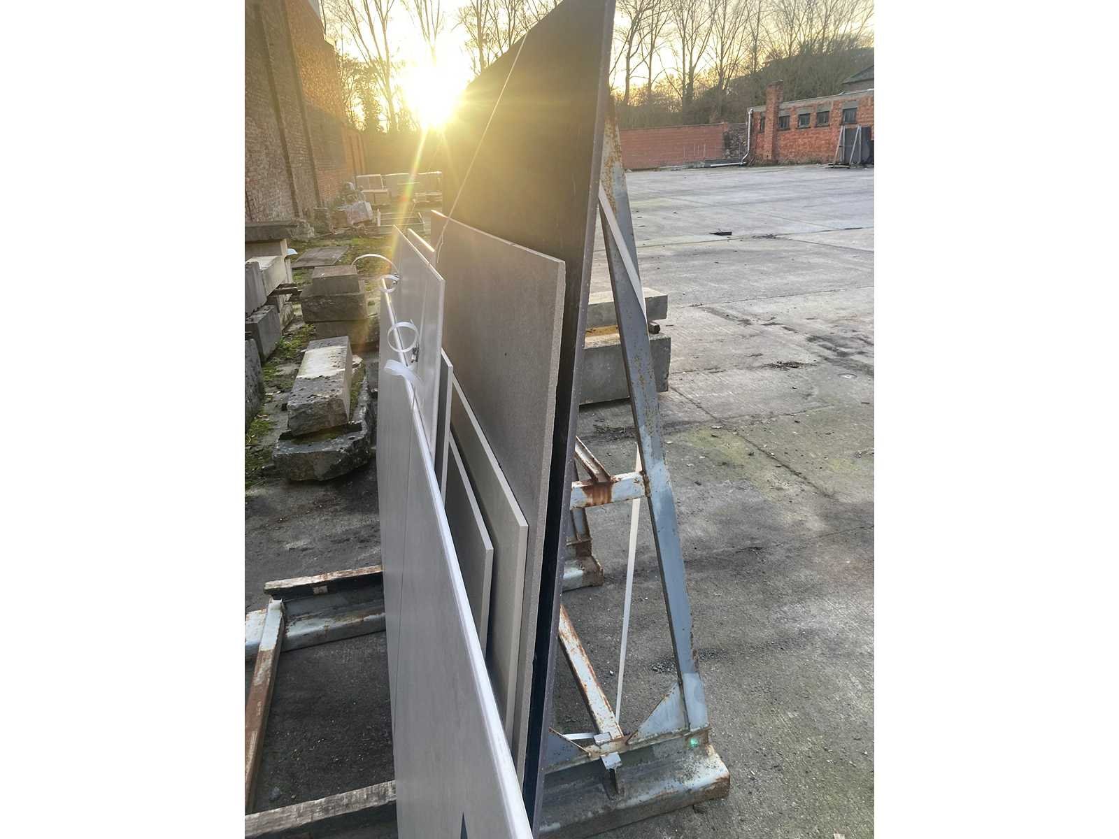 2 stuks metalen transportbokken voor vervoer met heftruck + alle ceramische en natuursteen platen op deze bokken: verschillende ceramische platen en natuursteen. Nee Gewicht: 1700kg Leveringsvoorwaarden: Niet gefundeerd - onverpakt