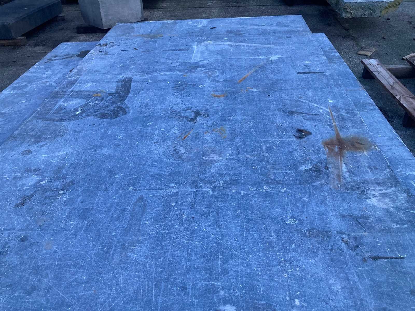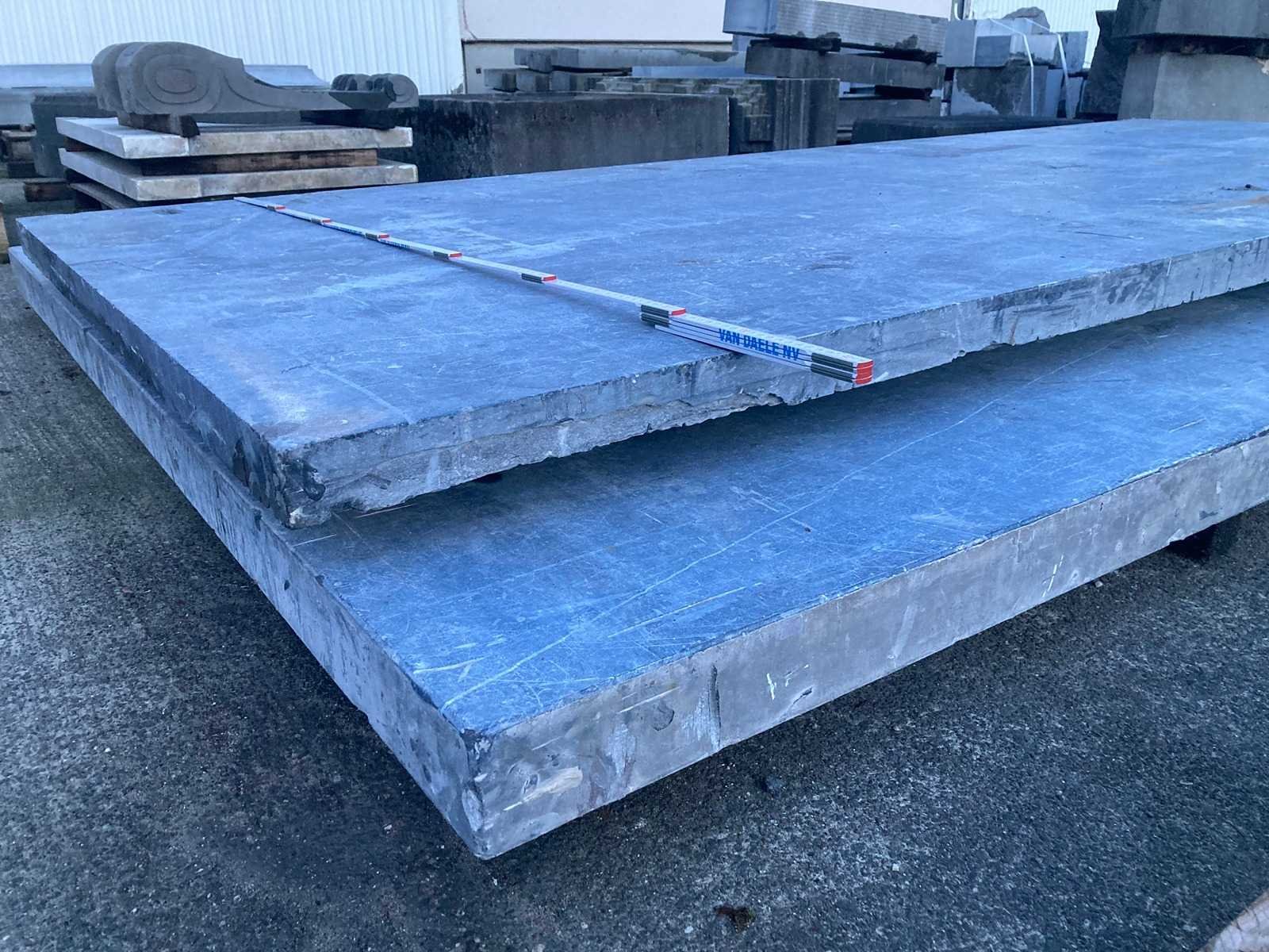 Tafelbladen in Belgische blauwe steen die dienst gedaan hebben als werktafel, dus met de nodige gebruikssporen/patine. tafel 1: 298 x 130 x 5cm Tafel 2: 295 x 190 x 8cm Nee Gewicht: 1700kg Leveringsvoorwaarden: Niet gefundeerd - onverpakt