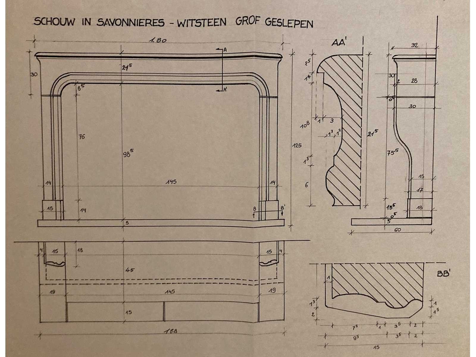 Schouw in witsteen Savonnières met geprofileerde montants en deksteen. Binnenmaat 145 x 98,5cm Buitenmaat 180 x 120 x 32,5cm Nee Gewicht: 350kg Leveringsvoorwaarden: Niet gefundeerd - onverpakt