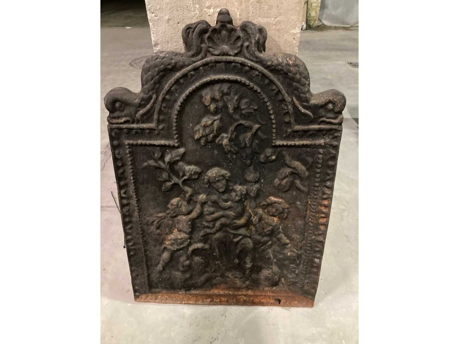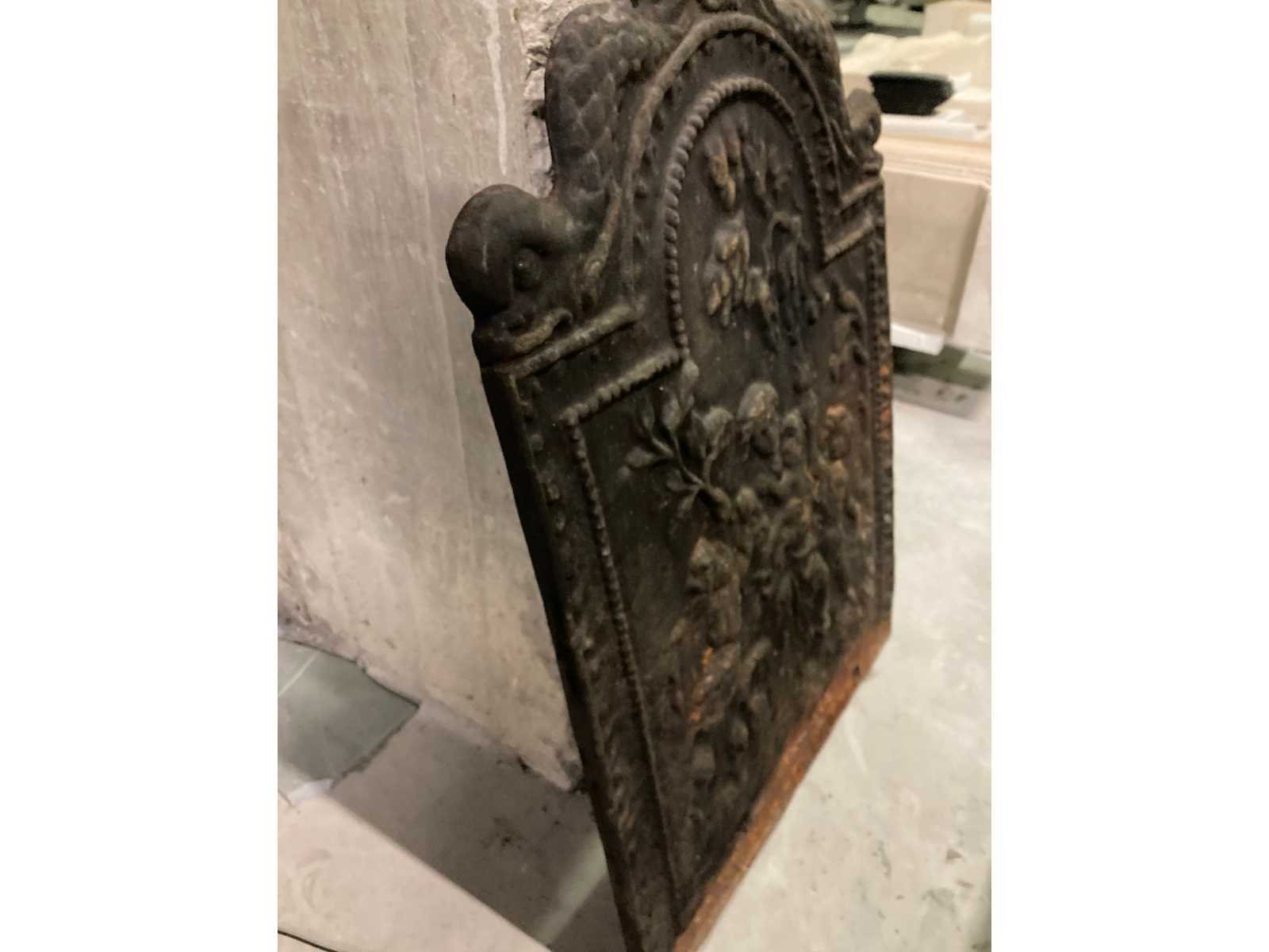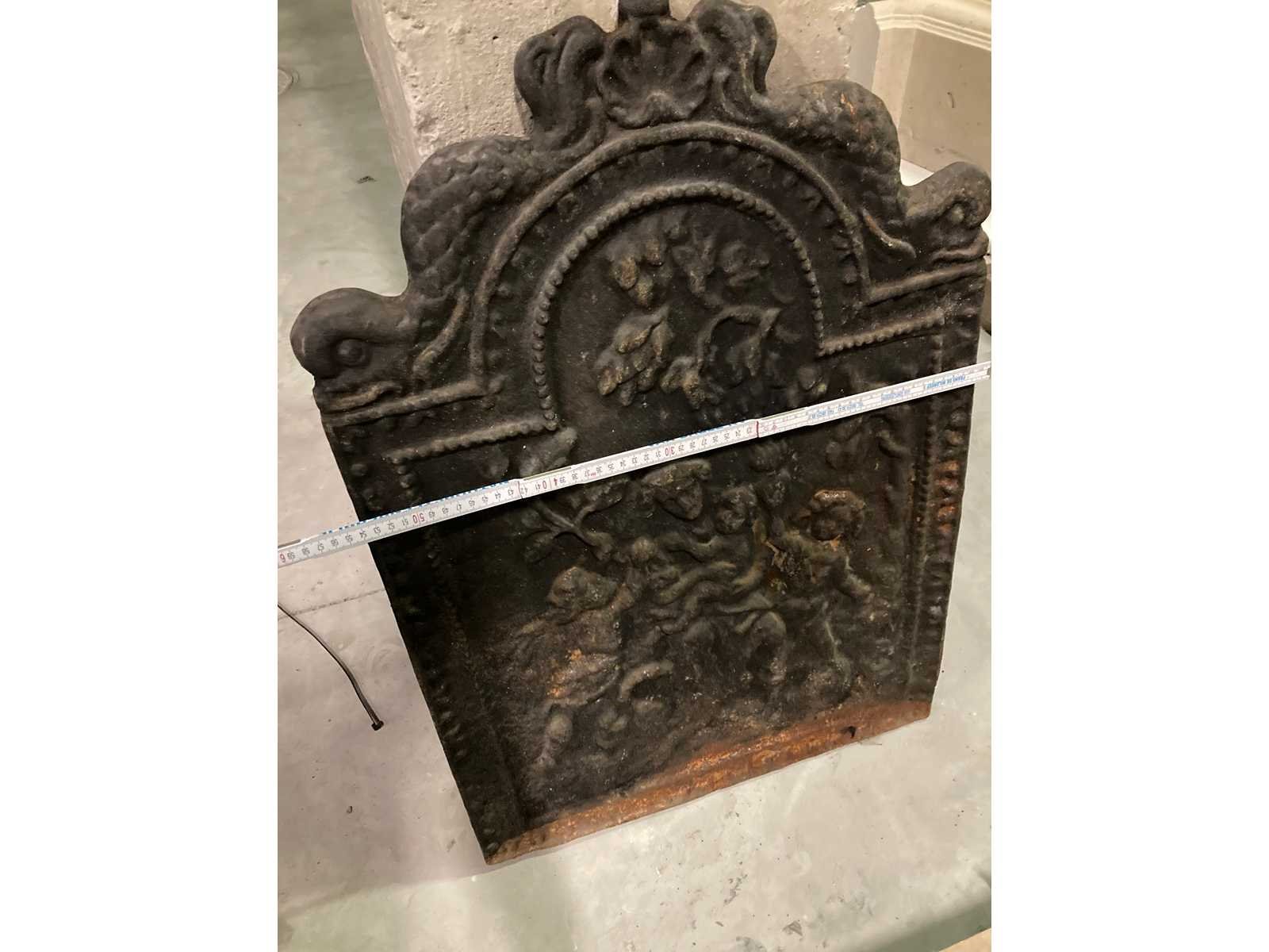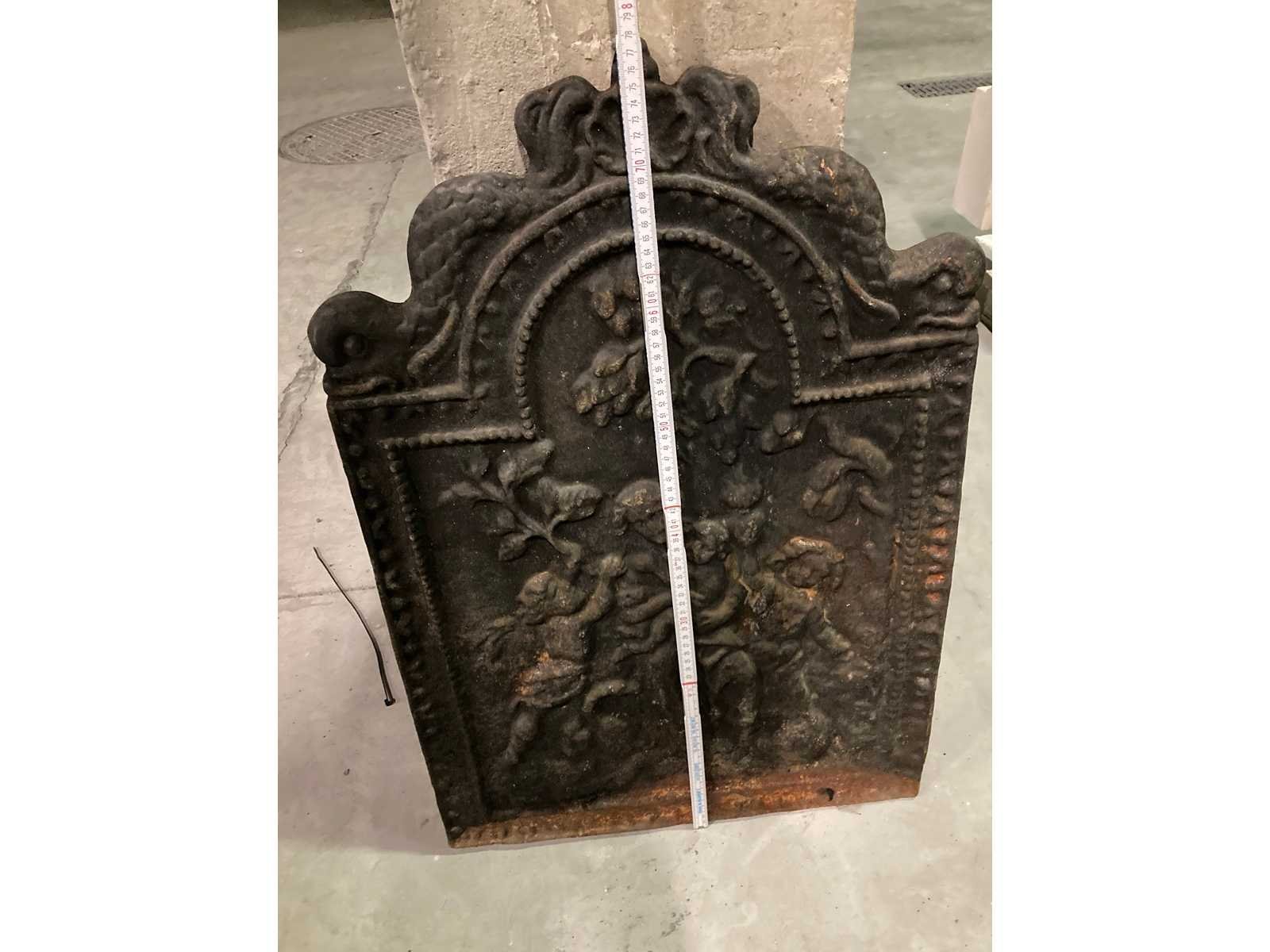 Wandpaneel voor haard in gietijzer: Antiek. Nee Gewicht: 50kg Breedte: 53cm Hoogte: 80cm Leveringsvoorwaarden: Niet gefundeerd - onverpakt