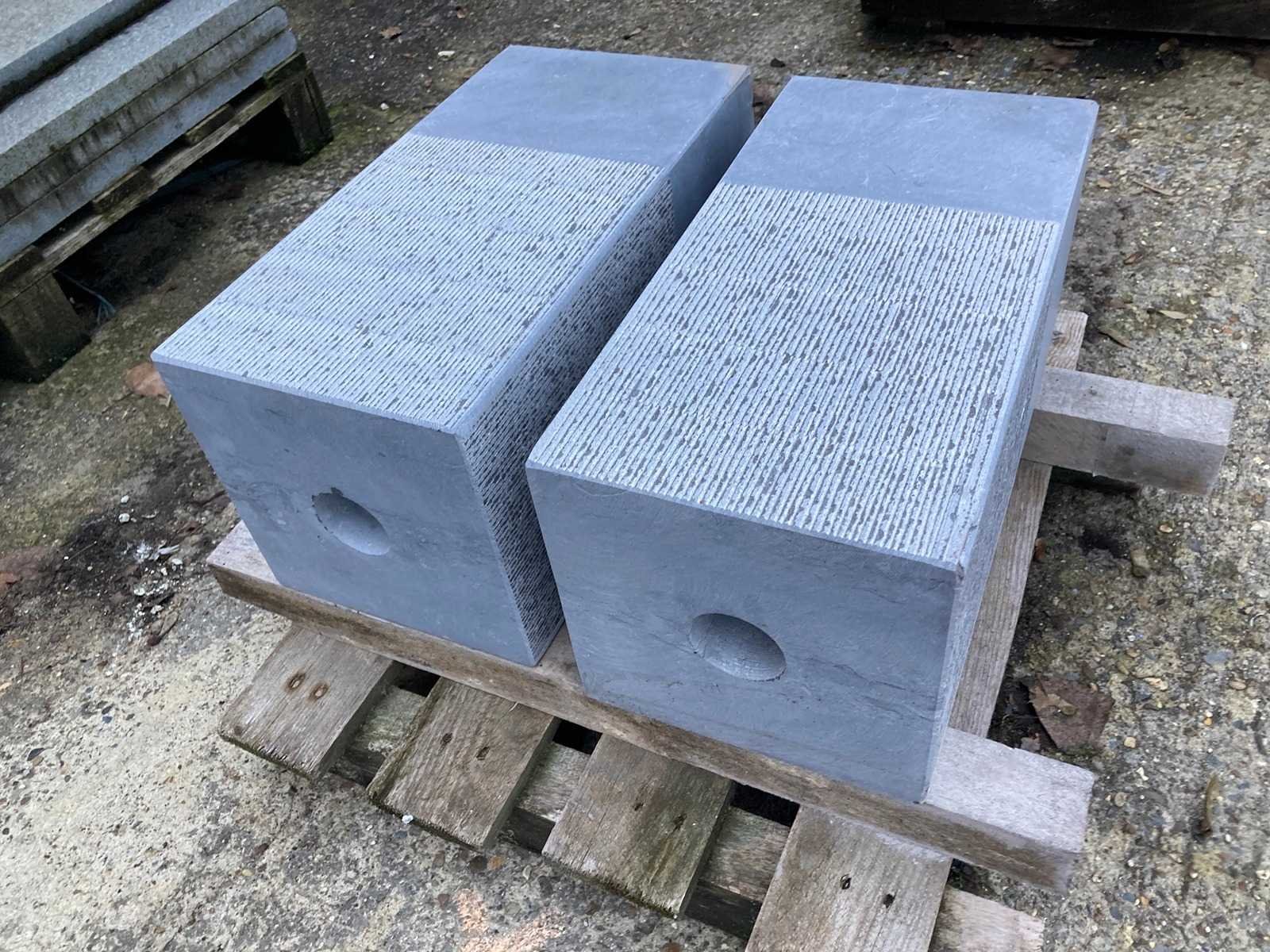 2 massieve sokkels in Belgische blauwe steen. Zijkant deels handgekapt boring diameter 50mm dwars door. 40 x 20 x 20cm Nee Leveringsvoorwaarden: Niet gefundeerd - onverpakt
