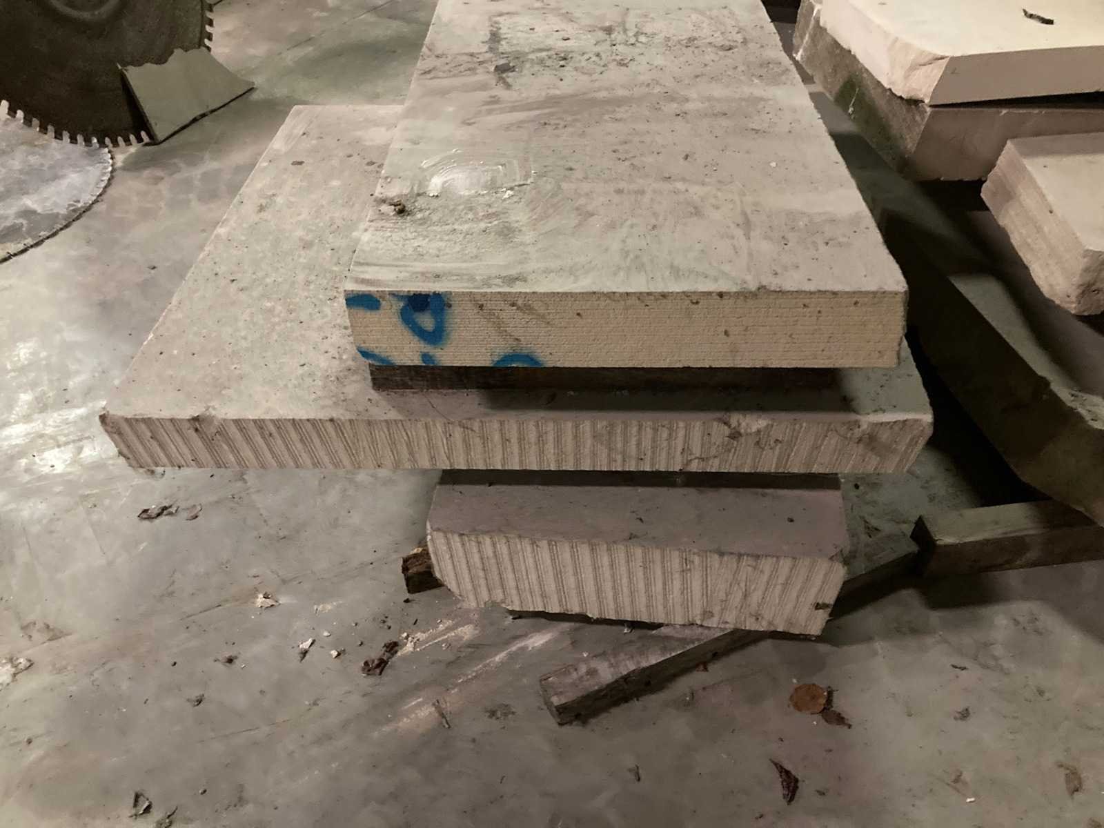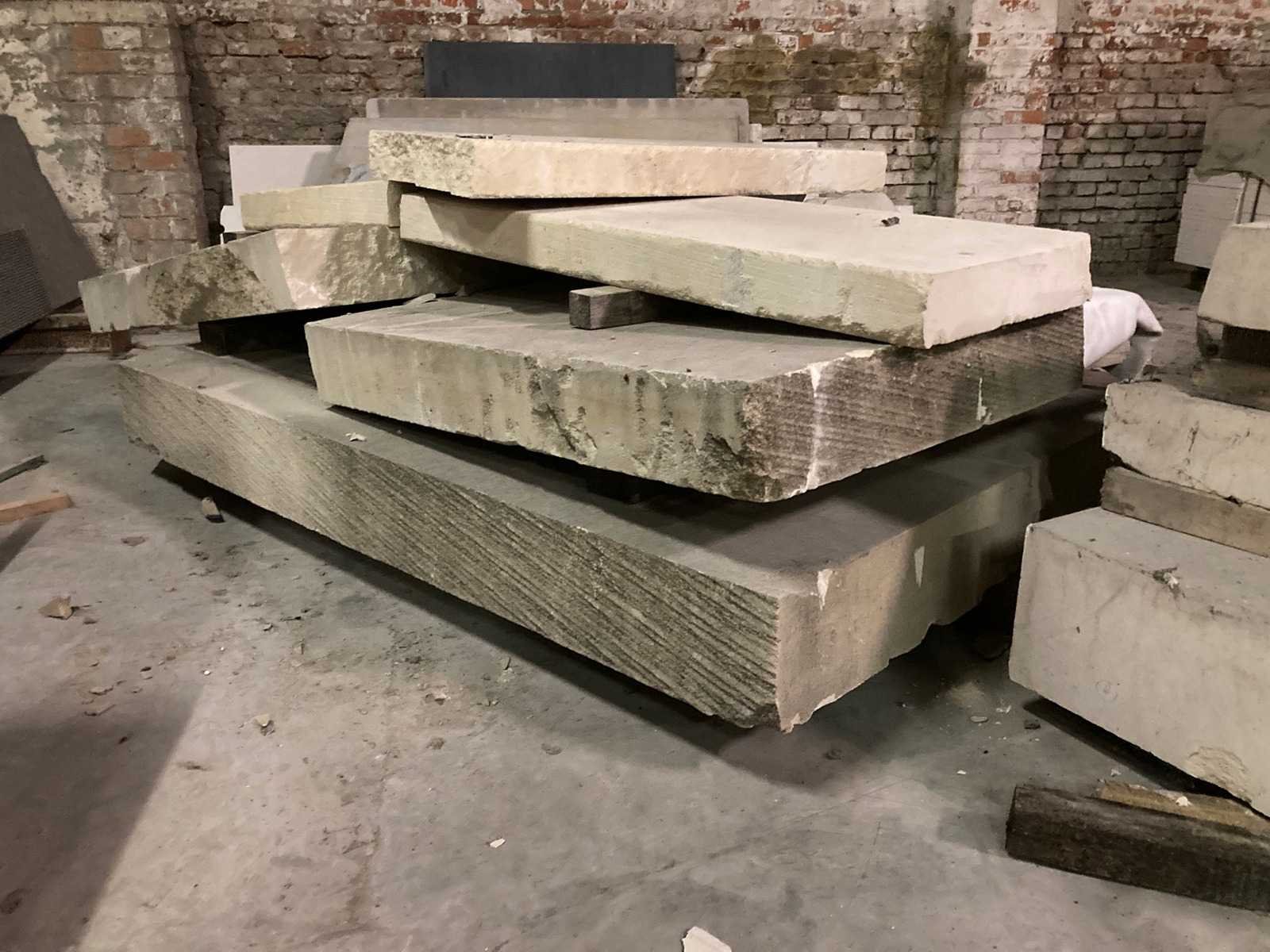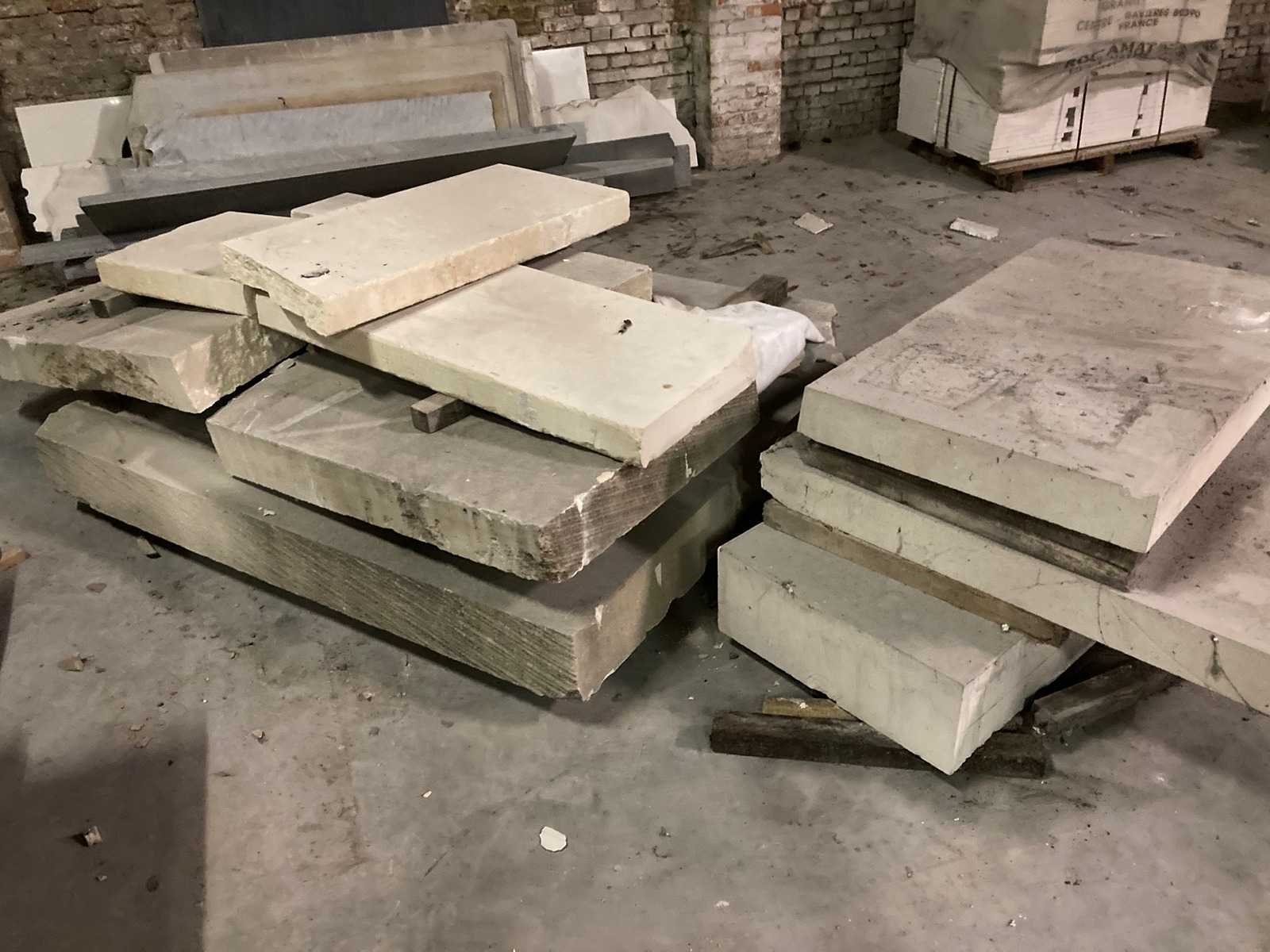 Massieve platen witsteen: onder andere: 160 x 160 x 16cm (breuk) 2 stuks 95x65x13cm 1 stuk 100x55x10cm 1 stuk 100x95x10cm 1 stuk 110x50x20cm reststukken Nee Leveringsvoorwaarden: Niet gefundeerd - onverpakt
