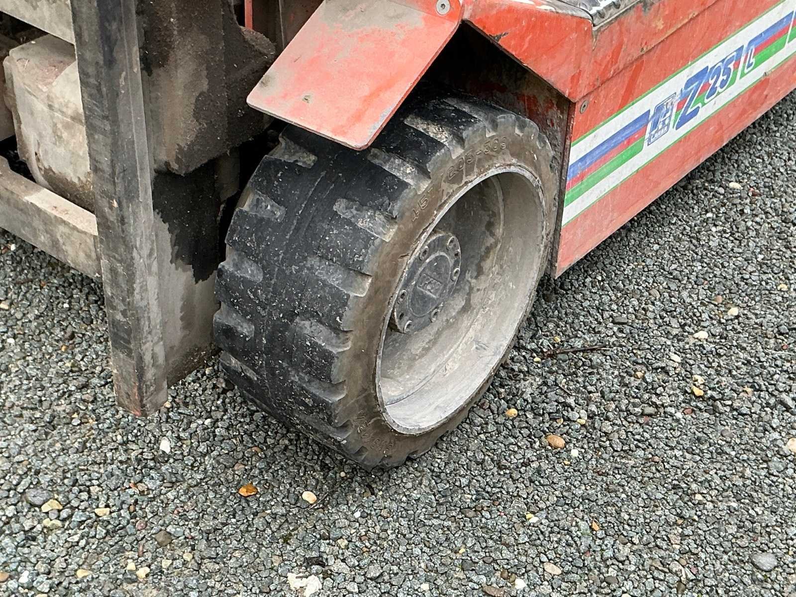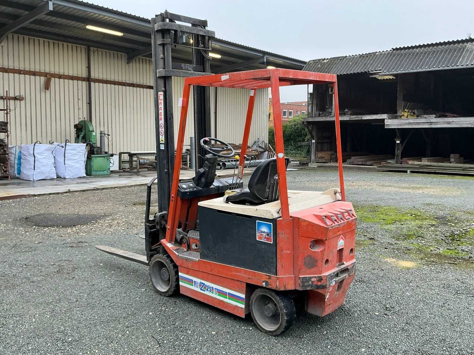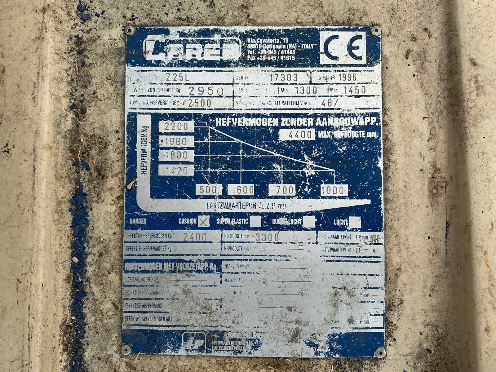 Compleet met acculader CMR 48/120 T 380V Nee Merk: Carer Type: Z25L Bouwjaar: 1996 Serienummer: 17303 Brandstof: Elektrisch Mast: Duplex Soort band: Cushion Aantal wielen: 4 Afgelezen urenstand: 16848 Accu lader: true Side-shift: true Eigen gewicht: 2950kg Hefvermogen: 2500kg Lepellengte: 1200mm Max. hefhoogte: 4400mm Vol rubber banden: true Minimale doorrijhoogte: 2820mm