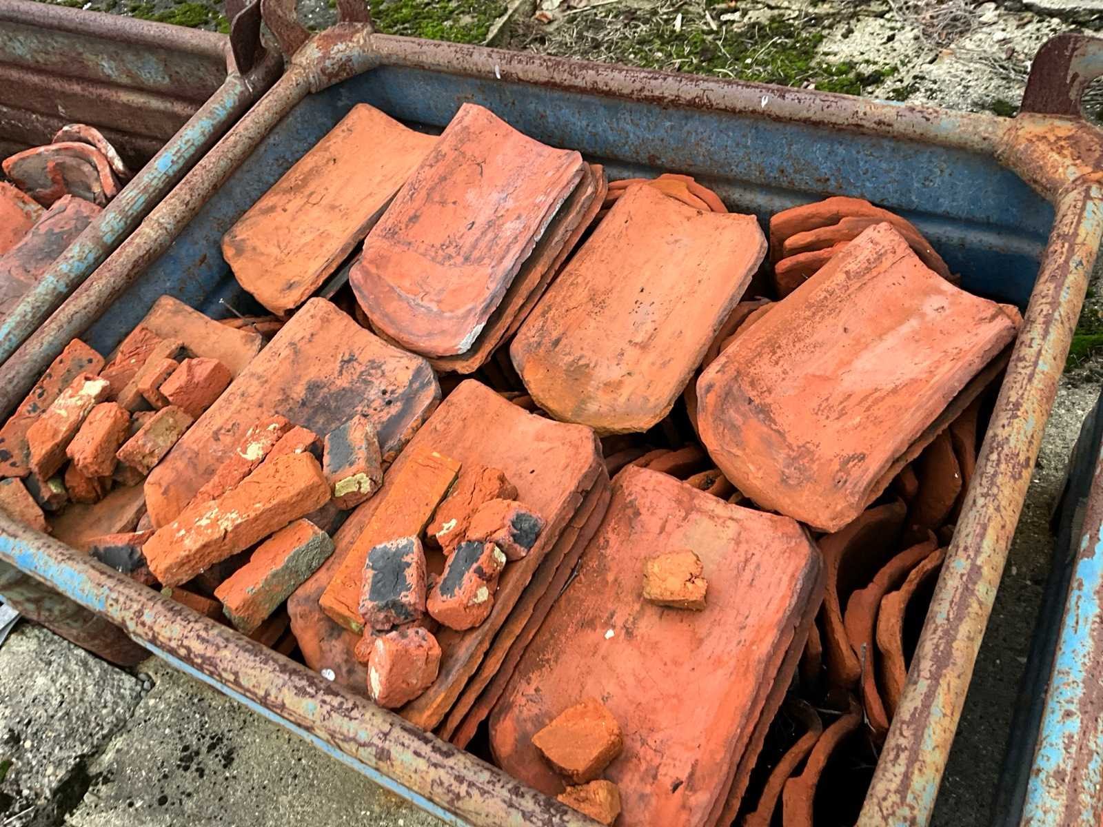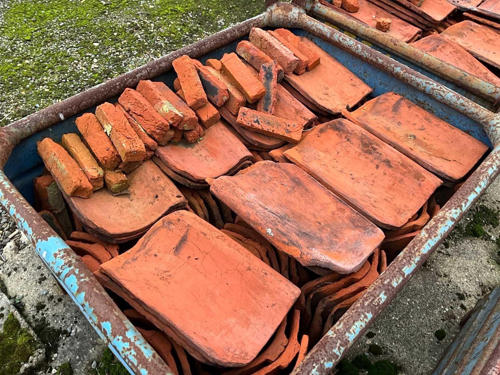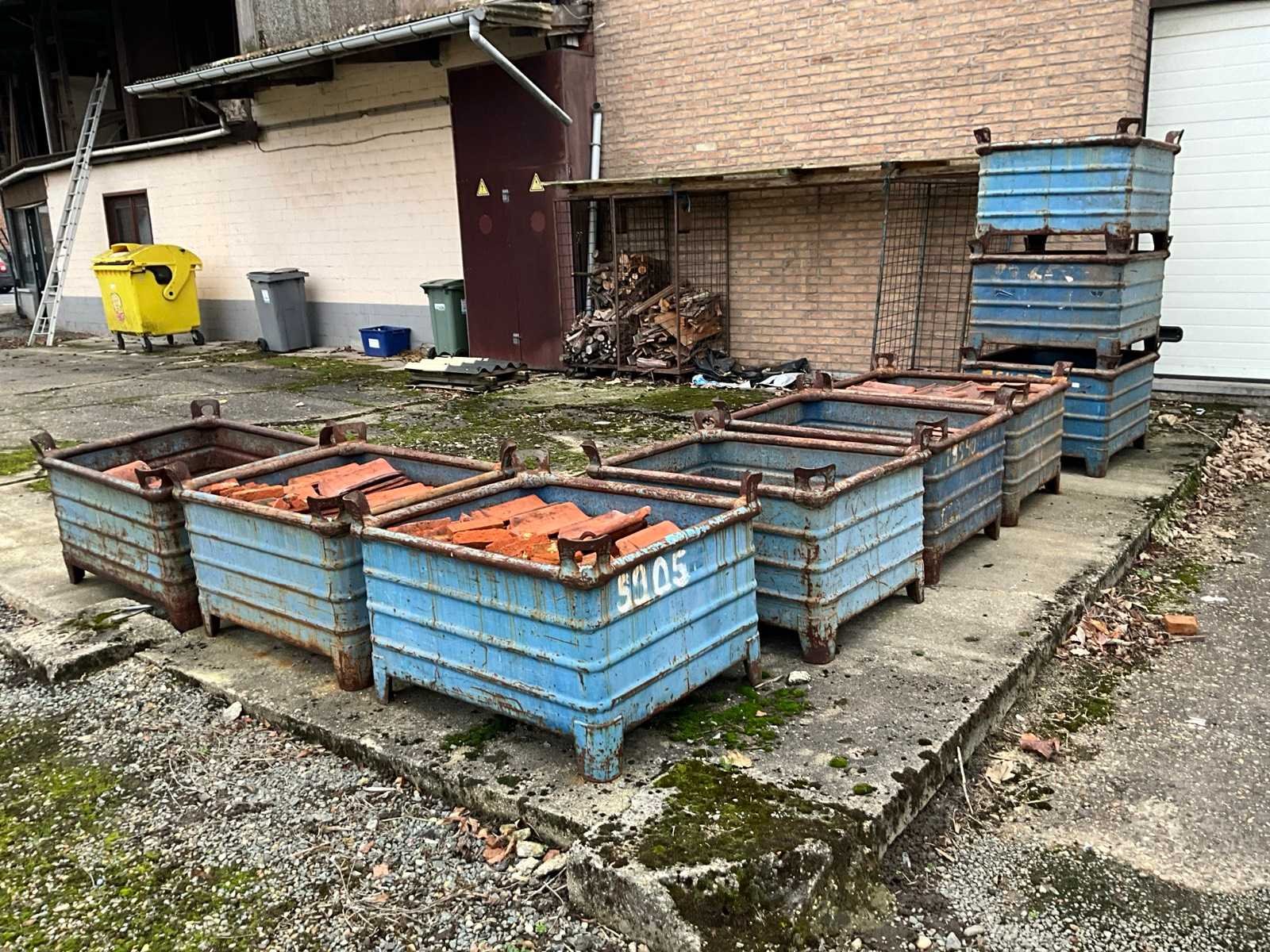 5 bakken inhoudende diverse dakpannen, 1 bak inhoudende sierstenen Nee Lengte: 84cm Breedte: 194cm Hoogte: 62cm Materiaal: Metaal