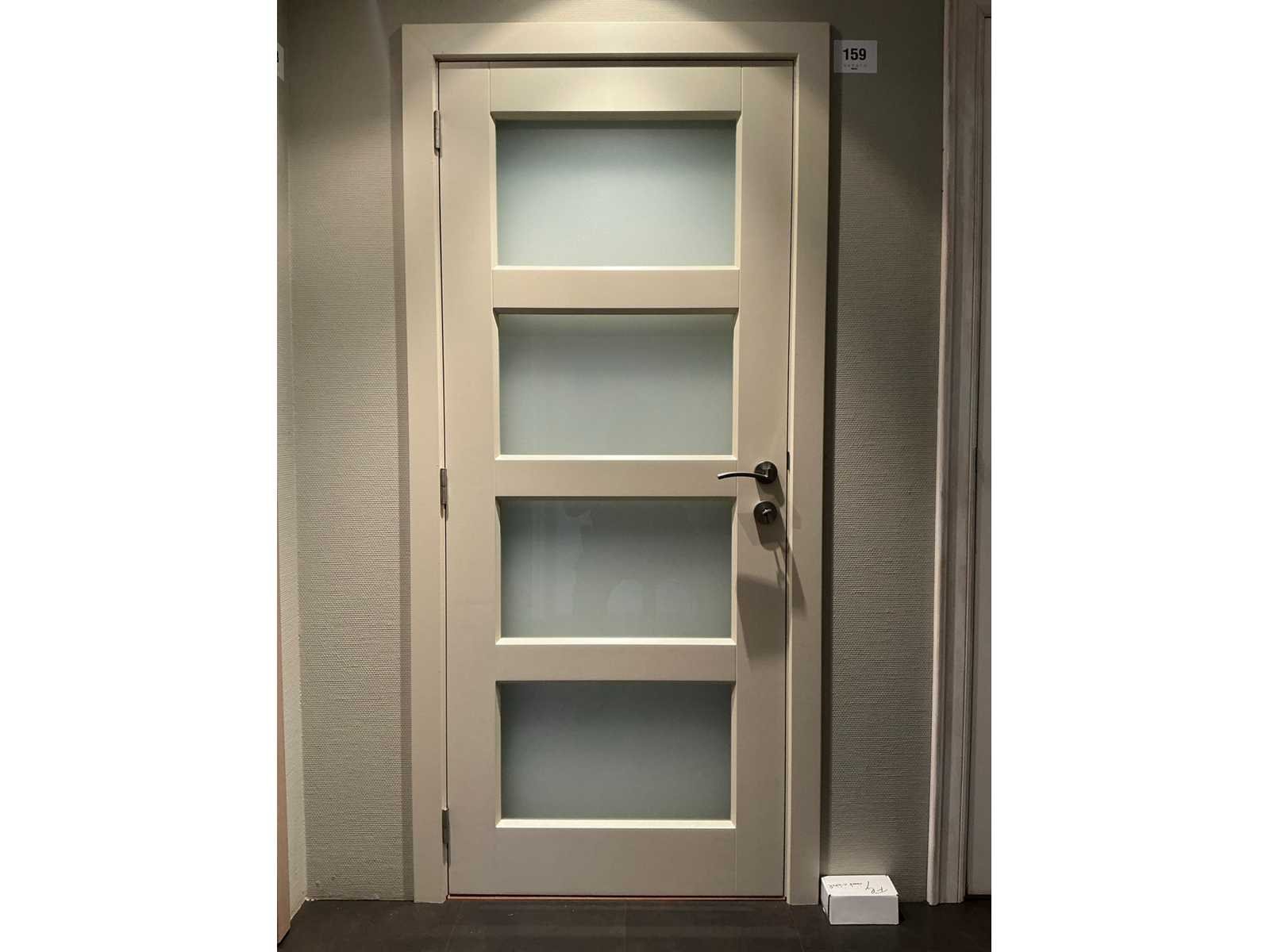 Showroom model, voorzien van slot, enkelzijdige klink en enkelzijdig kozijn, Door klant zelf te demonteren Nee Binnendeur: true Beglaasd: true Afmeting h: 2015mm Afmeting b: 830mm Totale afmeting lxbxh: 1000x2105mm Type: Massief houten Hout: true Dikte: 40mm Kleur: Crème