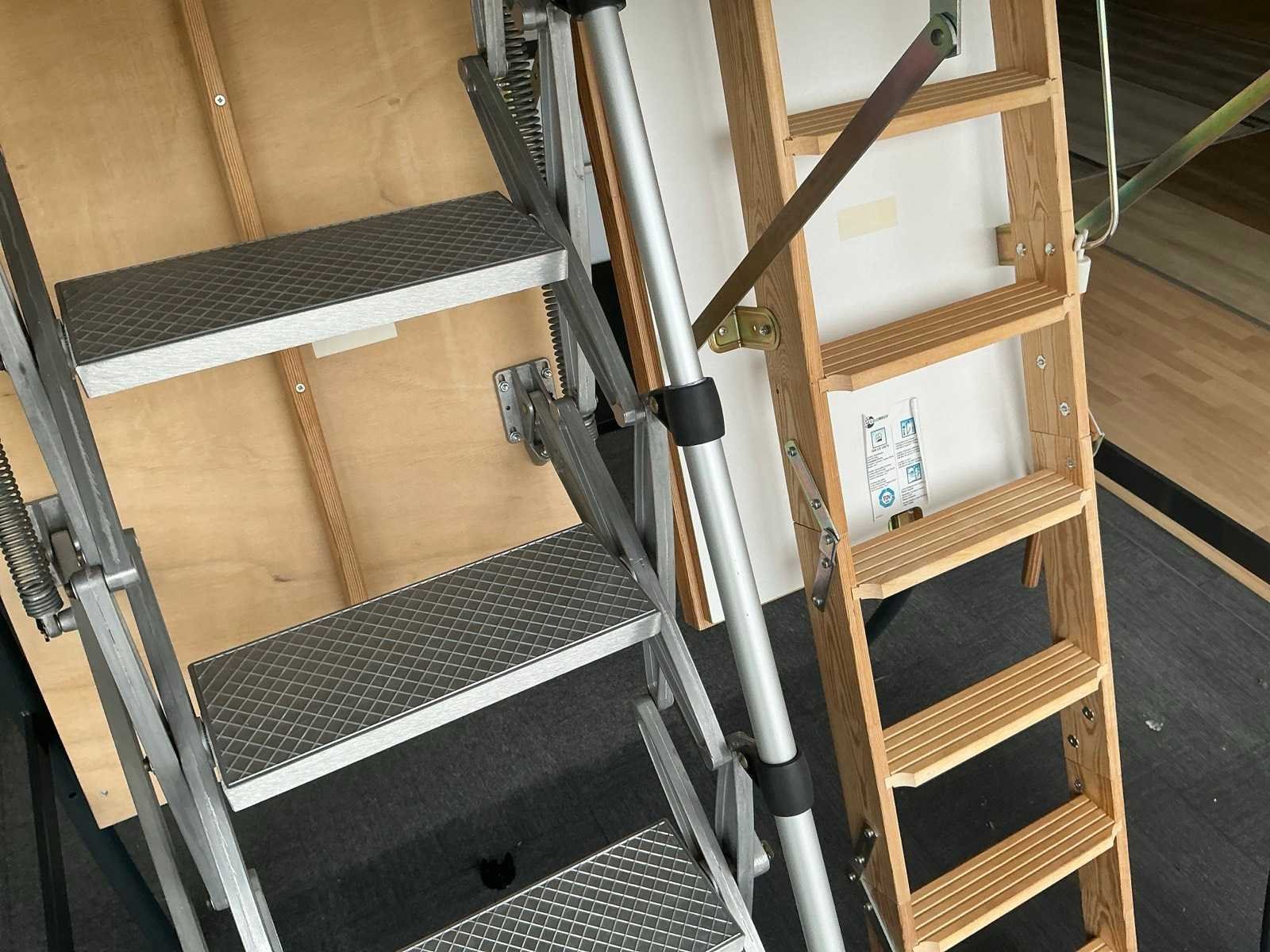 Waaronder in metaal en hout, Compleet met afgeveerd zolderluik, Beide vast gemonteerd op metalen showroomdisplay, showroomdisplay inbegrepen 150 x 125 x 220cm Nee Merk: Columbus Oplooptrap: true Enkel: true