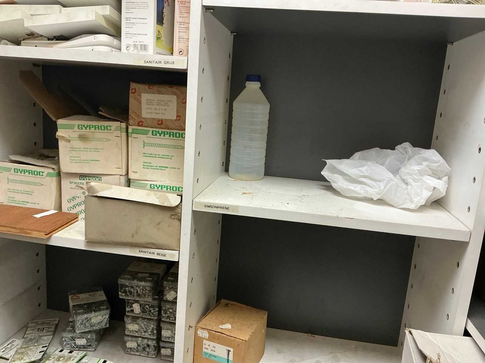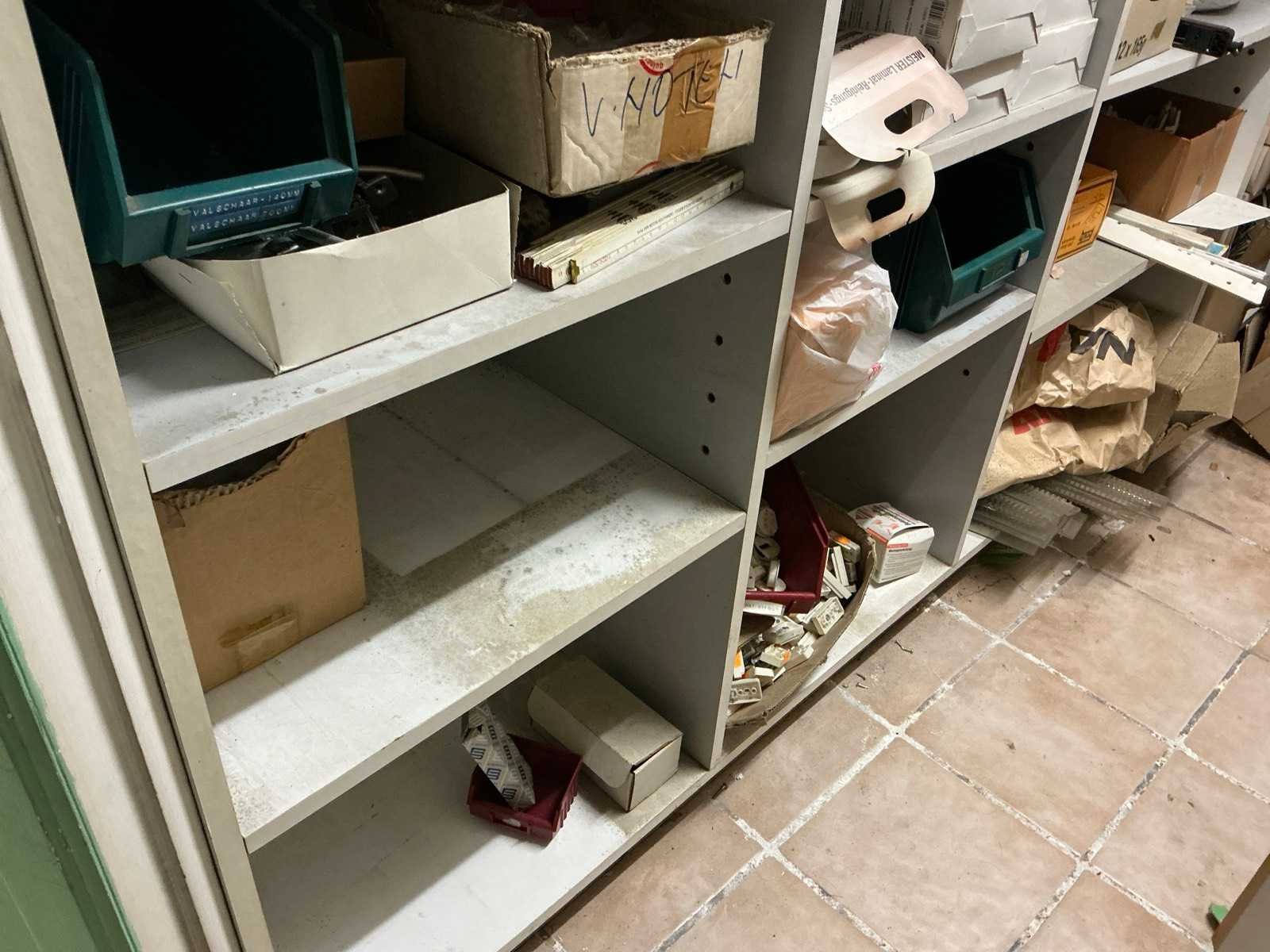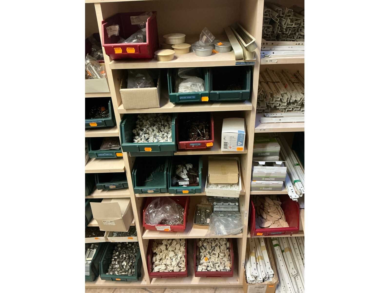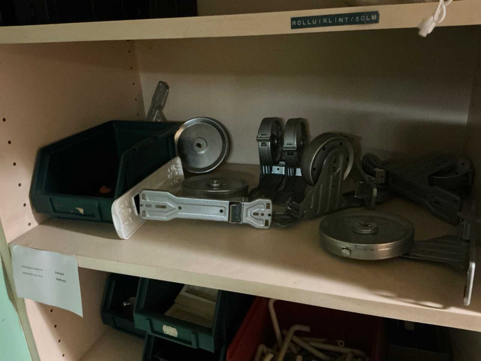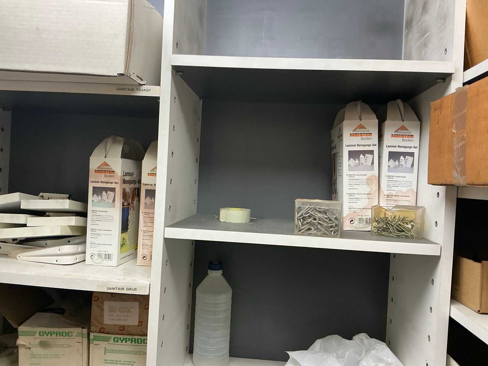 Waaronder bestaande uit: 2 jaloezieën Velux, 18 metalen grondpiketten, 4 houten schragen, 1 displaystaander inhoudende diverse deurklinken, Partij diverse kast- en ladeonderdelen, Enige bevestigingsmaterialen, deursloten, pvc bochten en koppelstukken, Waaronder liggende in dubbelzijdig houten opbergmeubel, Metalen overgangsproblemen, klauwklemmen, plintconnectoren, plaketten, afsluitkleppen en rosetonderdelen, Uitgezonderd genummerde kavels en eigendomsvoorbehoud, Afgifte volgens aanwijzing Nee Type: Restinhoud