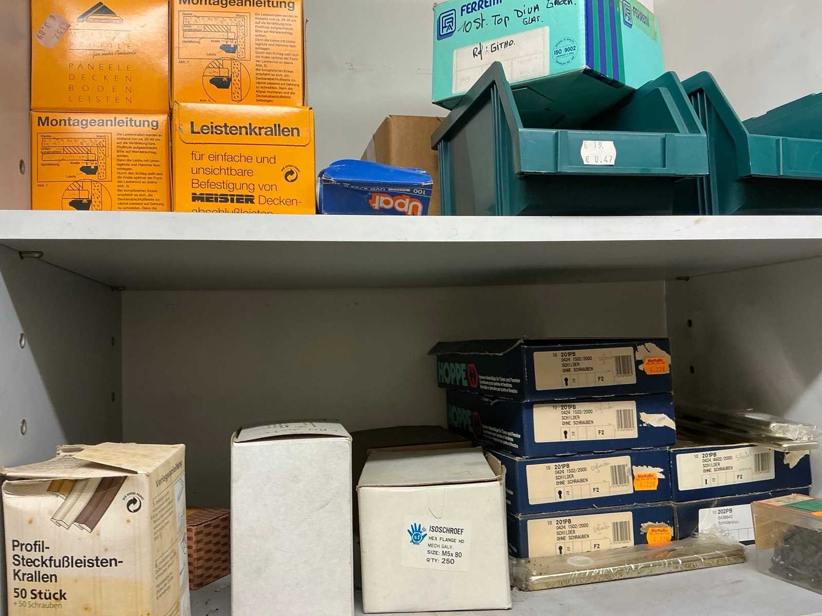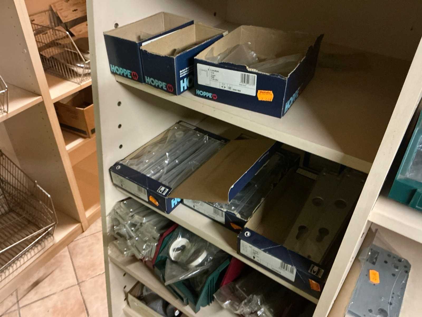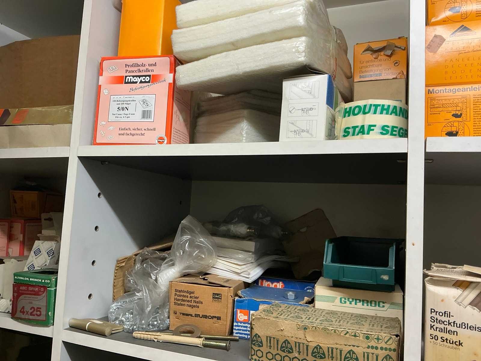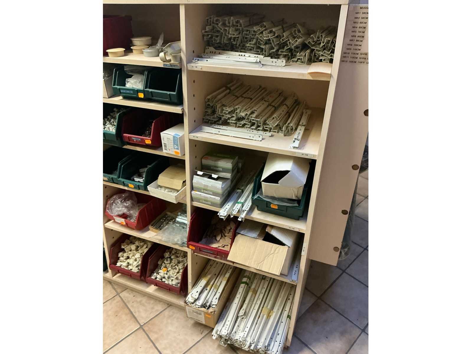 Waaronder bestaande uit: 2 jaloezieën Velux, 18 metalen grondpiketten, 4 houten schragen, 1 displaystaander inhoudende diverse deurklinken, Partij diverse kast- en ladeonderdelen, Enige bevestigingsmaterialen, deursloten, pvc bochten en koppelstukken, Waaronder liggende in dubbelzijdig houten opbergmeubel, Metalen overgangsproblemen, klauwklemmen, plintconnectoren, plaketten, afsluitkleppen en rosetonderdelen, Uitgezonderd genummerde kavels en eigendomsvoorbehoud, Afgifte volgens aanwijzing Nee Type: Restinhoud