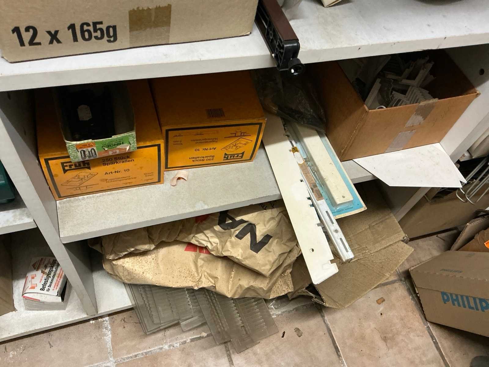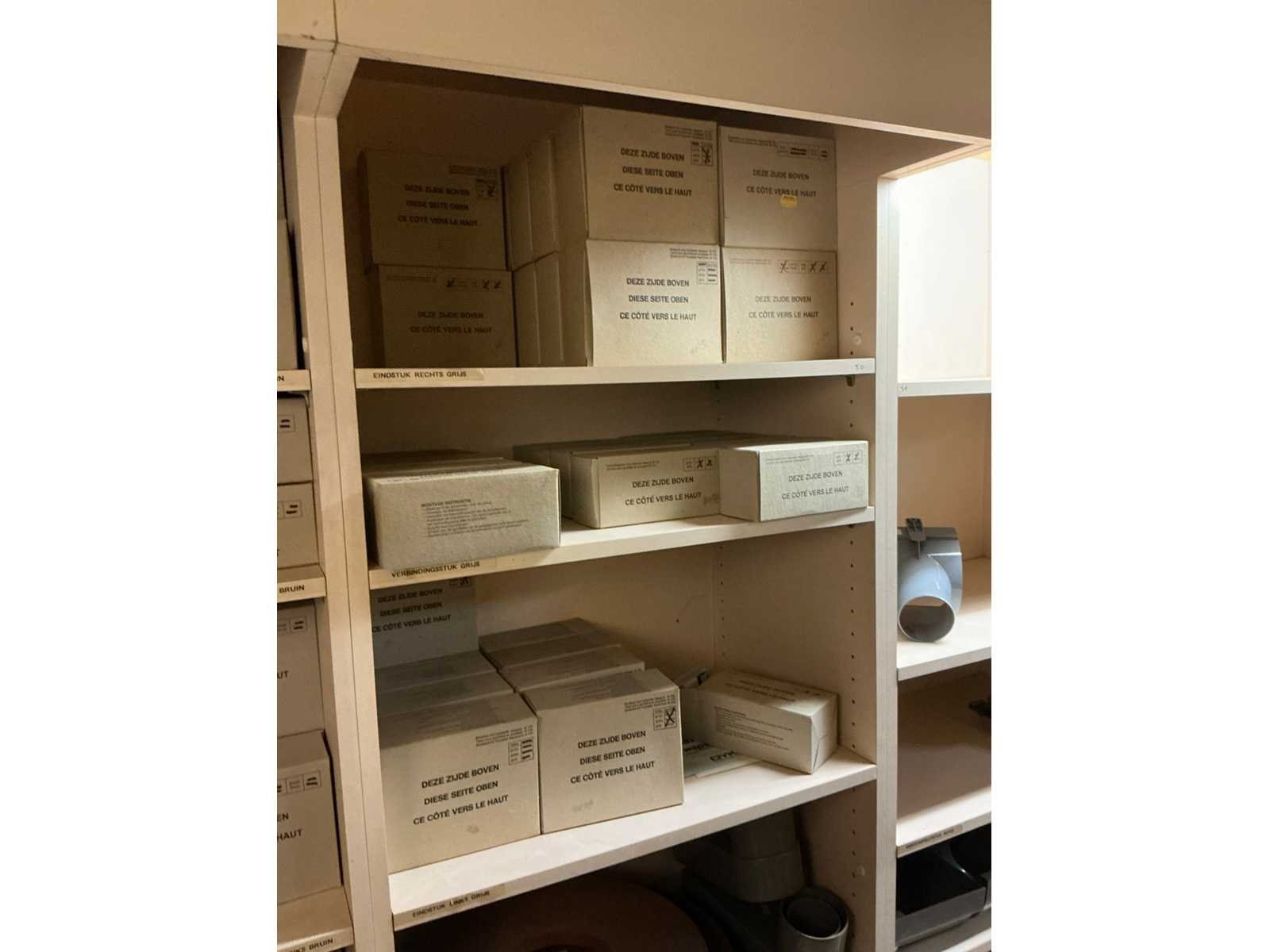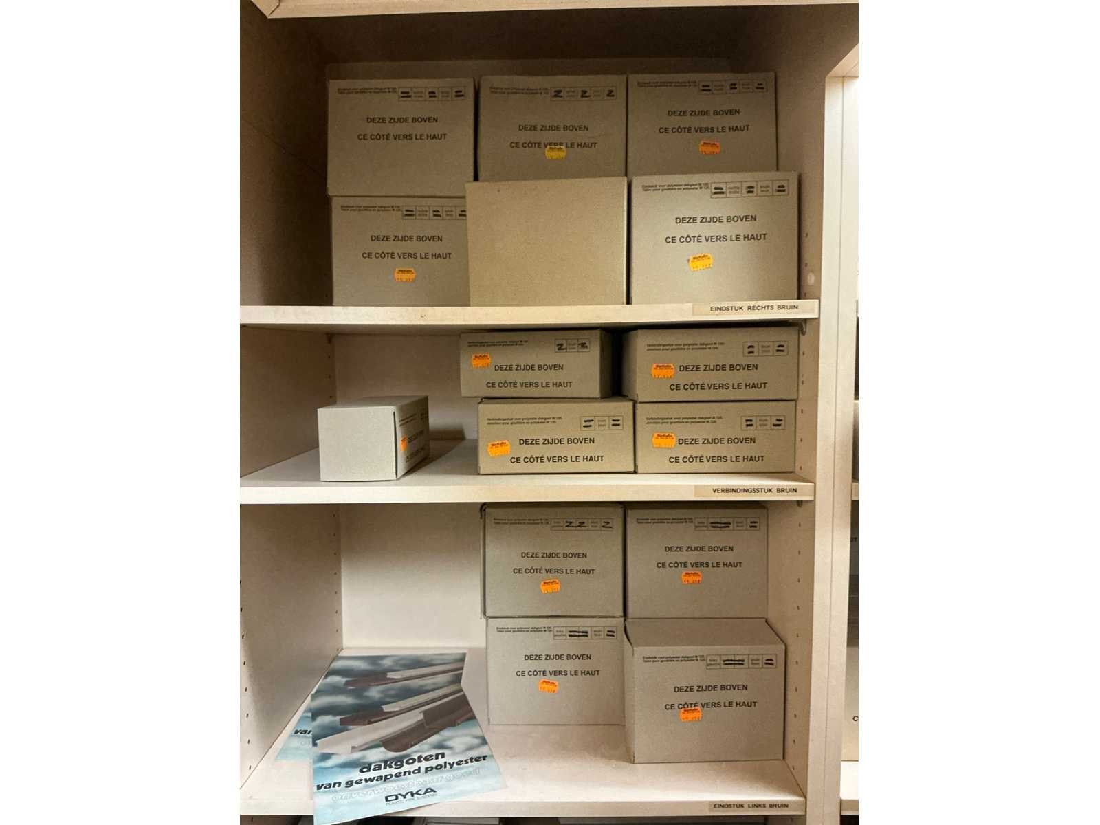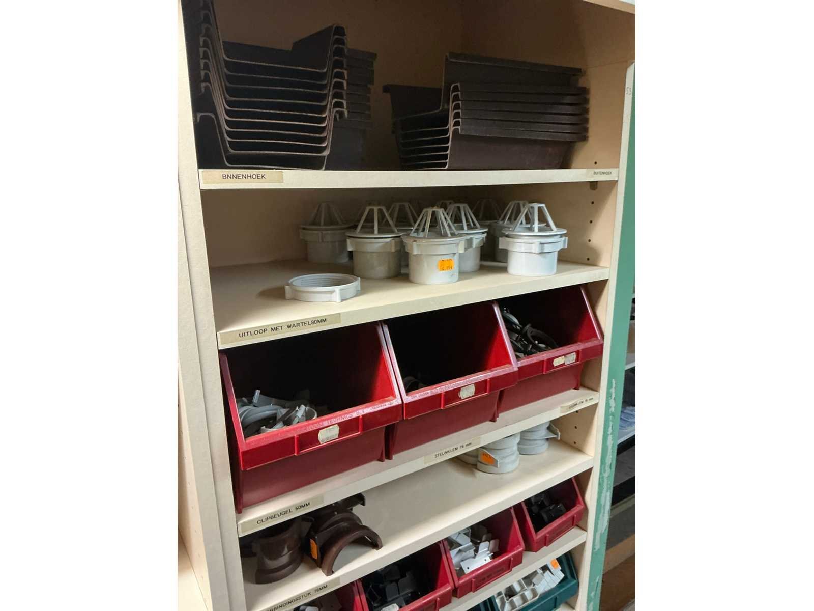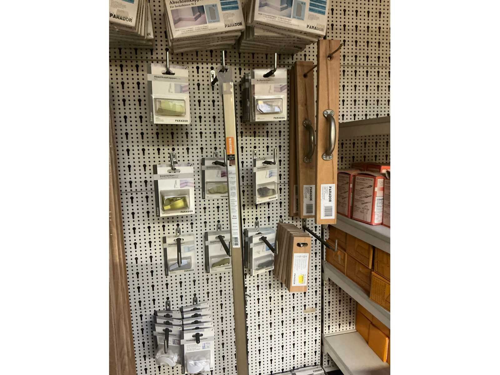 Waaronder bestaande uit: 2 jaloezieën Velux, 18 metalen grondpiketten, 4 houten schragen, 1 displaystaander inhoudende diverse deurklinken, Partij diverse kast- en ladeonderdelen, Enige bevestigingsmaterialen, deursloten, pvc bochten en koppelstukken, Waaronder liggende in dubbelzijdig houten opbergmeubel, Metalen overgangsproblemen, klauwklemmen, plintconnectoren, plaketten, afsluitkleppen en rosetonderdelen, Uitgezonderd genummerde kavels en eigendomsvoorbehoud, Afgifte volgens aanwijzing Nee Type: Restinhoud