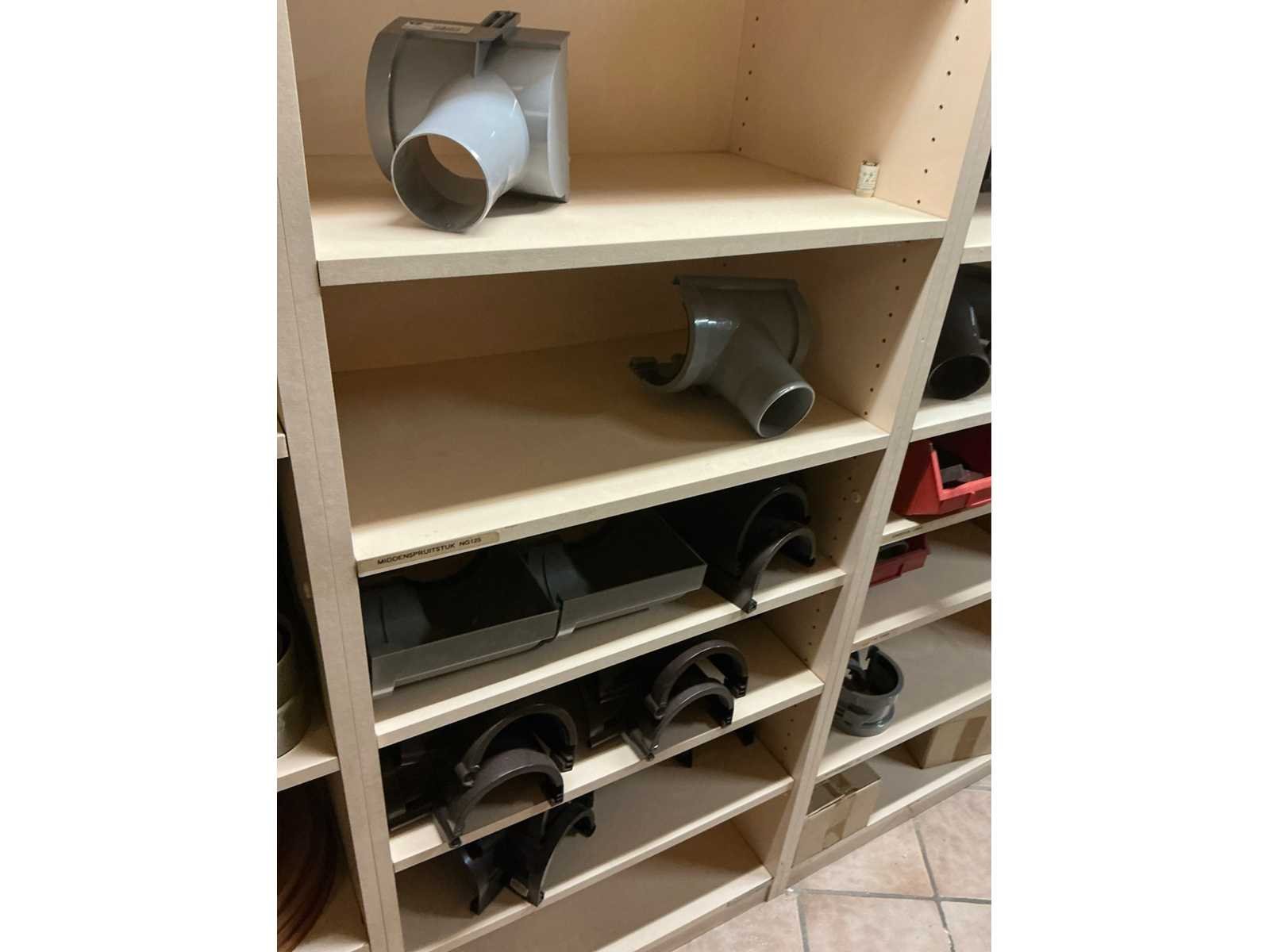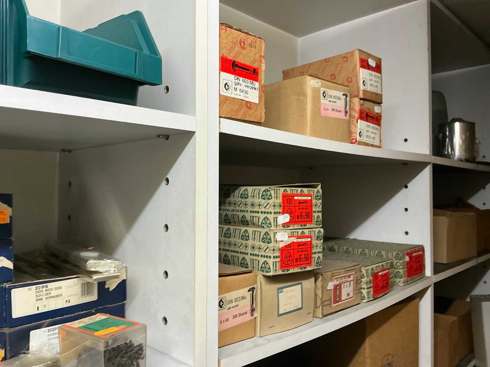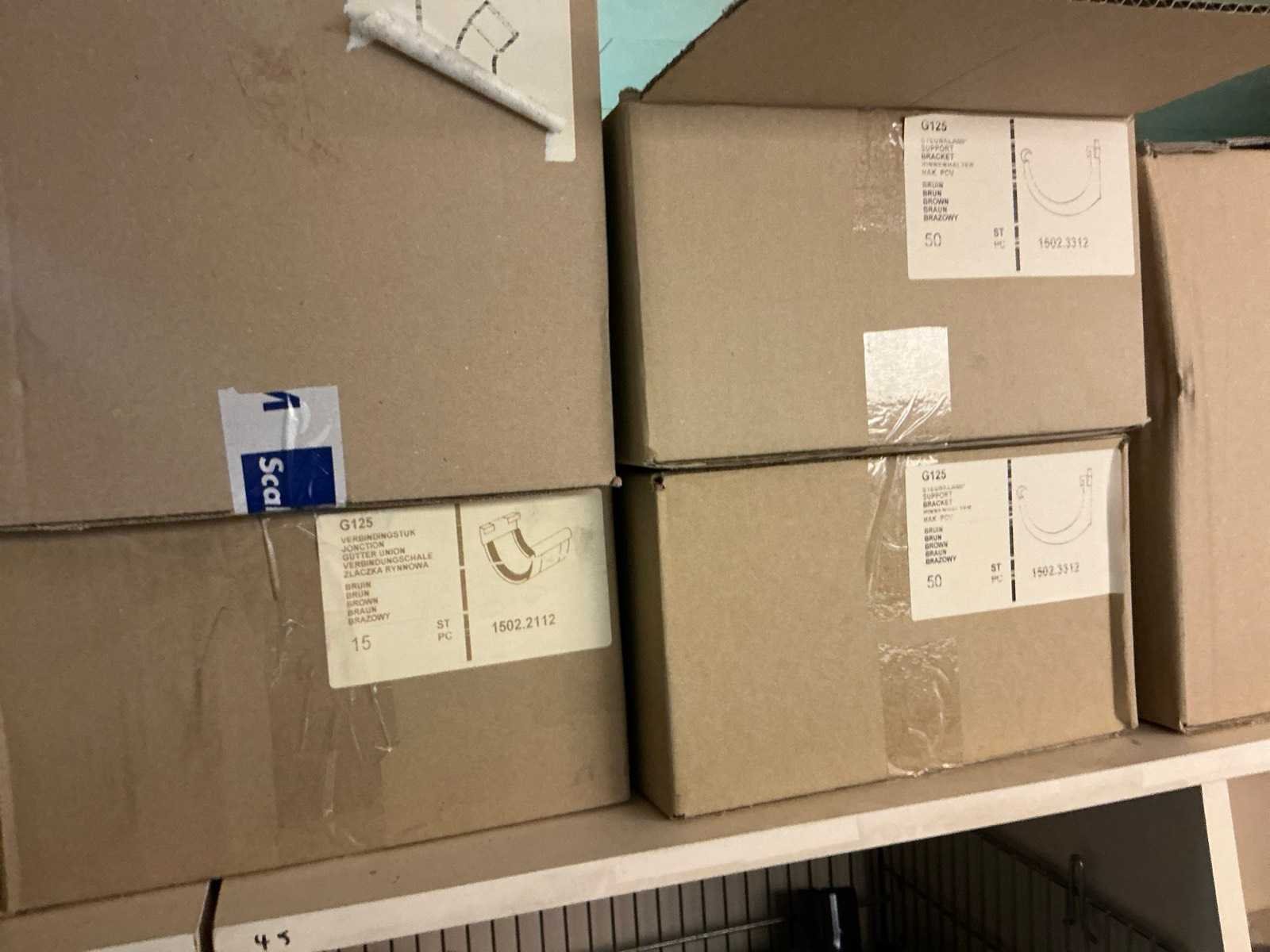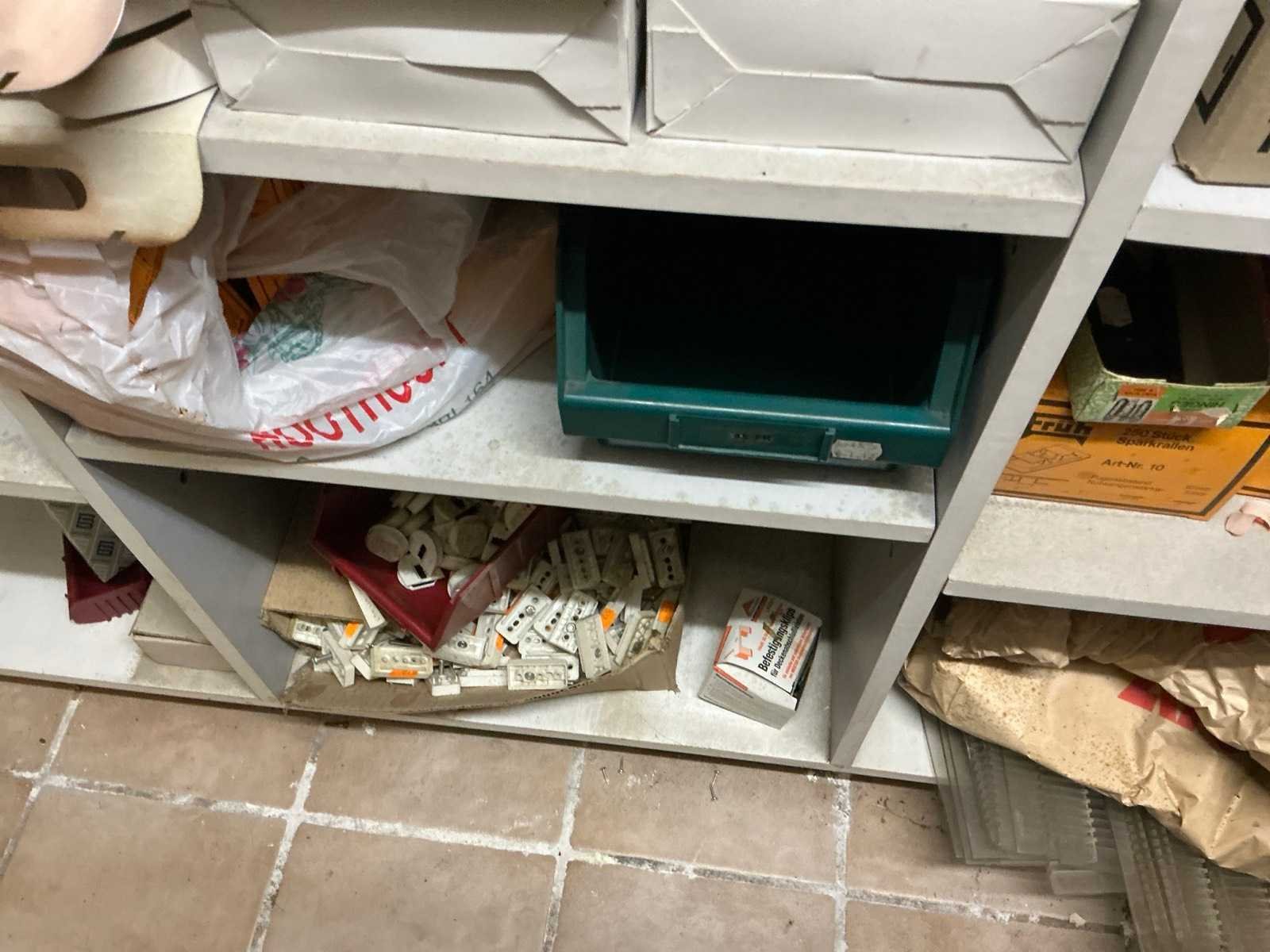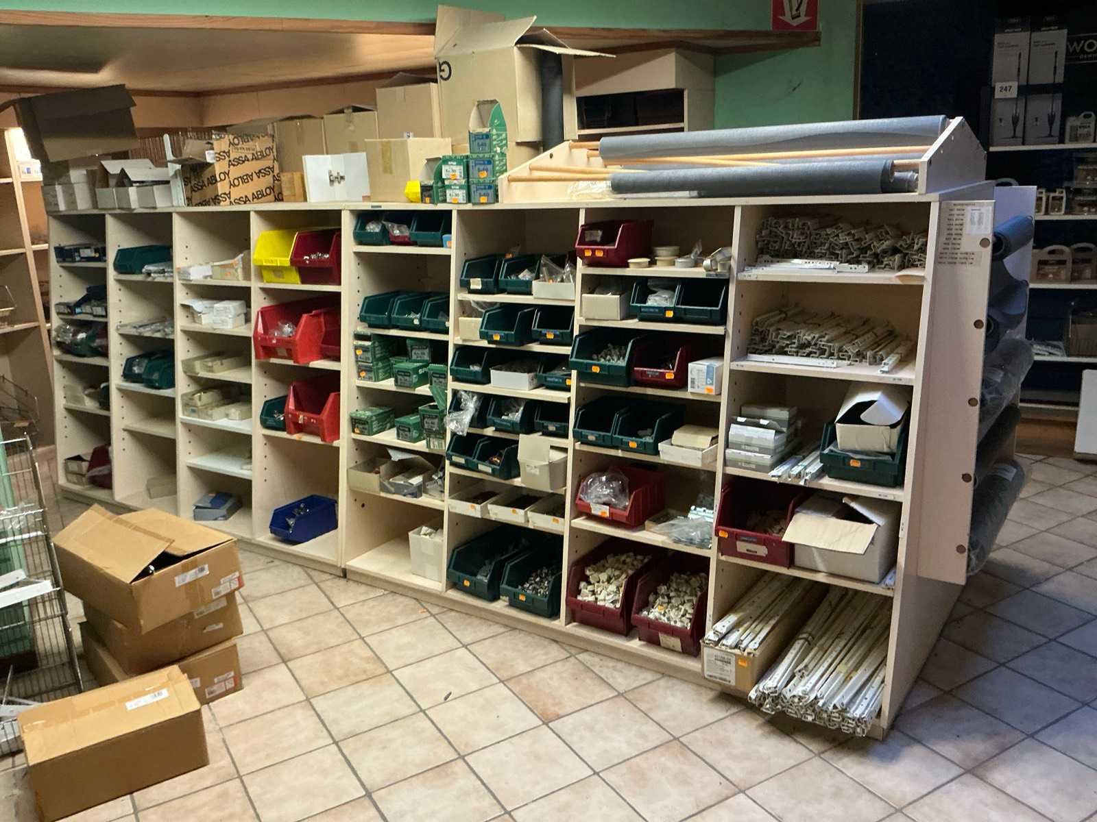 Waaronder bestaande uit: 2 jaloezieën Velux, 18 metalen grondpiketten, 4 houten schragen, 1 displaystaander inhoudende diverse deurklinken, Partij diverse kast- en ladeonderdelen, Enige bevestigingsmaterialen, deursloten, pvc bochten en koppelstukken, Waaronder liggende in dubbelzijdig houten opbergmeubel, Metalen overgangsproblemen, klauwklemmen, plintconnectoren, plaketten, afsluitkleppen en rosetonderdelen, Uitgezonderd genummerde kavels en eigendomsvoorbehoud, Afgifte volgens aanwijzing Nee Type: Restinhoud