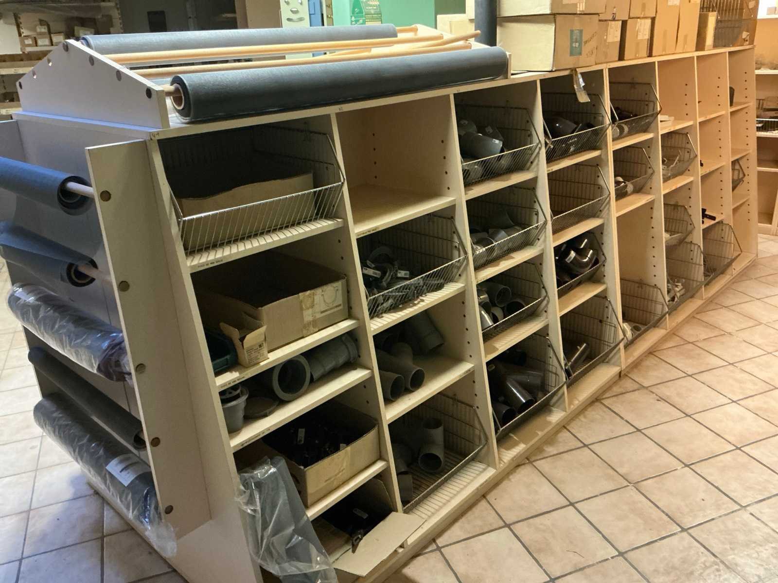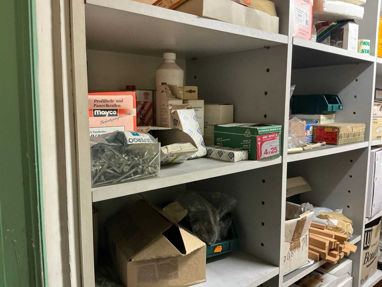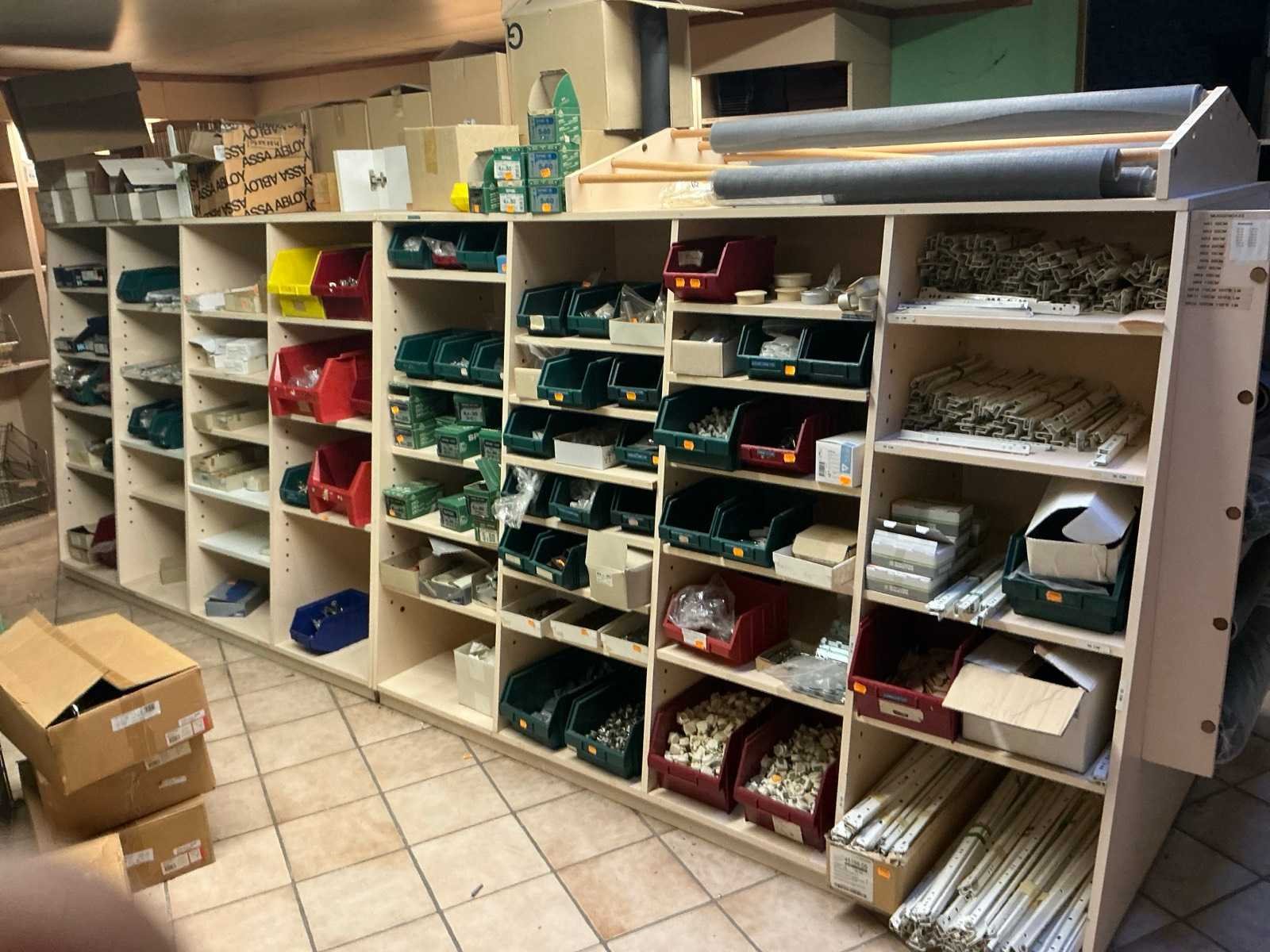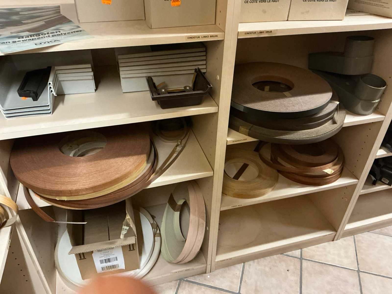 Waaronder bestaande uit: 2 jaloezieën Velux, 18 metalen grondpiketten, 4 houten schragen, 1 displaystaander inhoudende diverse deurklinken, Partij diverse kast- en ladeonderdelen, Enige bevestigingsmaterialen, deursloten, pvc bochten en koppelstukken, Waaronder liggende in dubbelzijdig houten opbergmeubel, Metalen overgangsproblemen, klauwklemmen, plintconnectoren, plaketten, afsluitkleppen en rosetonderdelen, Uitgezonderd genummerde kavels en eigendomsvoorbehoud, Afgifte volgens aanwijzing Nee Type: Restinhoud