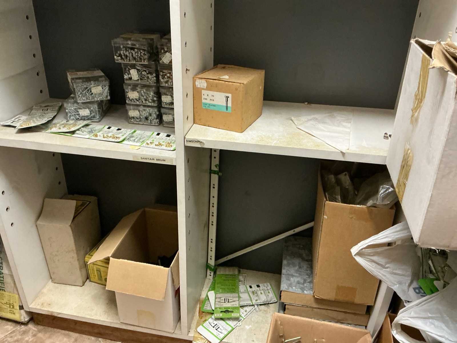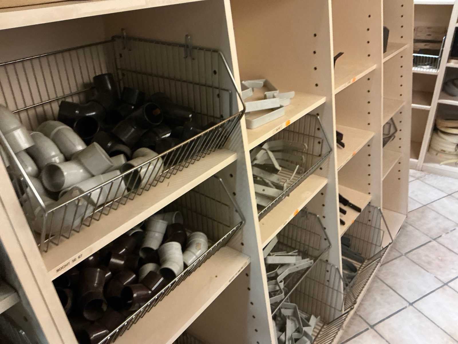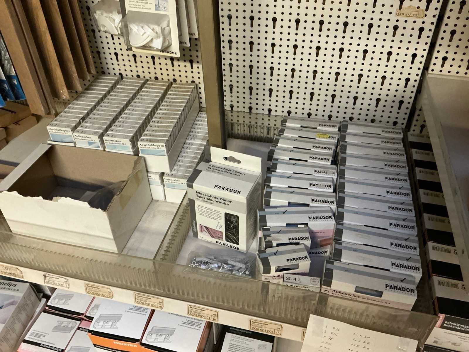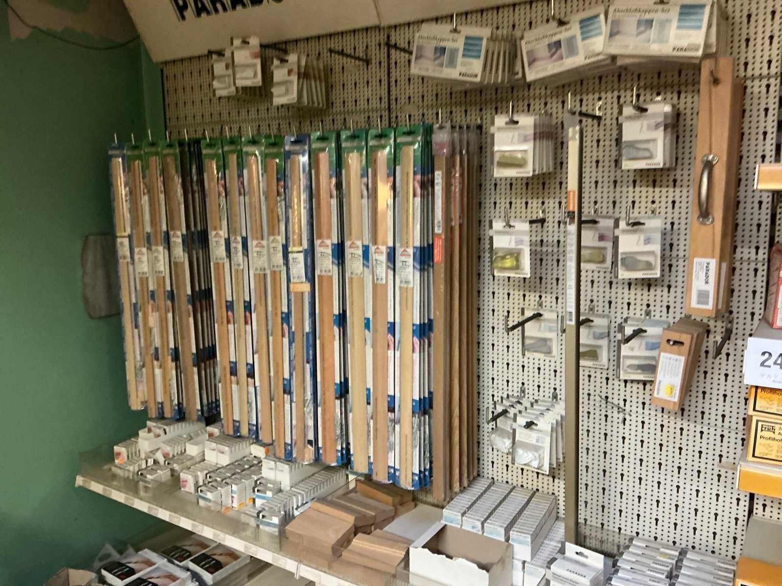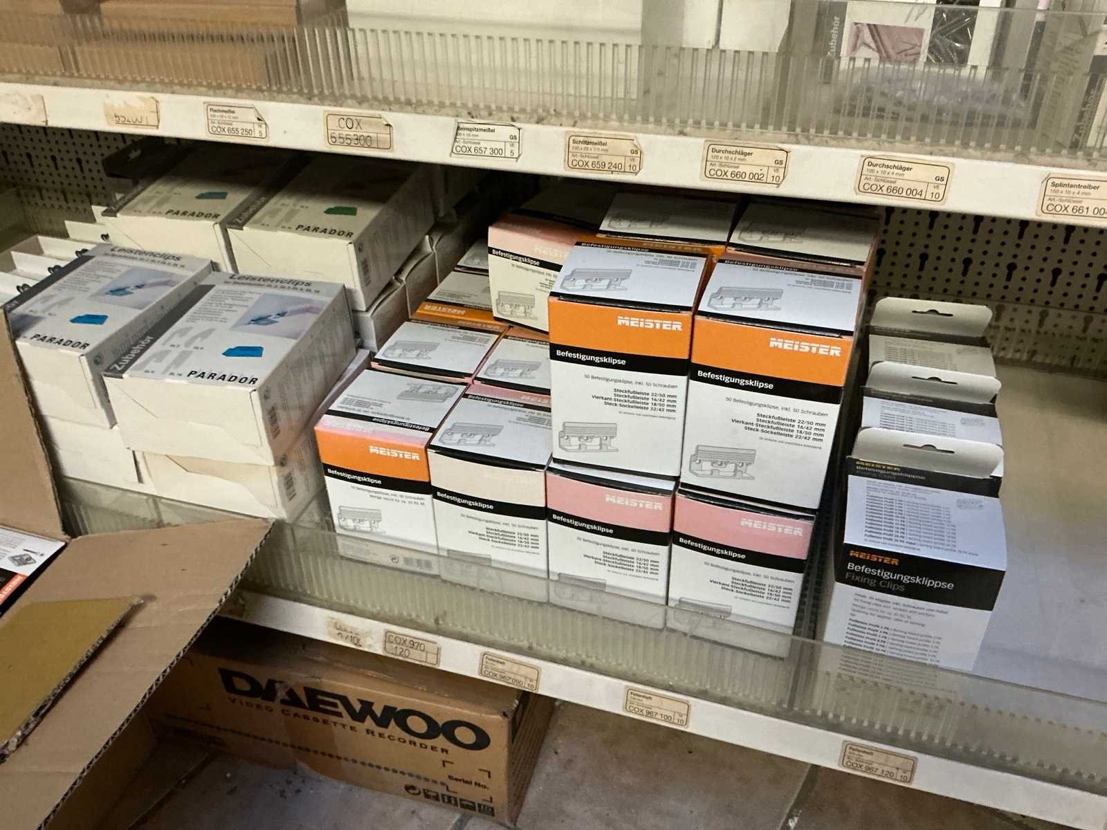 Waaronder bestaande uit: 2 jaloezieën Velux, 18 metalen grondpiketten, 4 houten schragen, 1 displaystaander inhoudende diverse deurklinken, Partij diverse kast- en ladeonderdelen, Enige bevestigingsmaterialen, deursloten, pvc bochten en koppelstukken, Waaronder liggende in dubbelzijdig houten opbergmeubel, Metalen overgangsproblemen, klauwklemmen, plintconnectoren, plaketten, afsluitkleppen en rosetonderdelen, Uitgezonderd genummerde kavels en eigendomsvoorbehoud, Afgifte volgens aanwijzing Nee Type: Restinhoud