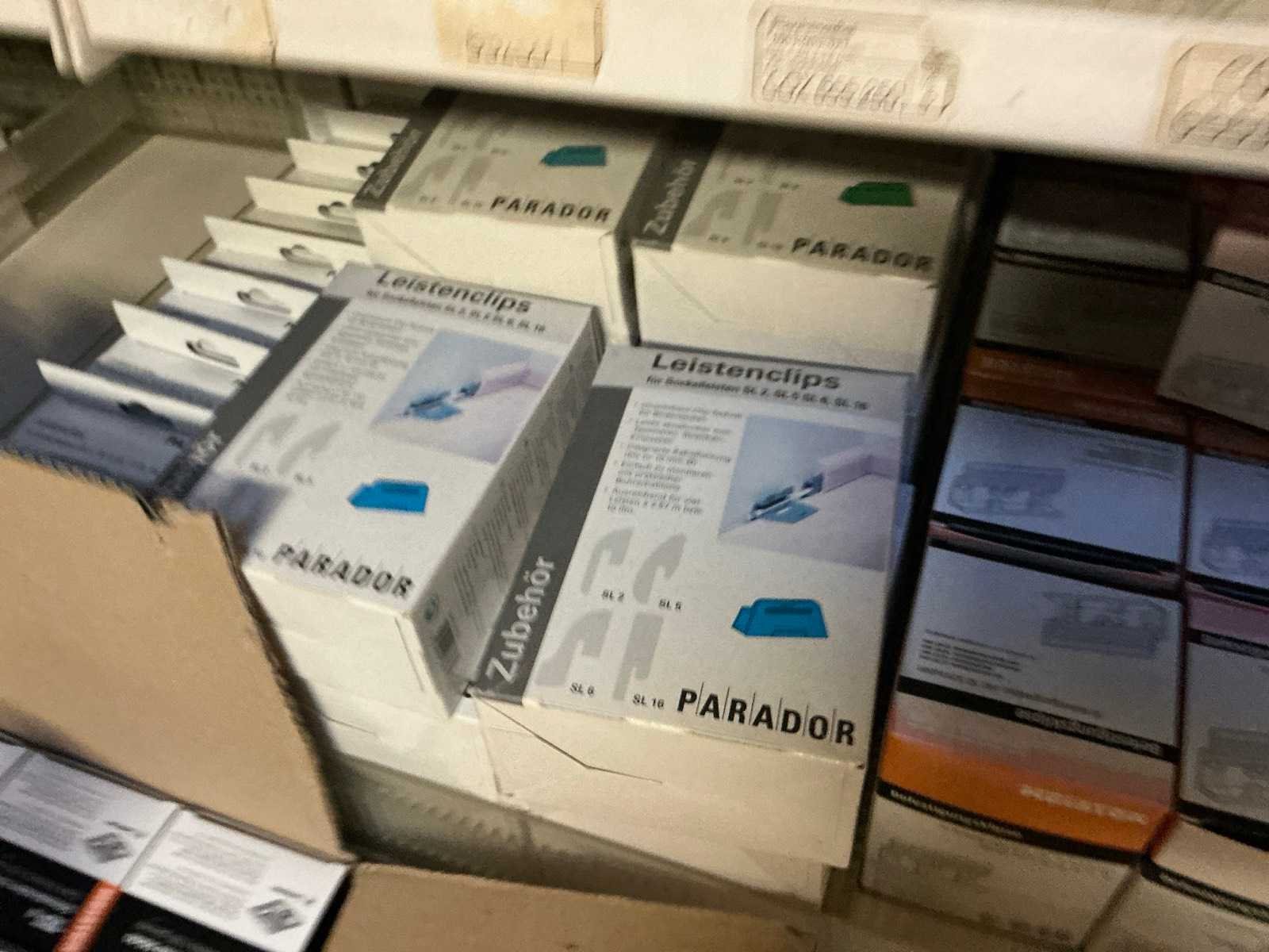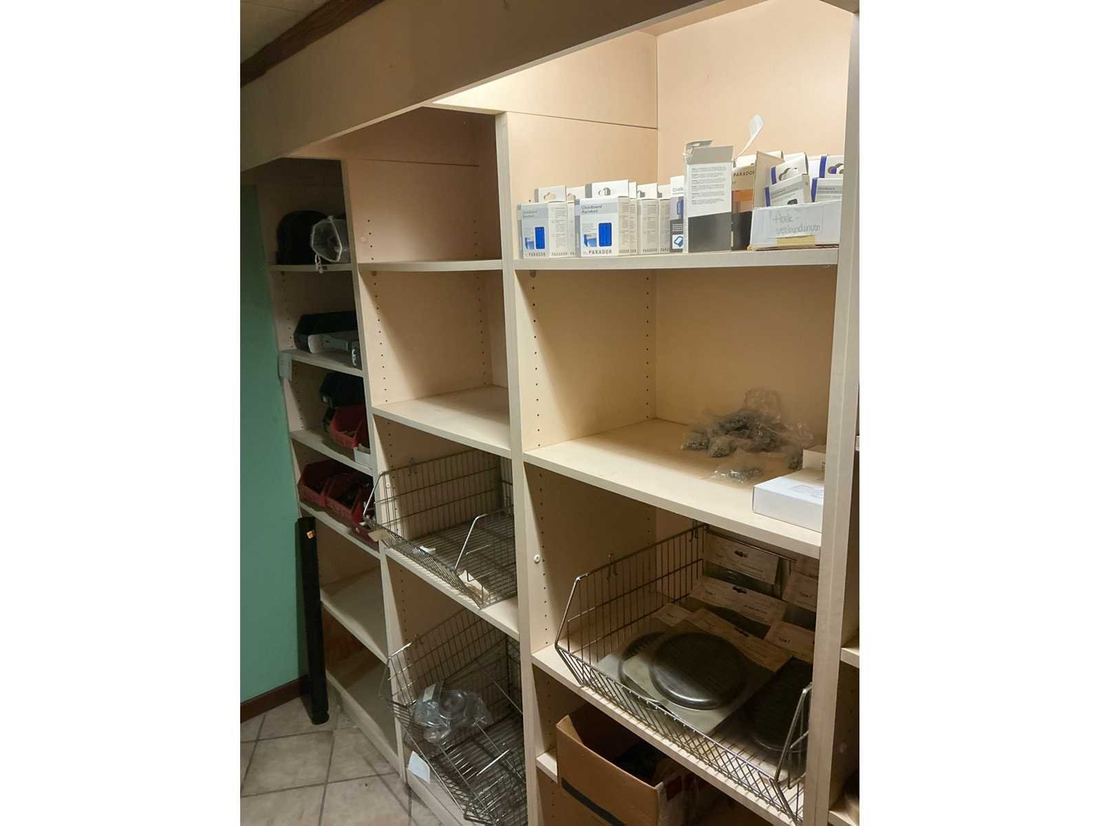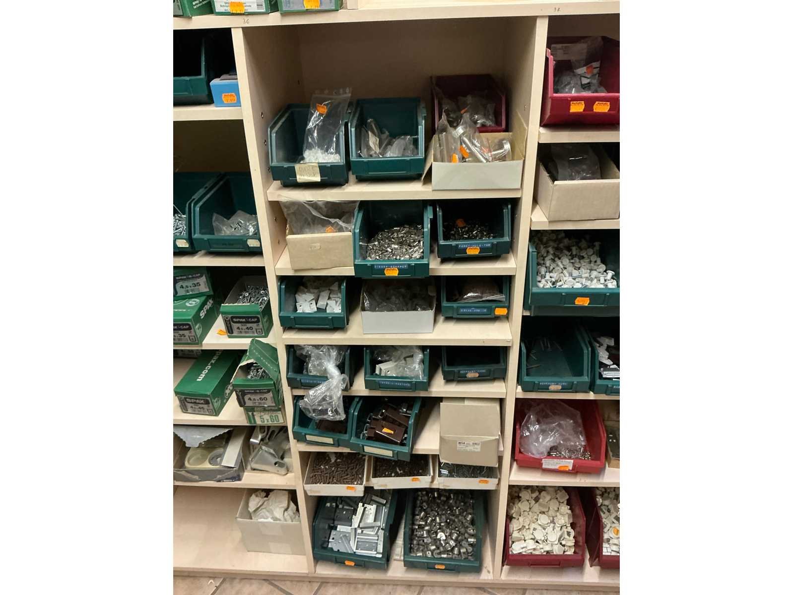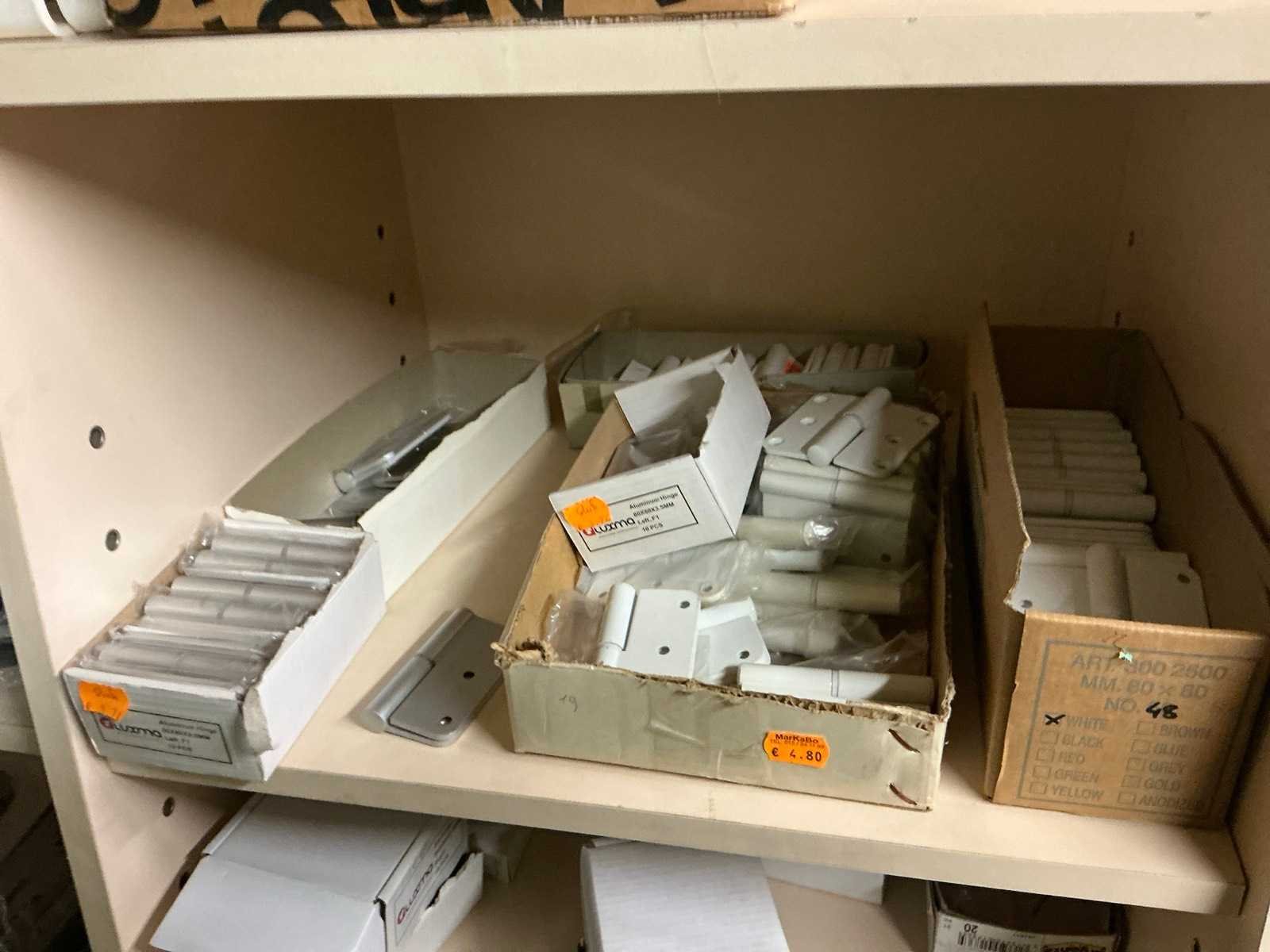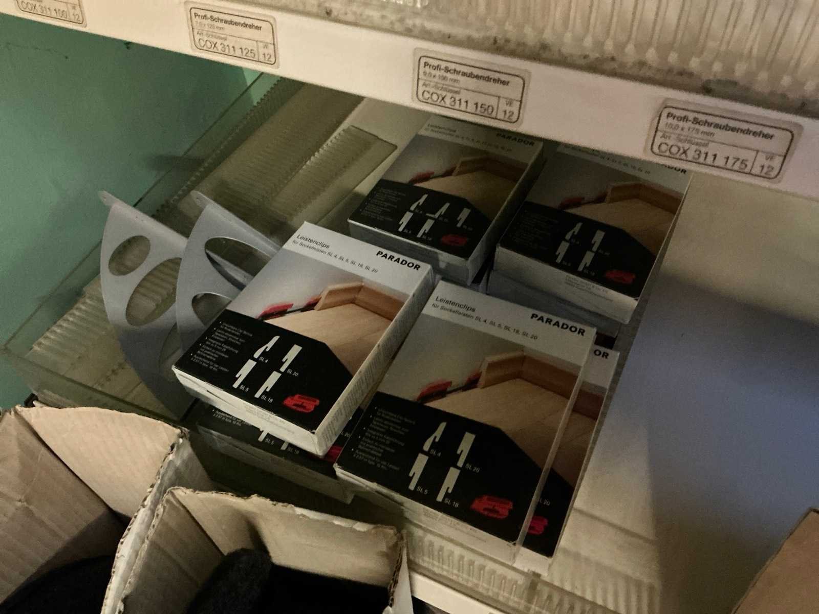 Waaronder bestaande uit: 2 jaloezieën Velux, 18 metalen grondpiketten, 4 houten schragen, 1 displaystaander inhoudende diverse deurklinken, Partij diverse kast- en ladeonderdelen, Enige bevestigingsmaterialen, deursloten, pvc bochten en koppelstukken, Waaronder liggende in dubbelzijdig houten opbergmeubel, Metalen overgangsproblemen, klauwklemmen, plintconnectoren, plaketten, afsluitkleppen en rosetonderdelen, Uitgezonderd genummerde kavels en eigendomsvoorbehoud, Afgifte volgens aanwijzing Nee Type: Restinhoud