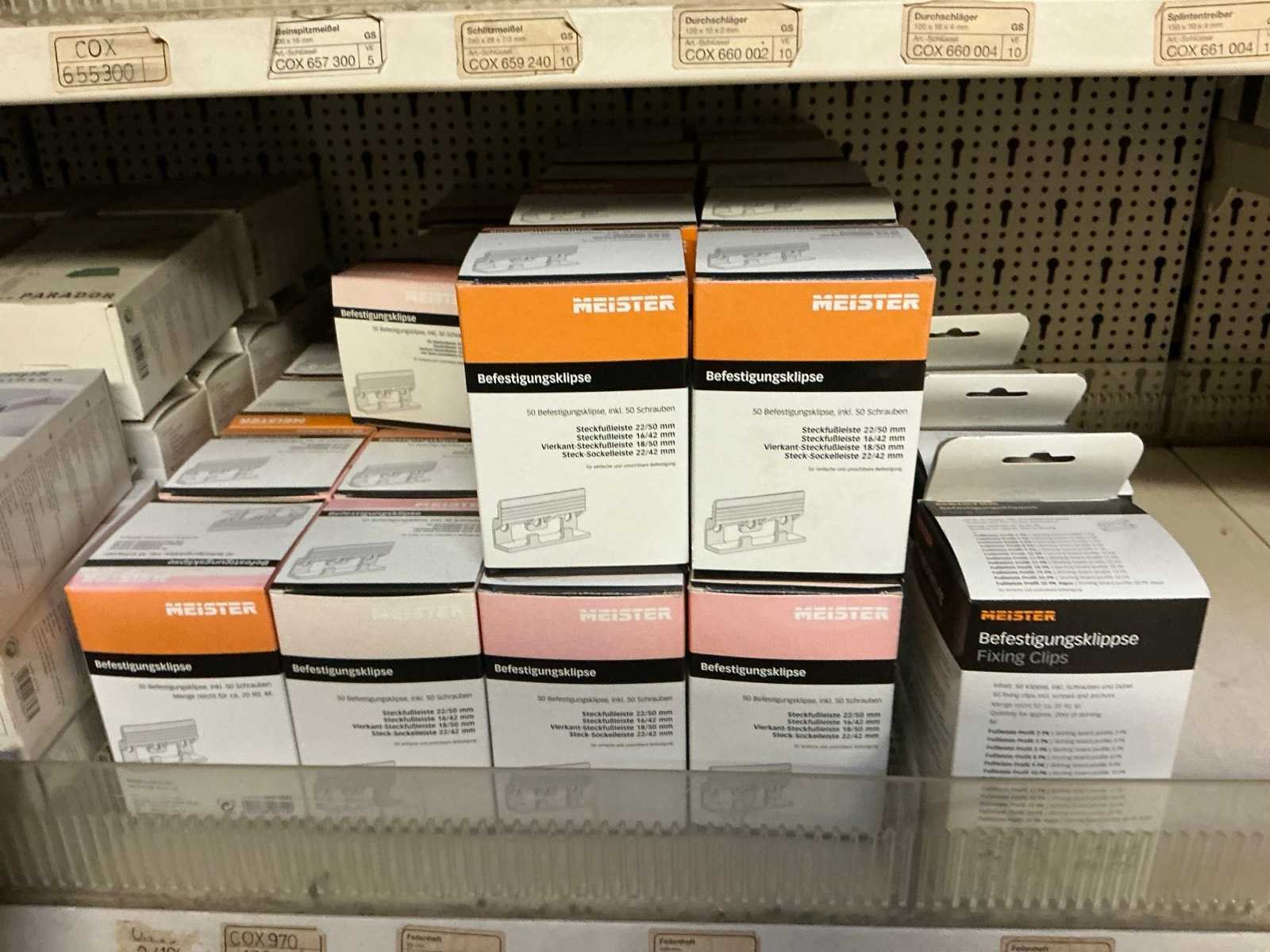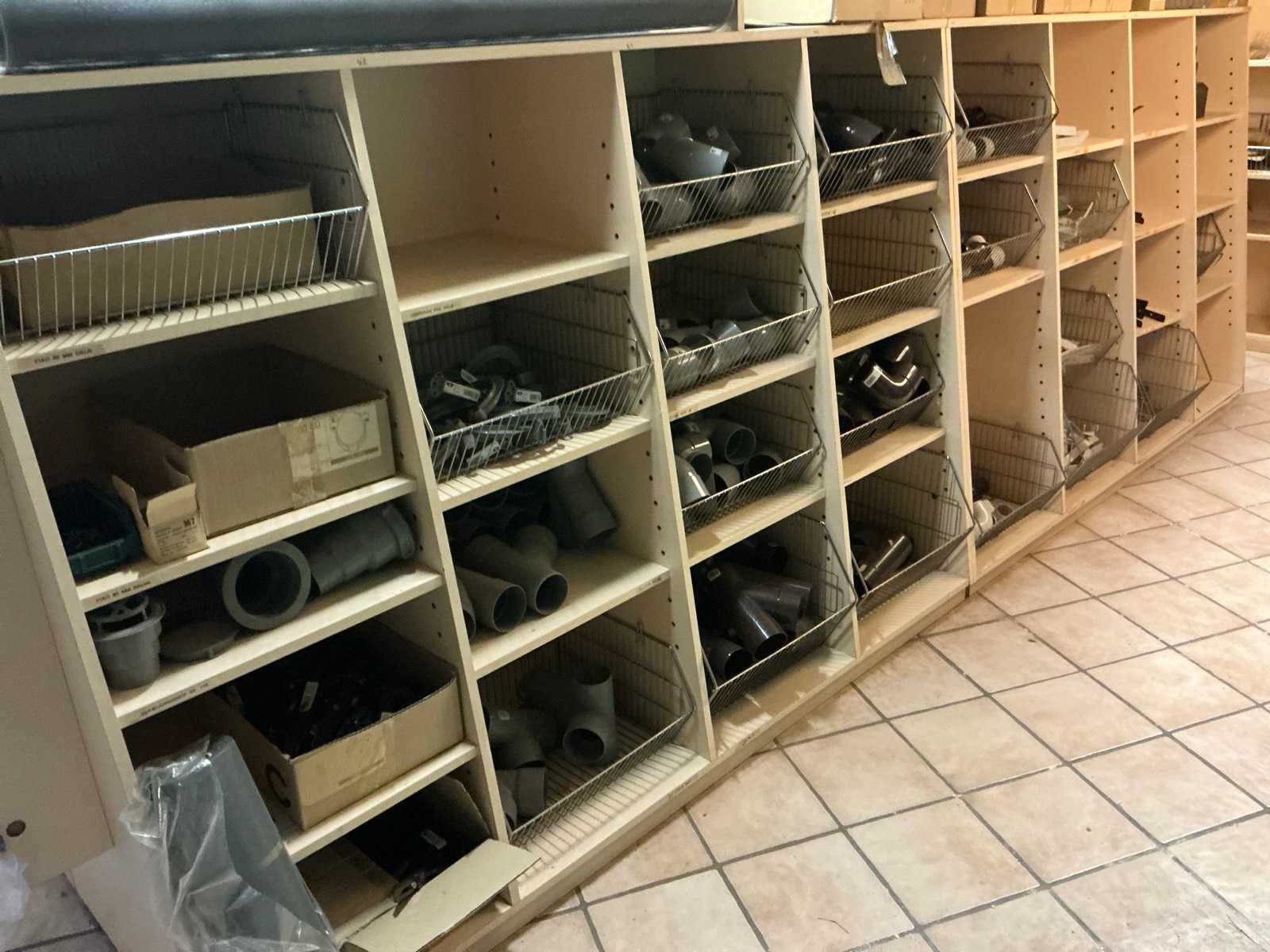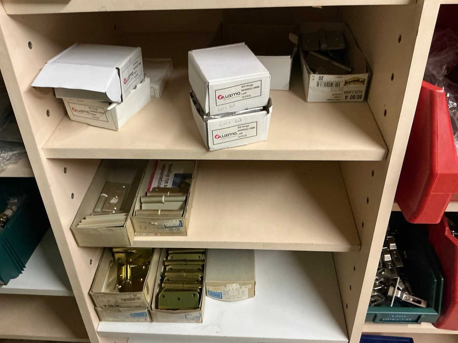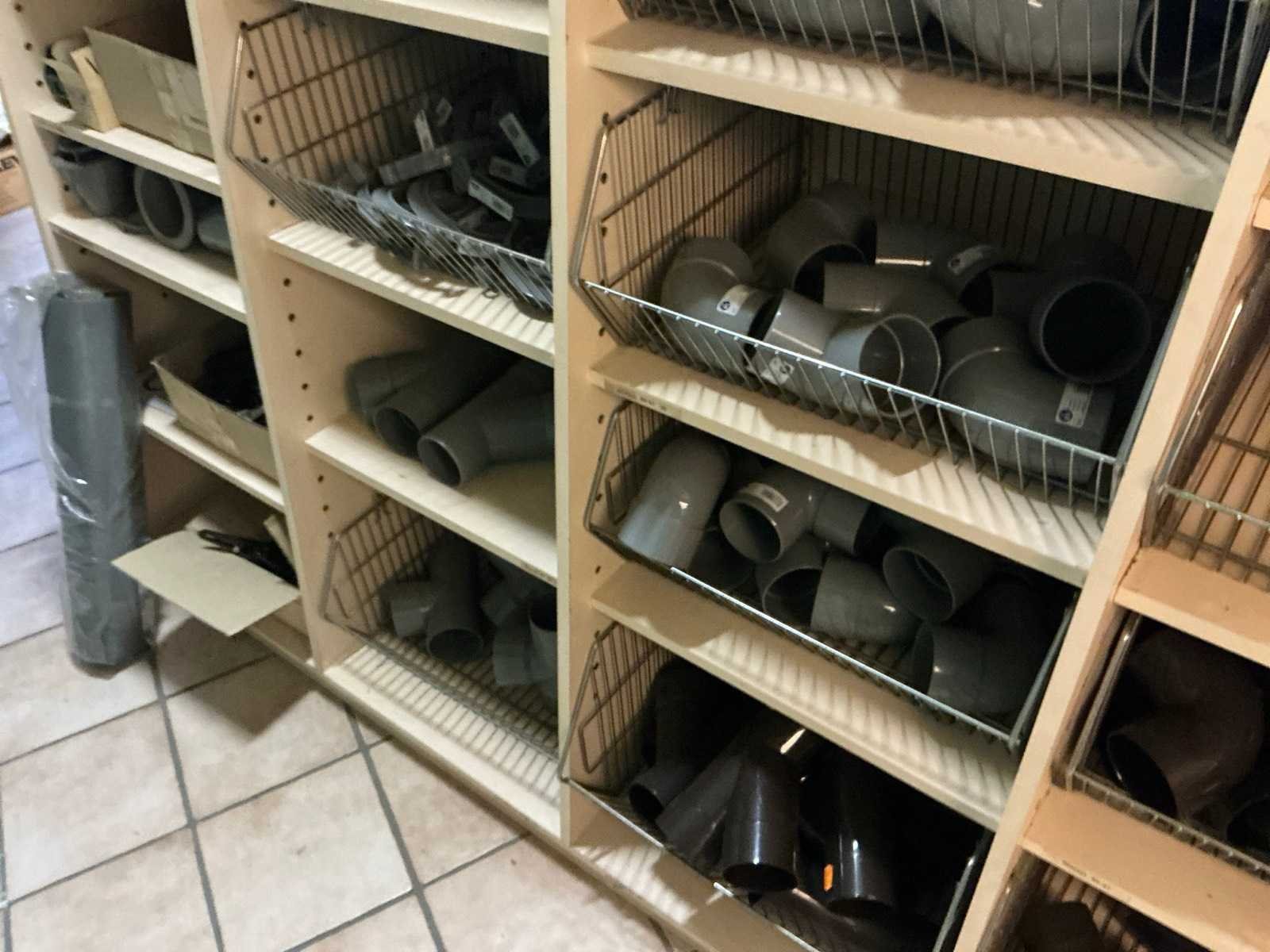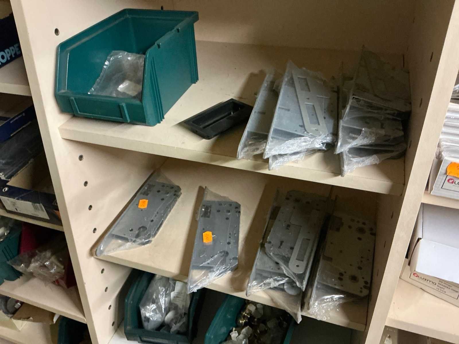 Waaronder bestaande uit: 2 jaloezieën Velux, 18 metalen grondpiketten, 4 houten schragen, 1 displaystaander inhoudende diverse deurklinken, Partij diverse kast- en ladeonderdelen, Enige bevestigingsmaterialen, deursloten, pvc bochten en koppelstukken, Waaronder liggende in dubbelzijdig houten opbergmeubel, Metalen overgangsproblemen, klauwklemmen, plintconnectoren, plaketten, afsluitkleppen en rosetonderdelen, Uitgezonderd genummerde kavels en eigendomsvoorbehoud, Afgifte volgens aanwijzing Nee Type: Restinhoud
