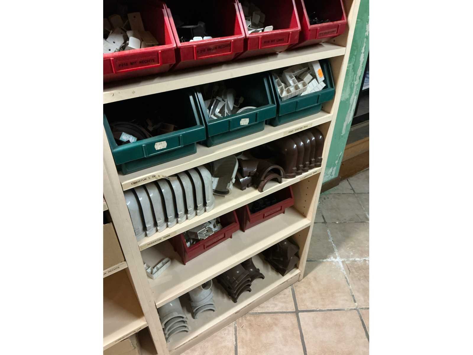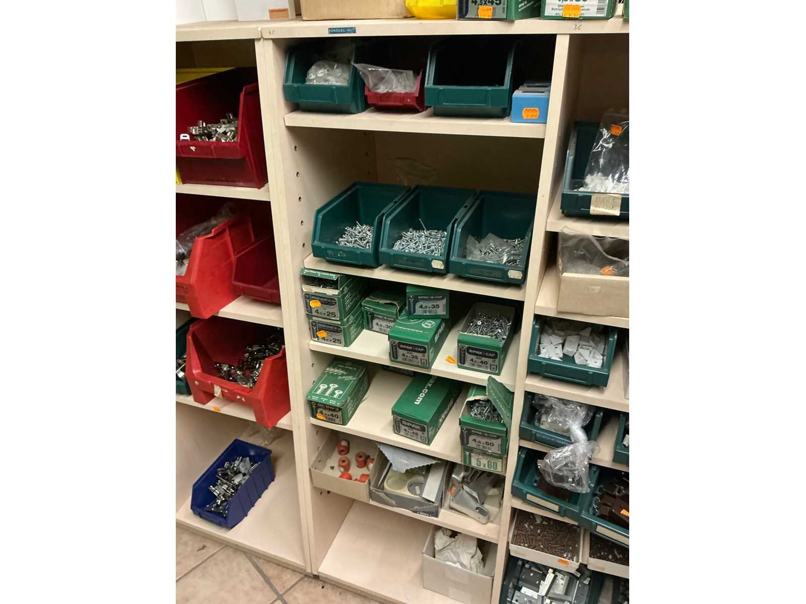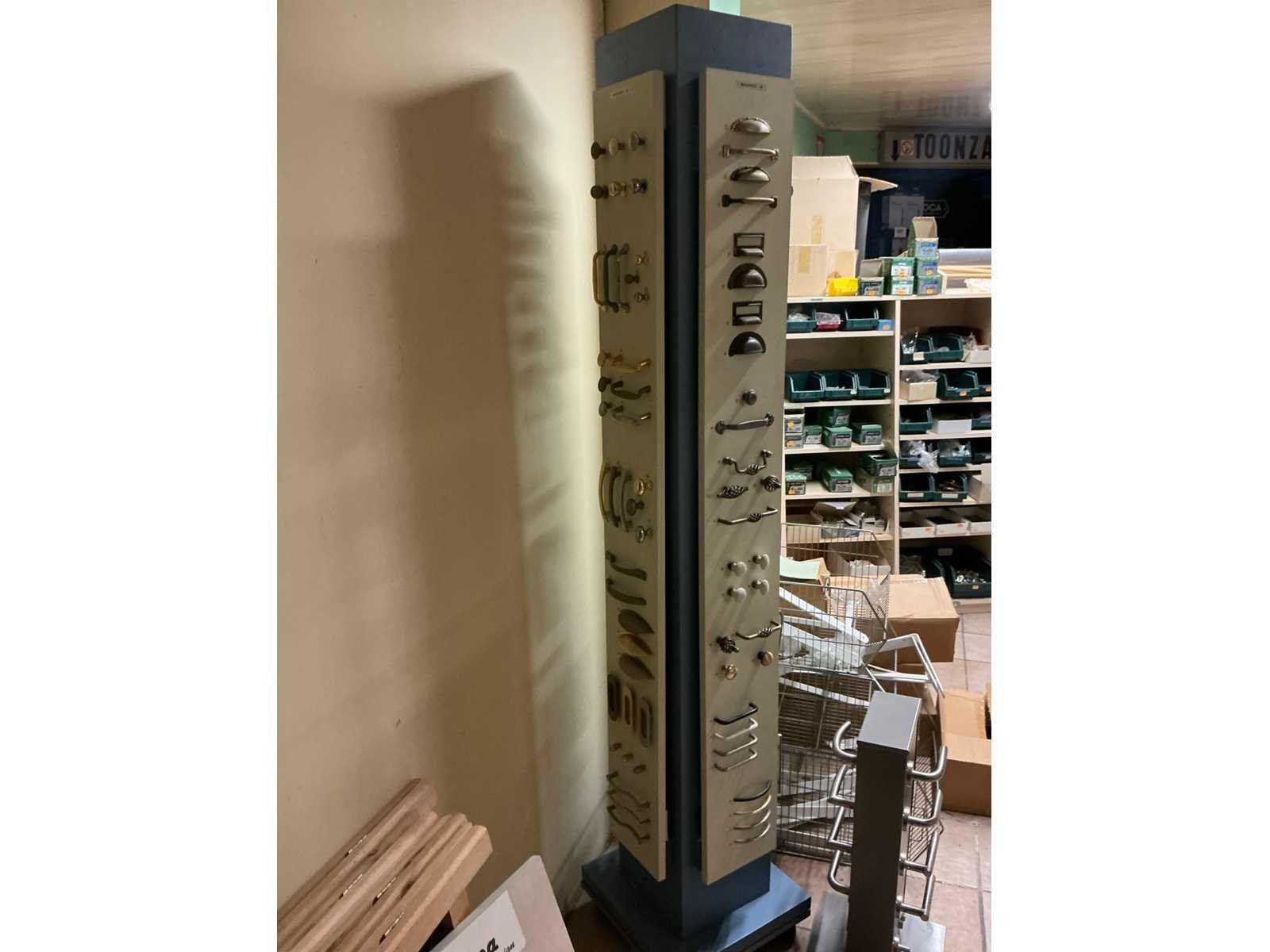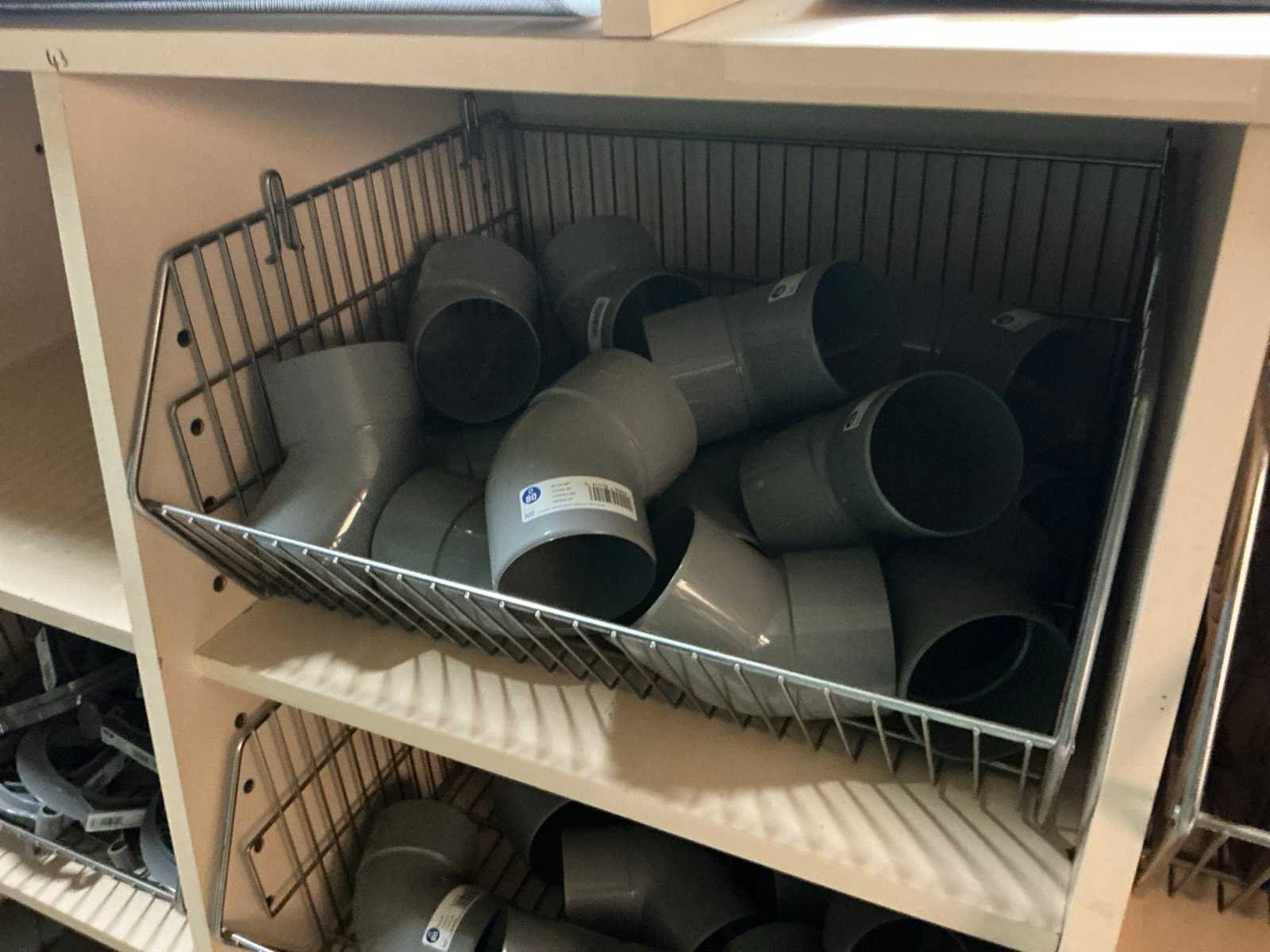 Waaronder bestaande uit: 2 jaloezieën Velux, 18 metalen grondpiketten, 4 houten schragen, 1 displaystaander inhoudende diverse deurklinken, Partij diverse kast- en ladeonderdelen, Enige bevestigingsmaterialen, deursloten, pvc bochten en koppelstukken, Waaronder liggende in dubbelzijdig houten opbergmeubel, Metalen overgangsproblemen, klauwklemmen, plintconnectoren, plaketten, afsluitkleppen en rosetonderdelen, Uitgezonderd genummerde kavels en eigendomsvoorbehoud, Afgifte volgens aanwijzing Nee Type: Restinhoud