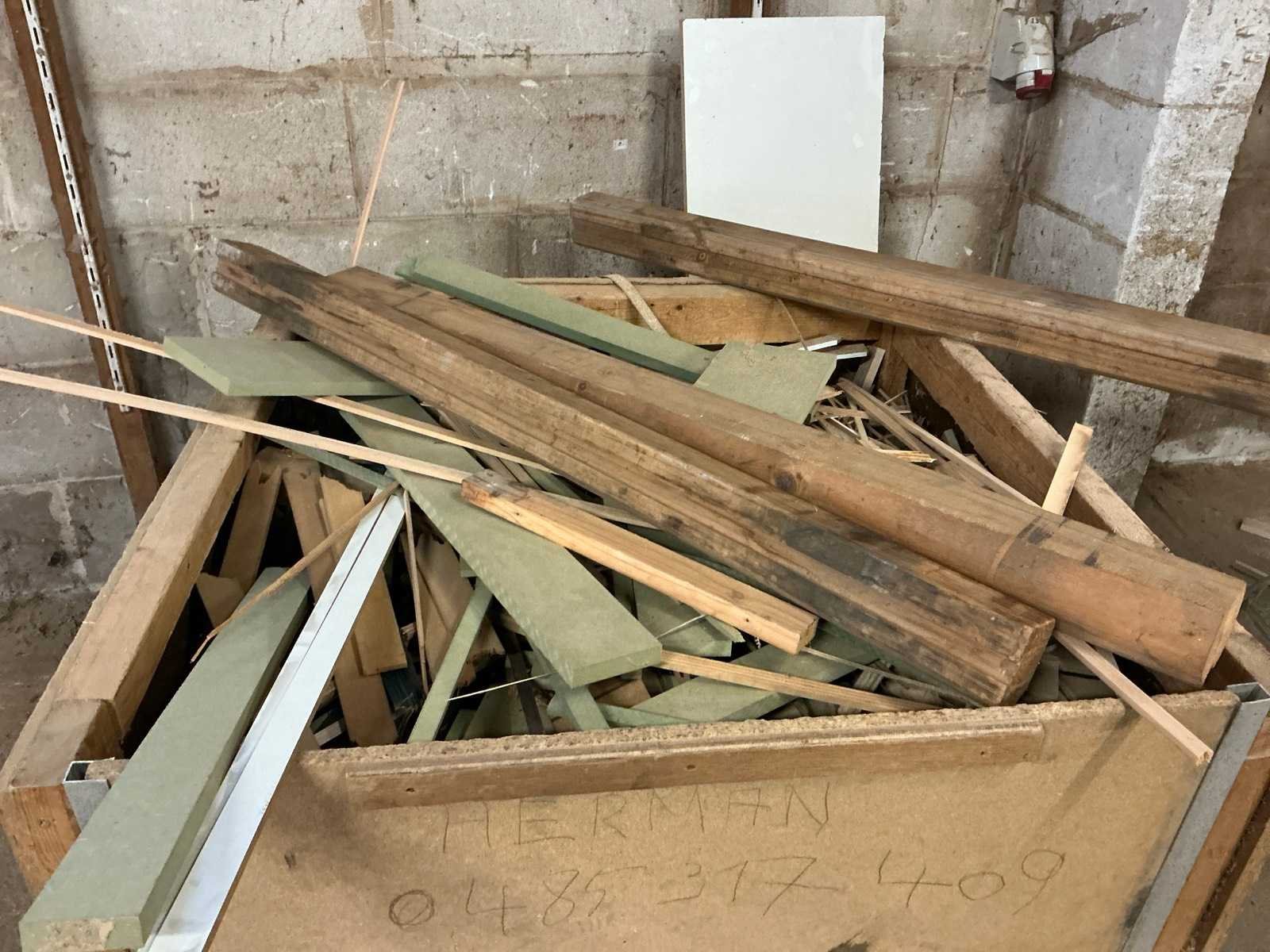 Waaronder triplex, pdf waaronder afmeting circa 155 x 97 cm , 60 x 92 cm, 25 x 305 cm, enzovoort en enig houtrestanten waaronder liggende in houten kist van 100x 100 x 90 cm, waaronder afmeting circa 155 x 97 cm , 60 x 92 cm, 25 x 305 cm, enzovoort, afgifte volgens aanwijzing Nee