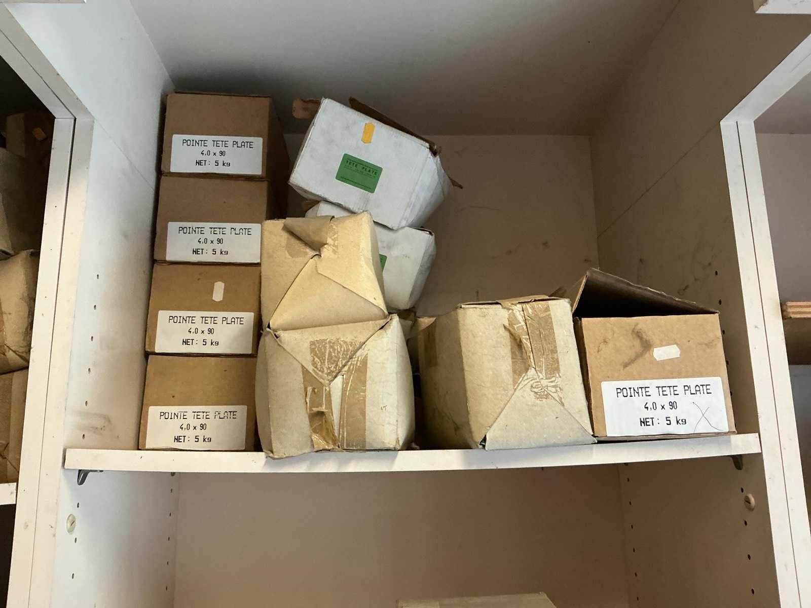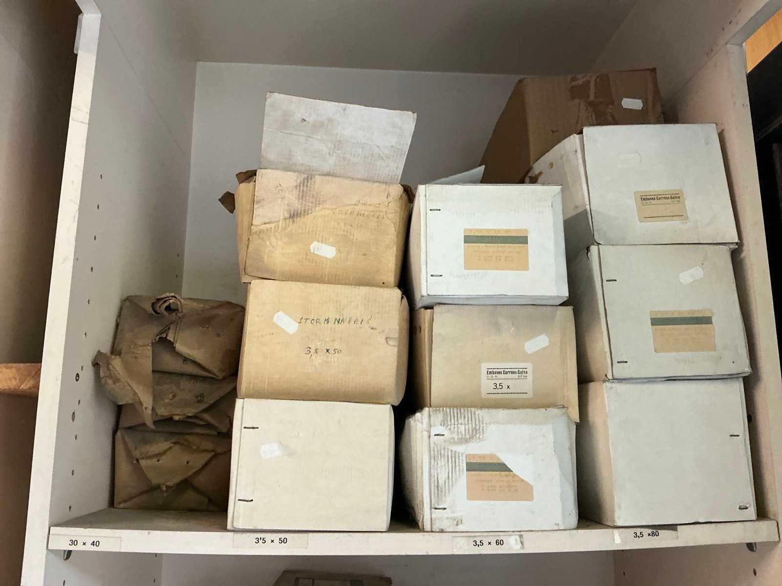 Wandkast getekend SIGMA COATINGS, compleet met partij divers bevestigingsmateriaal, voornamelijk nagels waaronder inox, ijzer en koper, waaronder TE. POINTES, TREFILEUROPE, waaronder verschillende soorten nagels, enige pvc siliconepunten, enzovoort in diverse maten. No