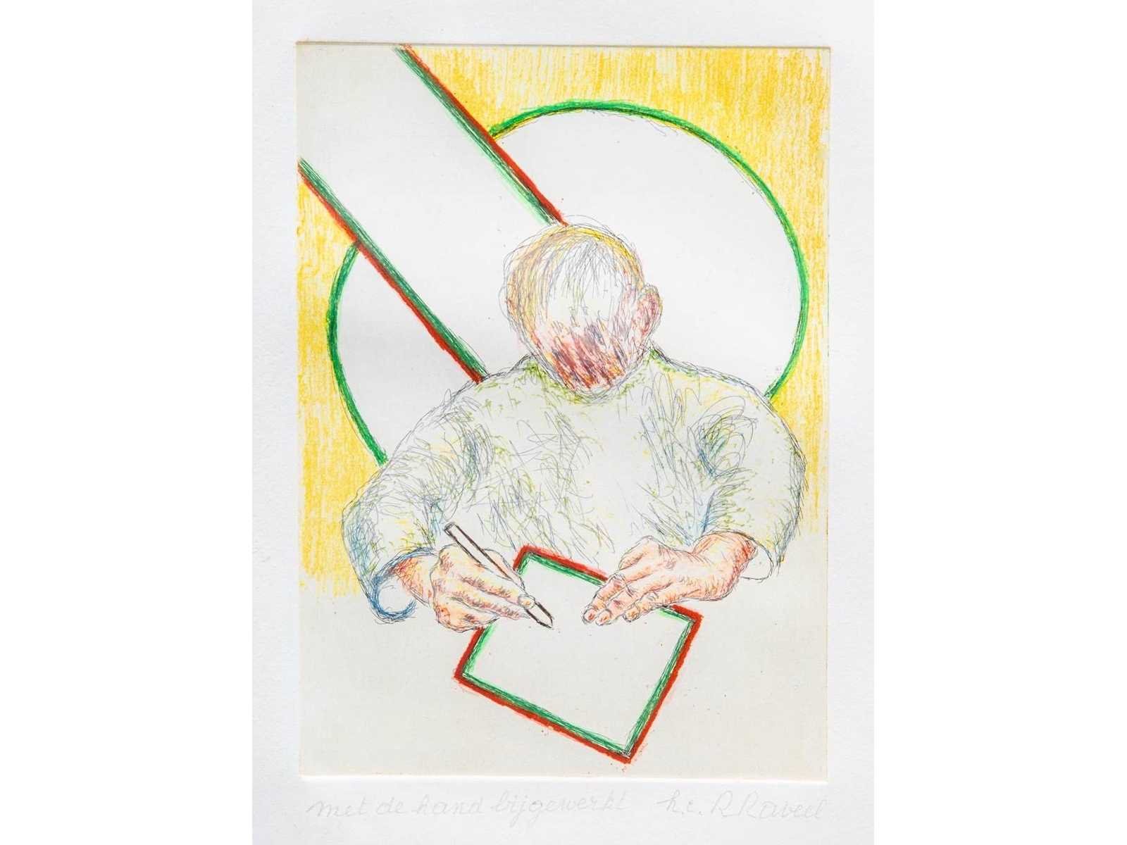 Uniek met de hand bijgewerkte ets - Professioneel ingelijst - met certificaat - galerieprijs: 4.500 € Nee Kunstenaar: Roger Raveel Titel van werk: Tegenover het vlak Periode: 1973 Techniek: Ets, met de hand bijgewerkt Handtekening/oplage: true Oplage: H.C. (hors commerce) Gesigneerd: Gesigneerd en geannoteerd Hoogte: 35cm Breedte: 26cm Hoogte incl. lijst: 73cm Breedte incl. lijst: 63cm Frame: true