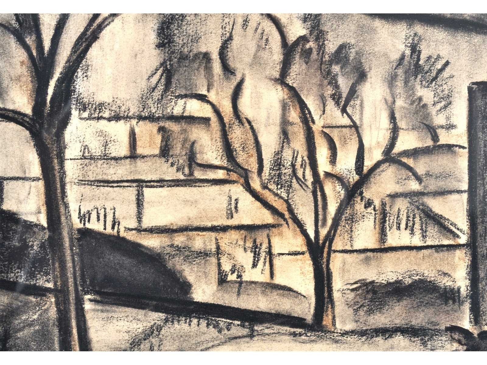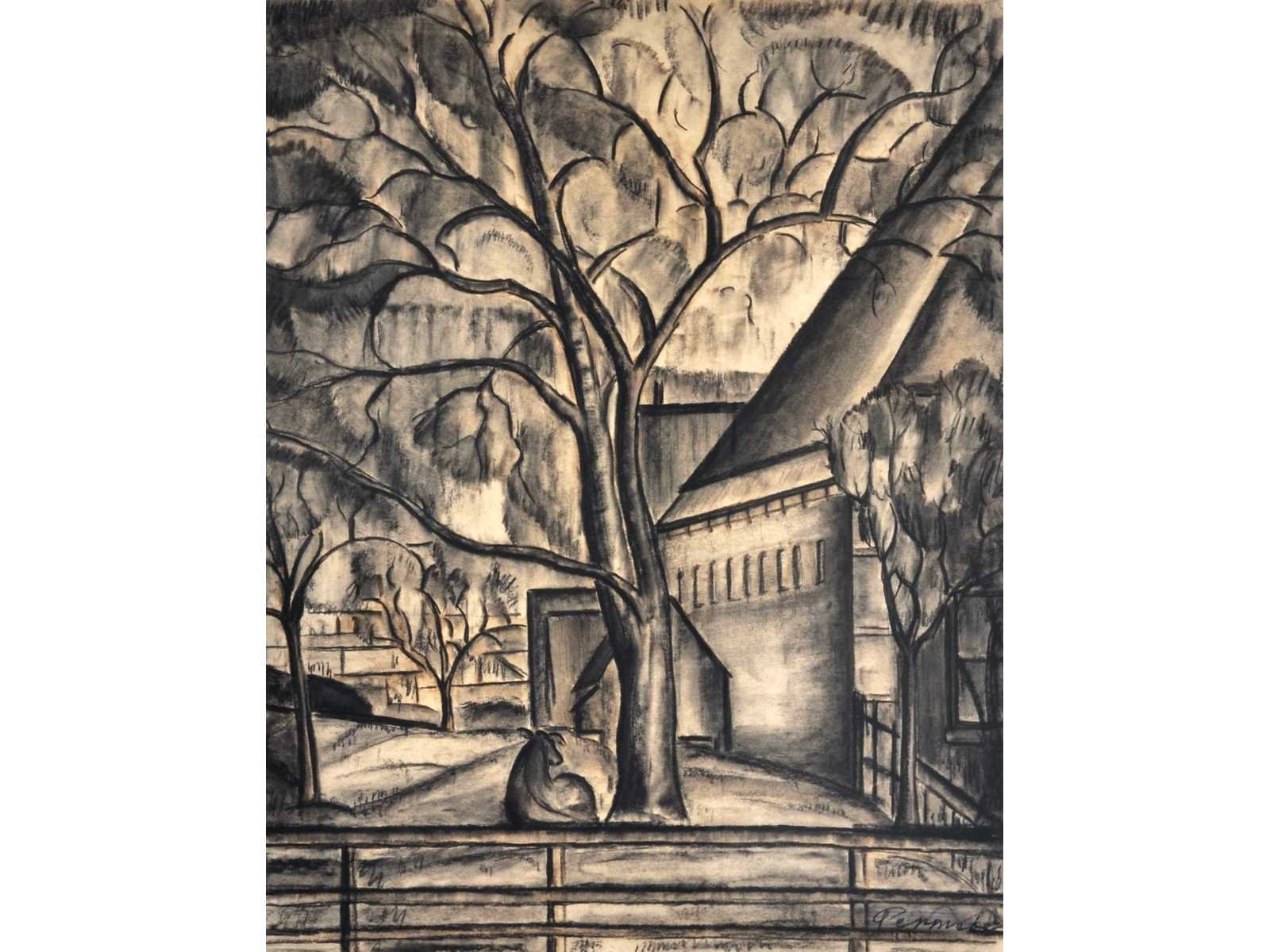 Constant permeke - hoeve tussen de bomen met koe - houtskool en rood krijt