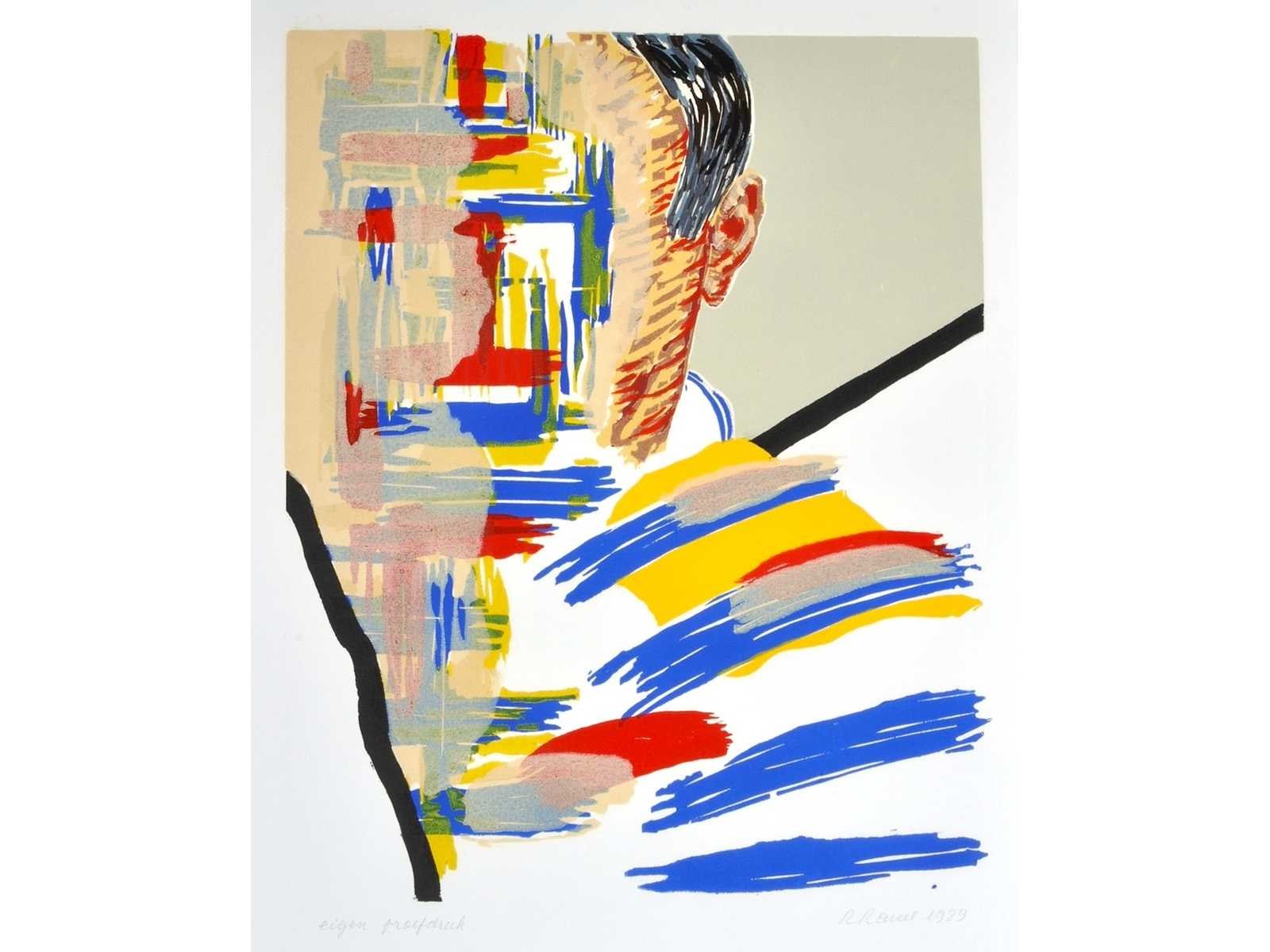 Enig exemplaar: een door Roger Raveel vervaardigde "Eigen proefdruk" - Uitgever: Algemene Bank Nederland nv - met certificaat - galerieprijs: 3.500 euro Nee Kunstenaar: Roger Raveel Titel van werk: Zelfportret en een abstractie Datering: 1989 Techniek: kleurenhoutsnede Handtekening/oplage: true Oplage: Eigen proefdruk Gesigneerd: Gesigneerd en geannoteerd Hoogte: 66cm Breedte: 51cm Frame: true
