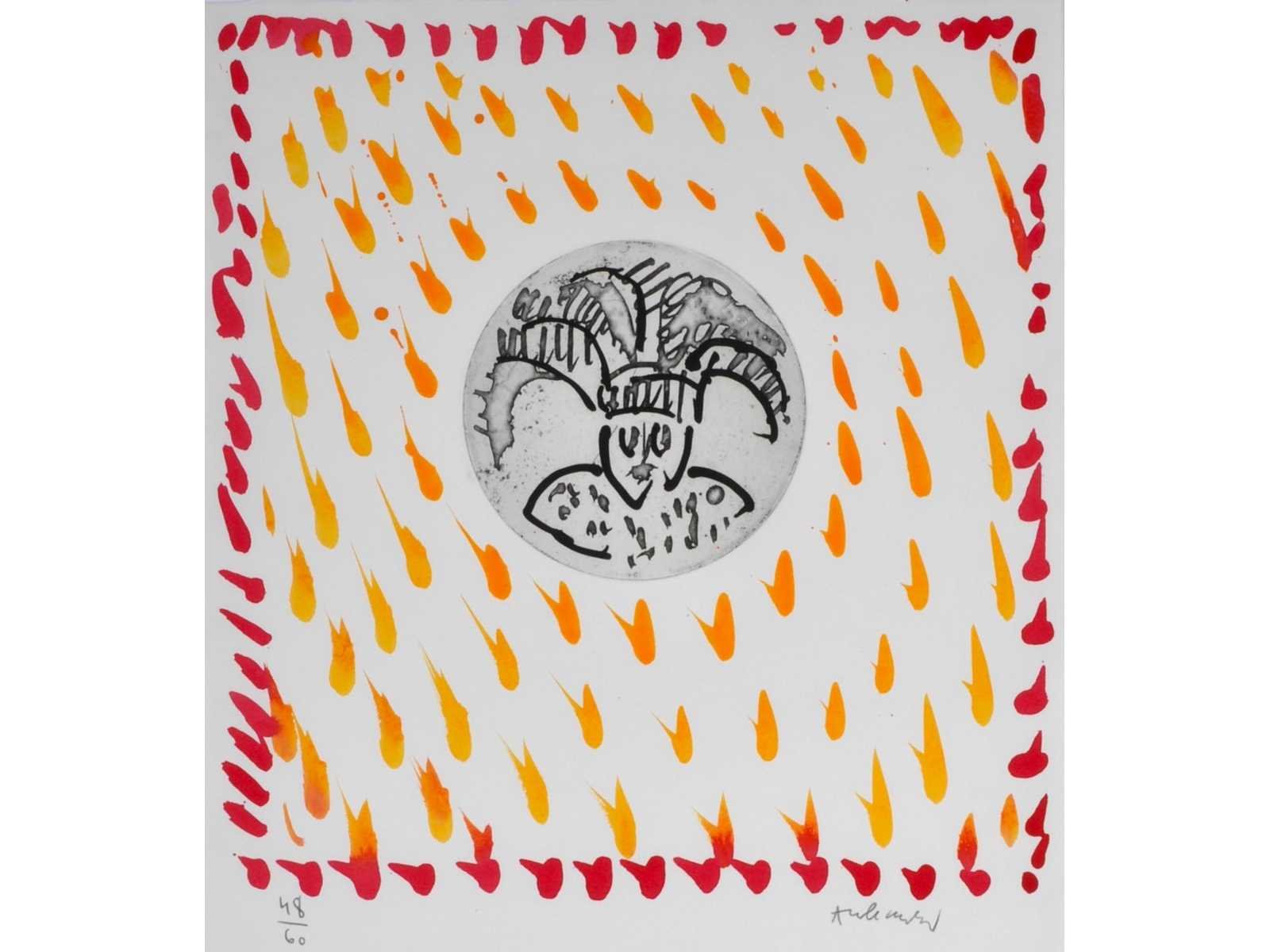 Gemengde techniek: ets met een boord van aquarel - uitgever: Kunstforum, Schelderode - Professioneel ingelijst met museumglas Nee Kunstenaar: Pierre Alechinsky (Brussel, 1927) Titel van werk: Gille Techniek: Geaquarelleerde ets Handtekening/oplage: true Oplage: 60 exemplaren Gesigneerd: Gesigneerd en genummerd Hoogte: 56cm Breedte: 39cm Hoogte incl. lijst: 80cm Breedte incl. lijst: 61,5cm Frame: true