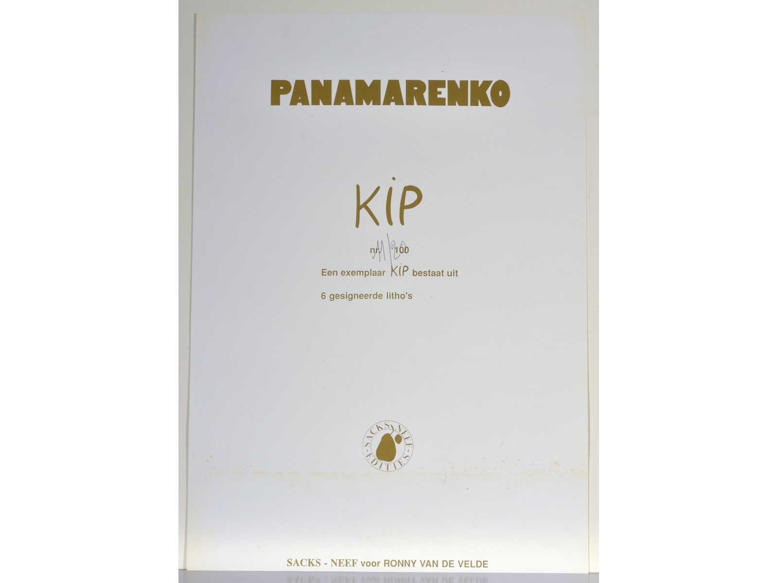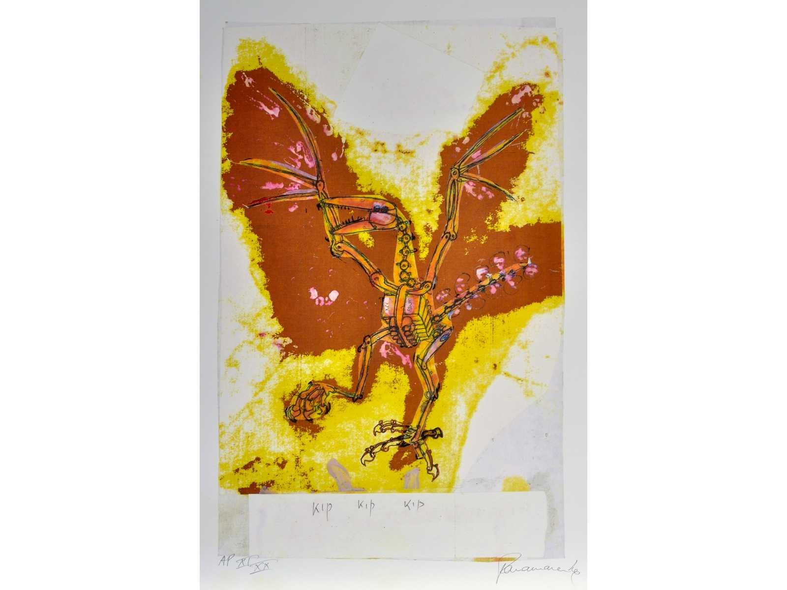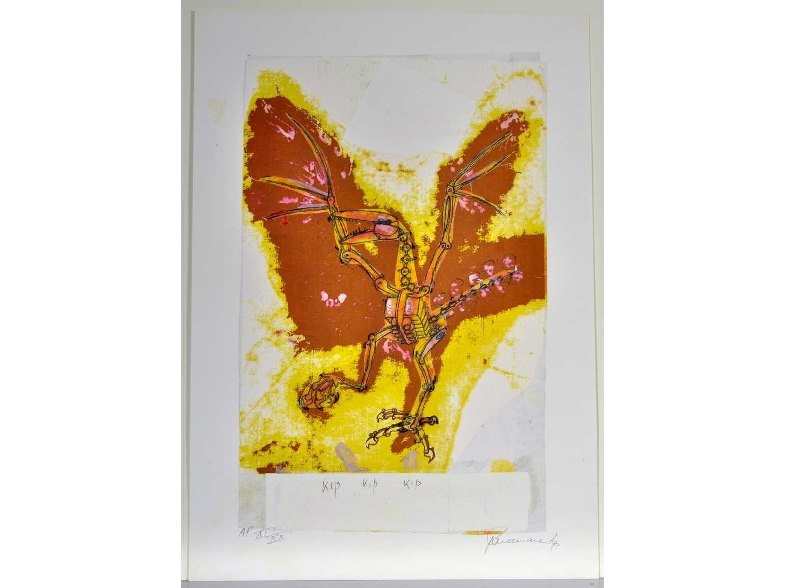 Originele zeefdruk van Panamarenko - licht bevlekt in de witte marge links boven (volledig weg te werken met passe-partout) - Bijgevoegd: de originele map van de uitgave (bevlekt) - galerieprijs: 3.000 € Nee Kunstenaar: Panamarenko (Antwerpen 1940-2019) Titel van werk: De kip Periode: 1990 Techniek: zeefdruk Handtekening/oplage: true Oplage: AP XI/XX Gesigneerd: gesigneerd, genummerd en gedateerd Hoogte: 54cm Breedte: 38cm