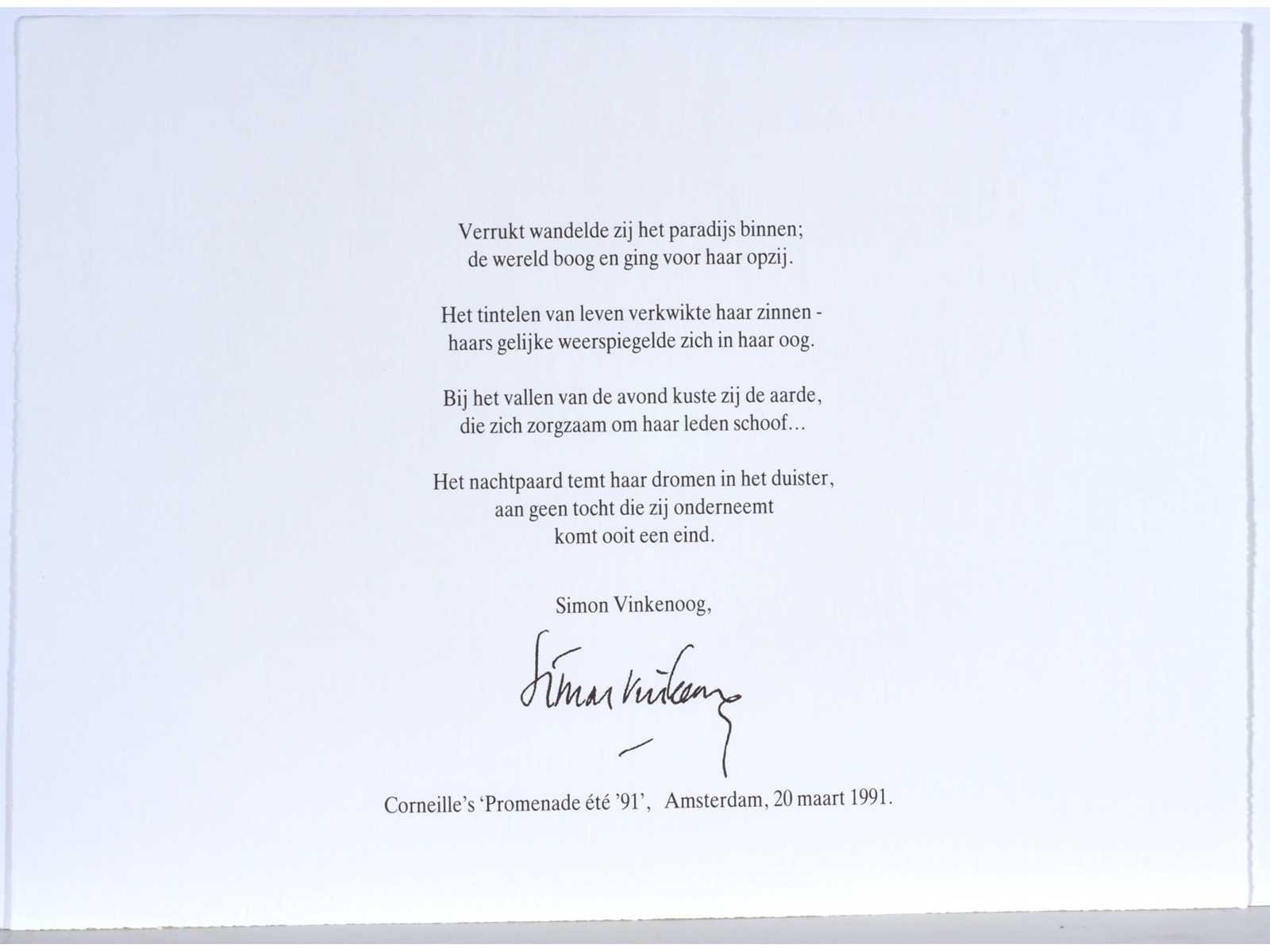 Portfolio met vier litho's - met een gedicht door Simon Vinkenoog - uitgave: Jaski Art Gallery - compleet en puntgaaf exemplaar Nee Kunstenaar: Guillaume Corneille (1922 – 2010) Titel van werk: Promenade Datering: 1991 Techniek: Kleurenlithografie Handtekening/oplage: true Oplage: 6/200 Gesigneerd: Gesigneerd en genummerd Hoogte: 40,5cm Breedte: 55cm Frame: false