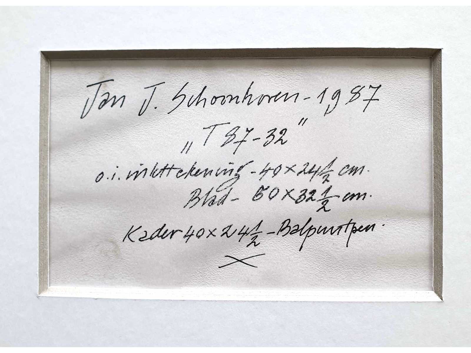 Origineel werk - specificaties ook vermeld verso - ingelijst - galerieprijs: 4.500 euro Nee Kunstenaar: Jan Schoonhoven Titel van werk: T87-32 Datering: 1987 Techniek: Oost-Indische inkt op papier Handtekening/oplage: true Oplage: Origineel Gesigneerd: Gesigneerd, gedateerd en getiteld Hoogte: 50cm Breedte: 32cm Hoogte incl. lijst: 69cm Breedte incl. lijst: 52cm Frame: true