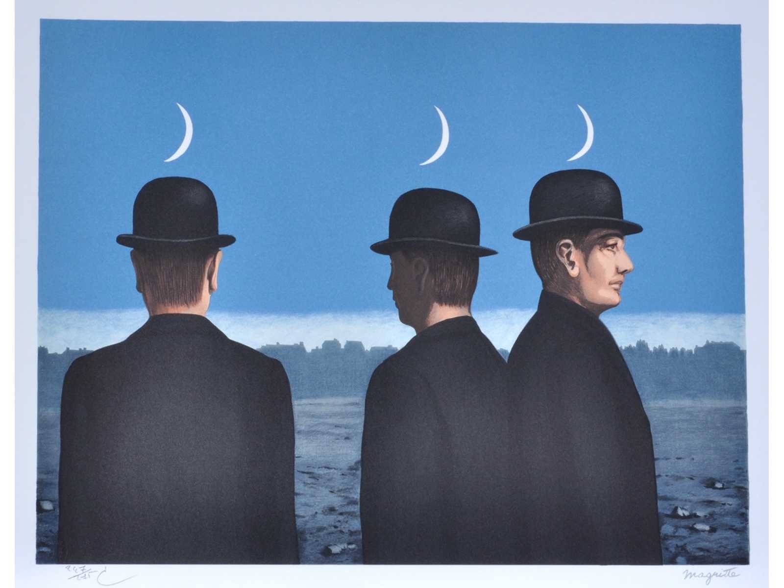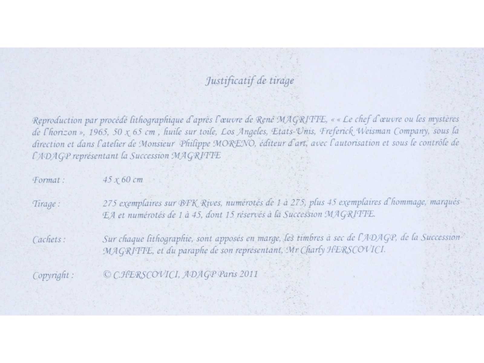 Lithografie naar werk van René Magritte, Voorzien van de droogsptempel van ADAGP en van de Succession Magritte alsook de paraf van Charly Herscovice Nee Kunstenaar: René Magritte (1898 – 1967) Titel van werk: Le chef d’œuvre ou les mystères de l’horizon ( 1965 ) Oplage: 129/275 Hoogte: 45cm Breedte: 60cm