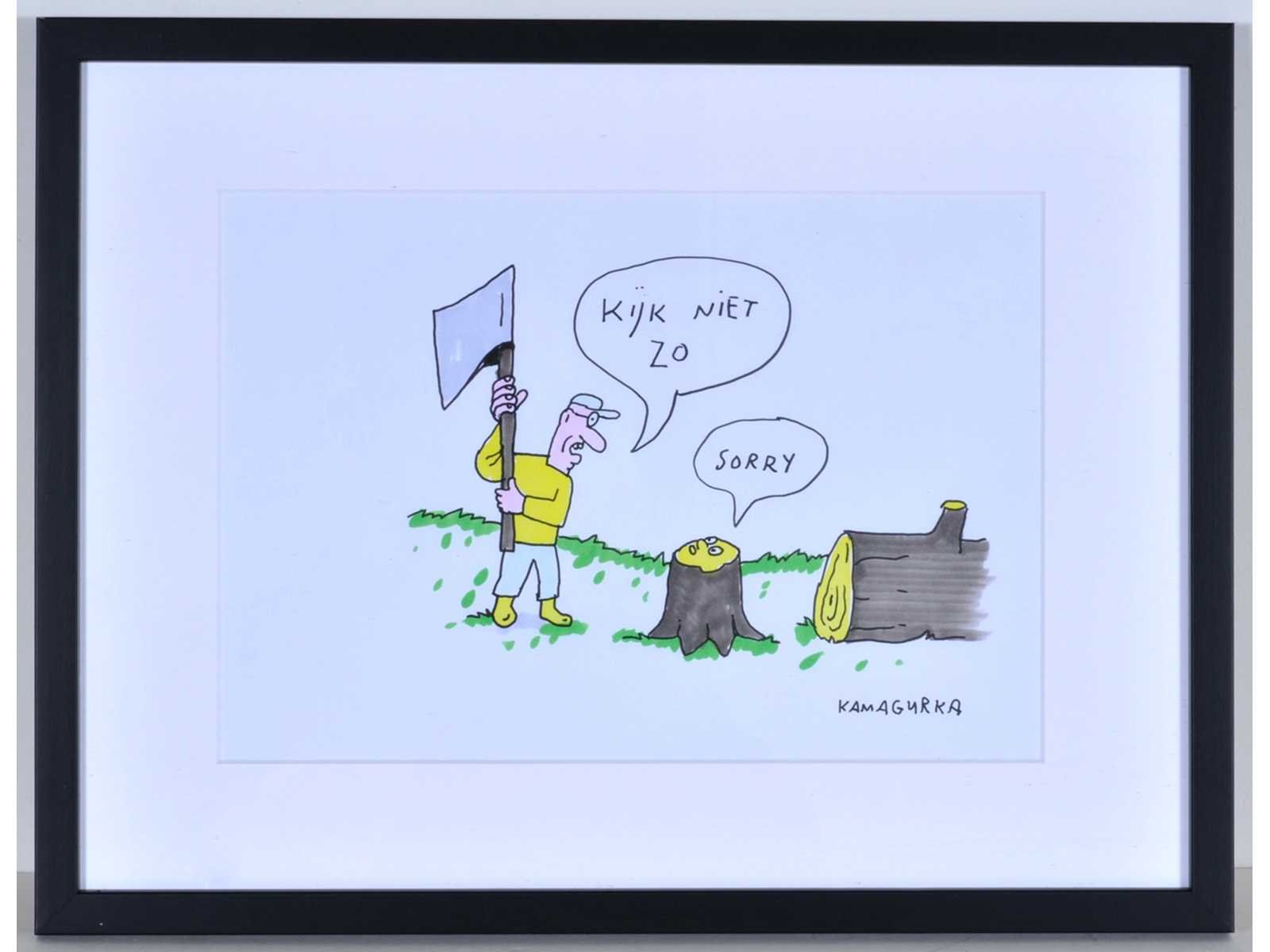 Originele cartoon van Kamagurka, ingelijst met psse-partout Nee Kunstenaar: Kamagurka (Nieuwpoort 1956) Titel van werk: Kijk niet zo Techniek: Inkt en kleurstift op papier Handtekening/oplage: true Gesigneerd: Gesigneerd Hoogte: 21cm Breedte: 29,5cm Hoogte incl. lijst: 32cm Breedte incl. lijst: 42cm Frame: true