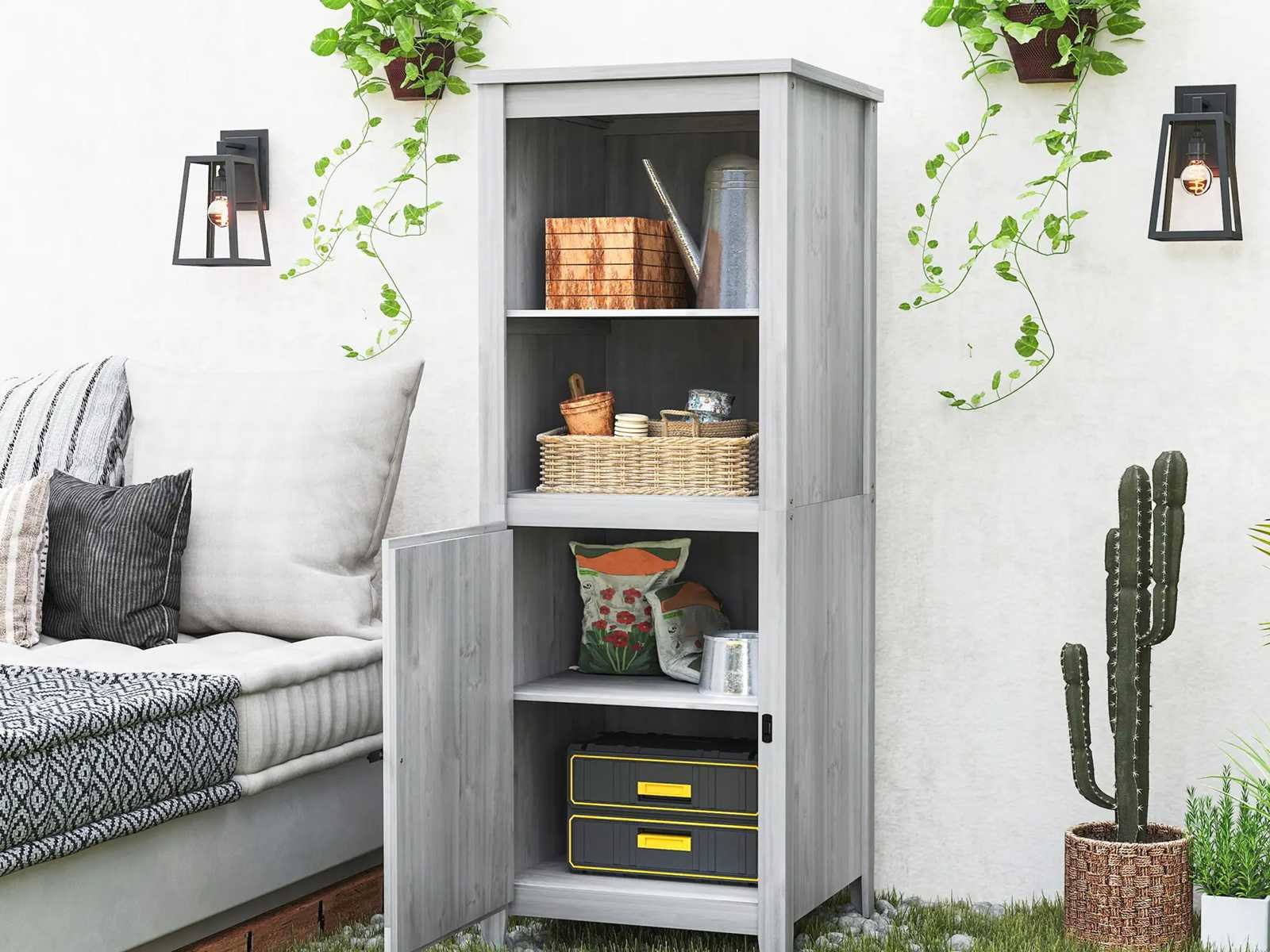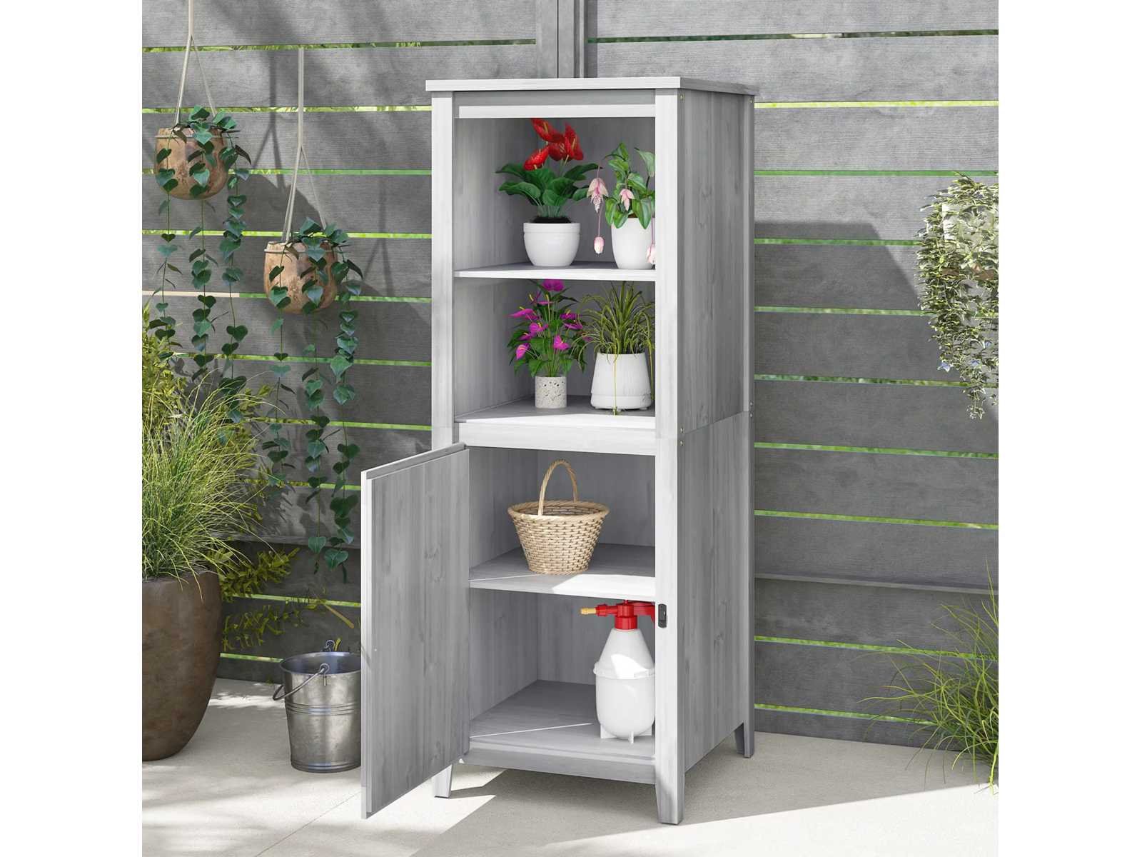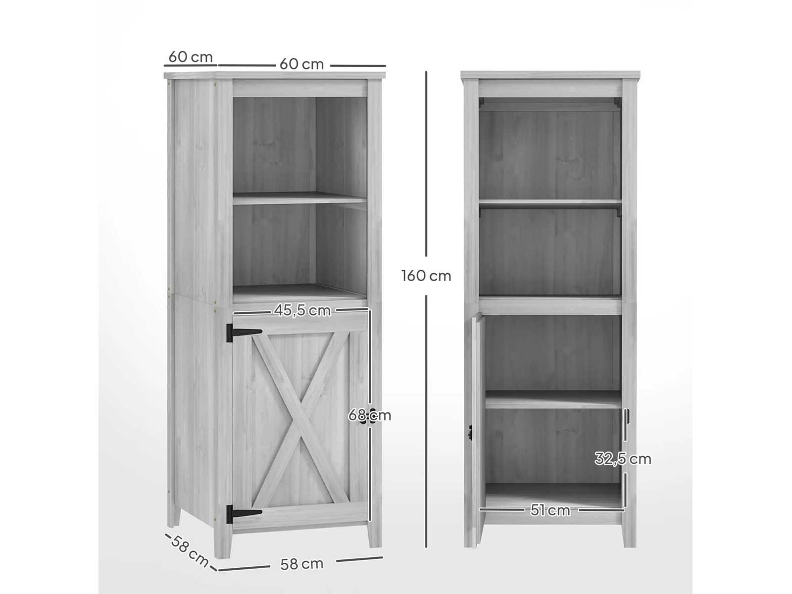 Specificaties: - Kleur: Lichtgrijs - Materiaal: Sparren - Totale afmetingen: 60L x 60B x 160H cm - Vloerafmetingen: 58B x 58D cm, 0,33 m² - Deurafmetingen: 45,5l x 68H cm - Plankgrootte: 51B x 53D cm - Laaghoogte: 32,5 cm - Maximale belasting: 25 kg (per plank) Non