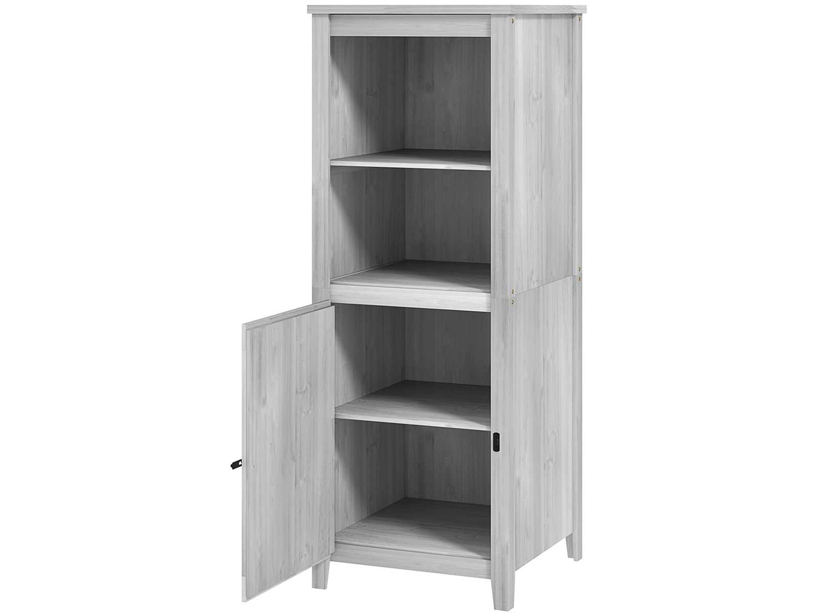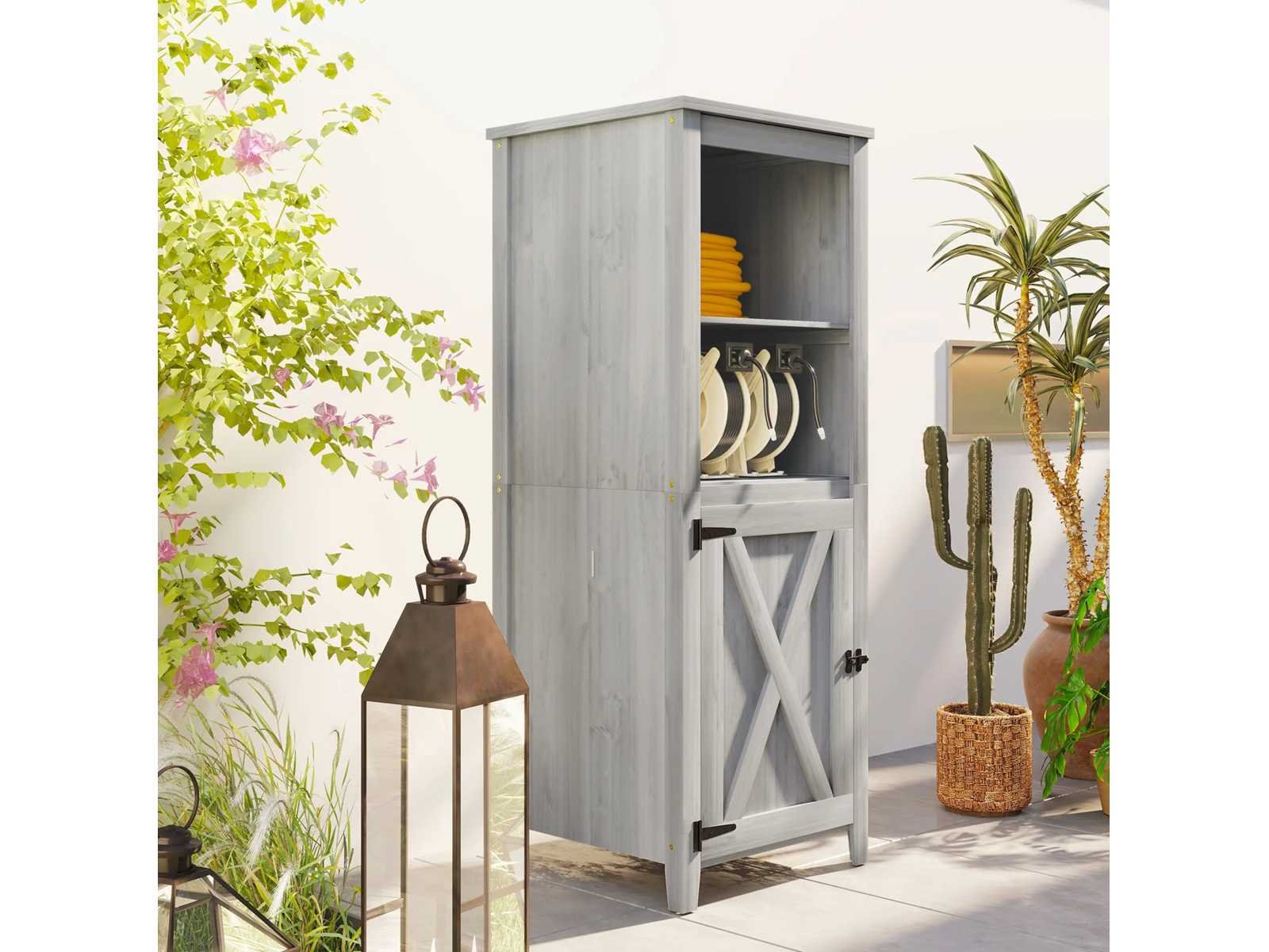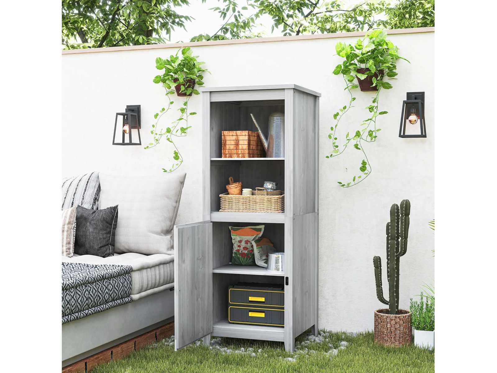 Specificaties: - Kleur: Lichtgrijs - Materiaal: Sparren - Totale afmetingen: 60L x 60B x 160H cm - Vloerafmetingen: 58B x 58D cm, 0,33 m² - Deurafmetingen: 45,5l x 68H cm - Plankgrootte: 51B x 53D cm - Laaghoogte: 32,5 cm - Maximale belasting: 25 kg (per plank) Non