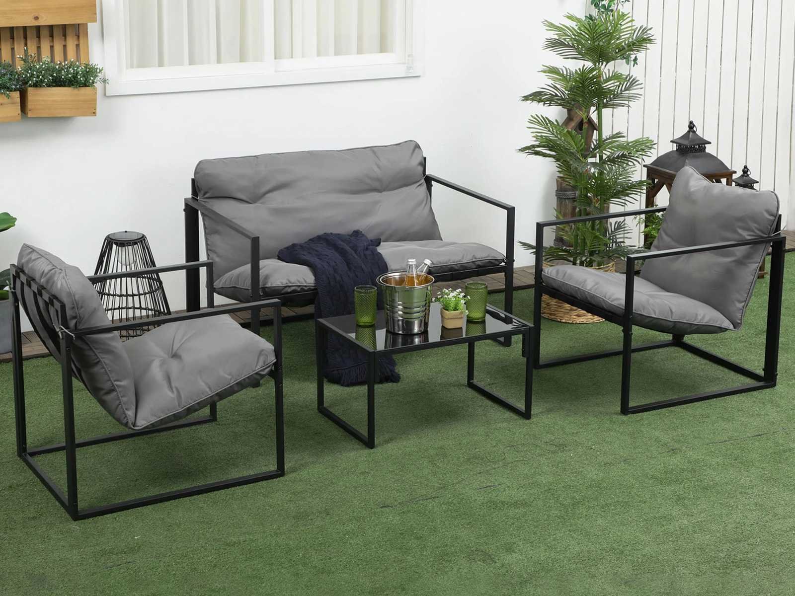 Tuinmeubilair, 4 kamers voor 4 personen met een 2-persoons bank, 2 fauteuils en 1 grijze salontafel