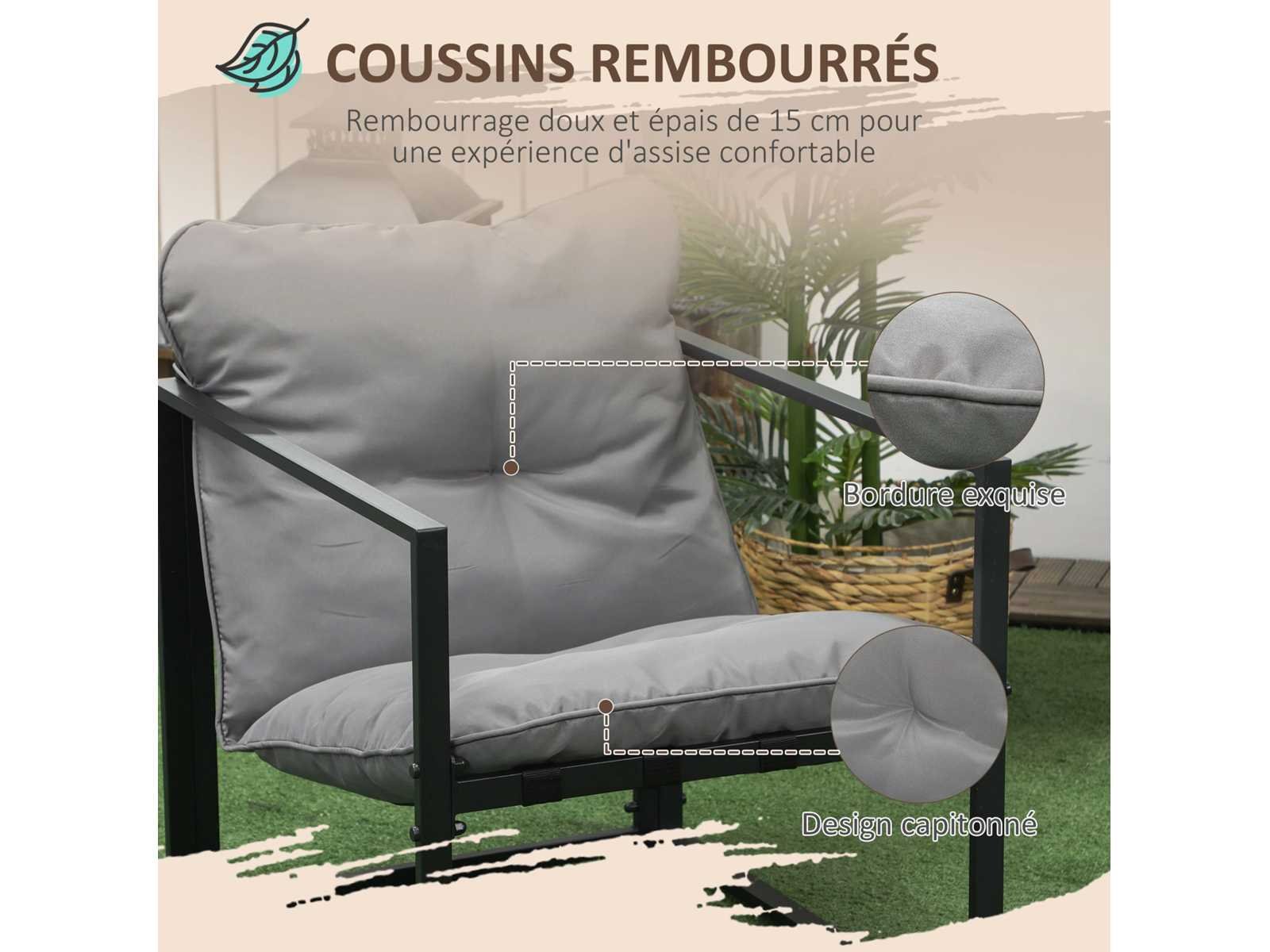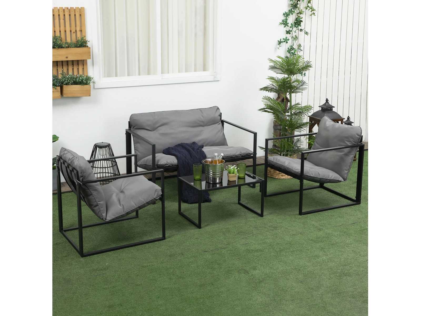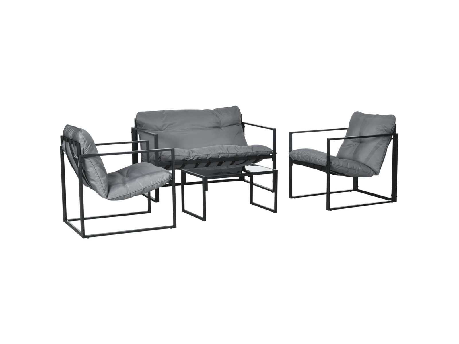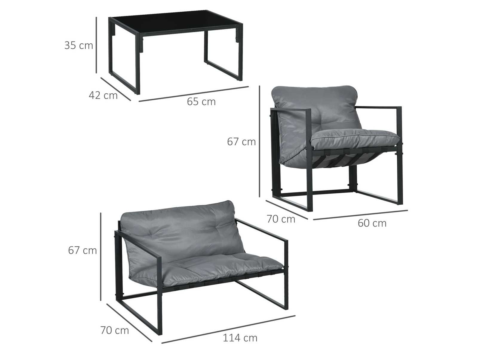 Specificaties: - Kleuren: grijs, zwart - Materialen: staal, polyester, PP-schuim -Zon. bank: 114B x 70D x 67H cm -Zon. fauteuil: 60B x 70D x 67H cm -Zon. tafel: 65L x 42B x 35H cm - Kussendikte: 15 cm - Aanbevolen maximale lading: 240 kg (bank), 120 kg (fauteuil), 30 kg (tafel) Non