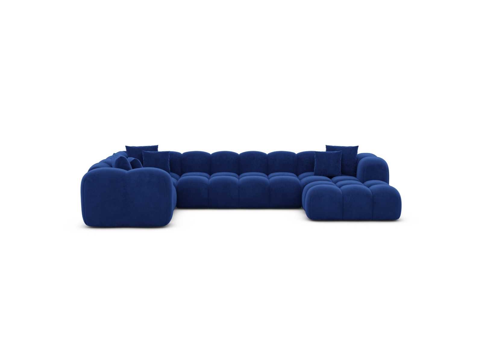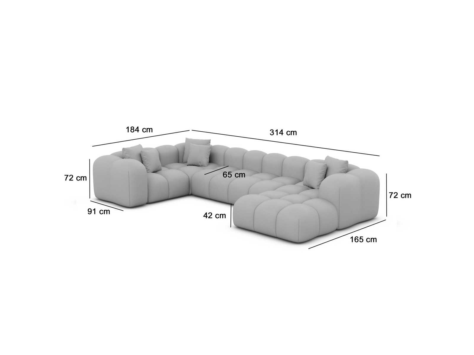 Lengte: 314 cm Breedte: 165 cm Hoogte: 72 cm Zithoogte: 42 cm Zitdiepte: 65 cm Materiaal Vulling: Schuimdichtheid 30 kg/m³ Structuur: FCS-gecertificeerd massief sparrenhout, spaanplaat, hoogdichte vezelplaat (MDF) Voeten: Plastic Laadcapaciteit Laadvermogen: 150 kg per element Non